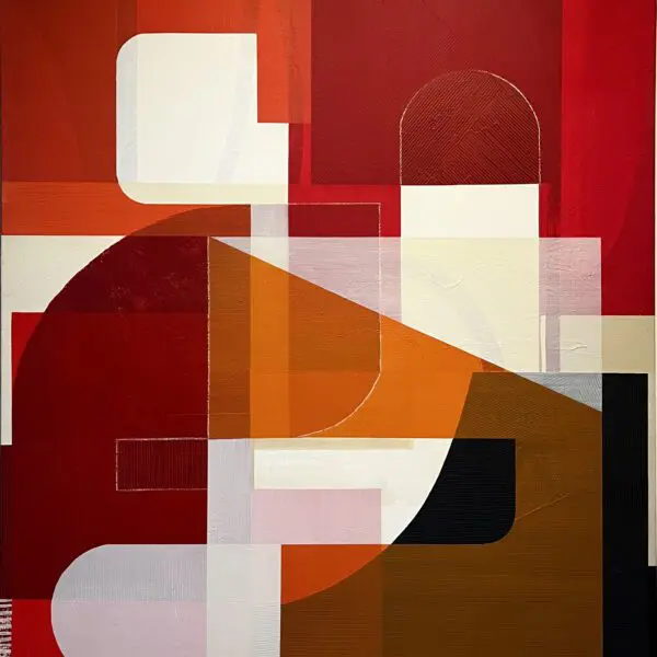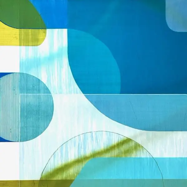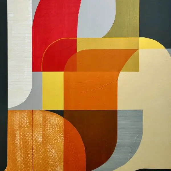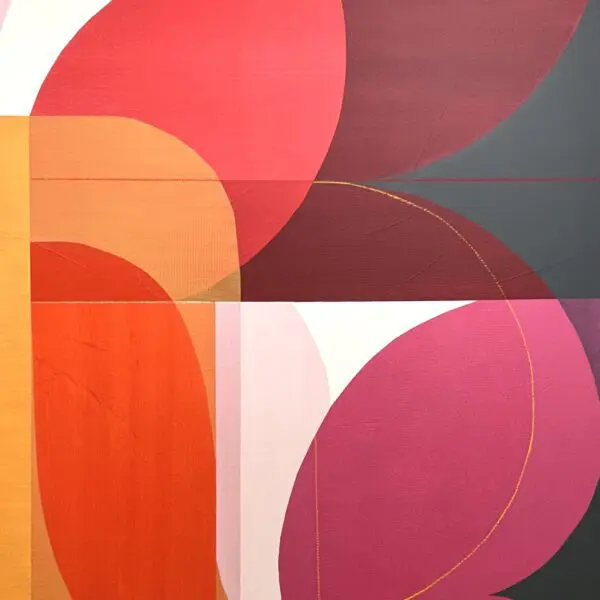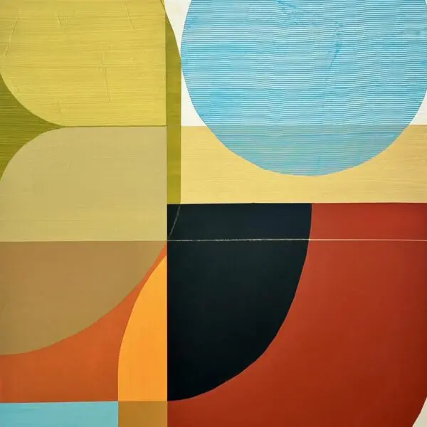 Strickfaden’s current body of work showcases dynamic interplay of various themes, including material exploration, abstract expression, color theory and collage techniques. Once the initial base is prepared, a minimalist underpainting is created, followed by an addition of a second layer of modern shapes. Crafted through spontaneous variations in color and form, these pieces are meticulously layered, unveiling textures, and thin subtle reveals of the underlying painting.