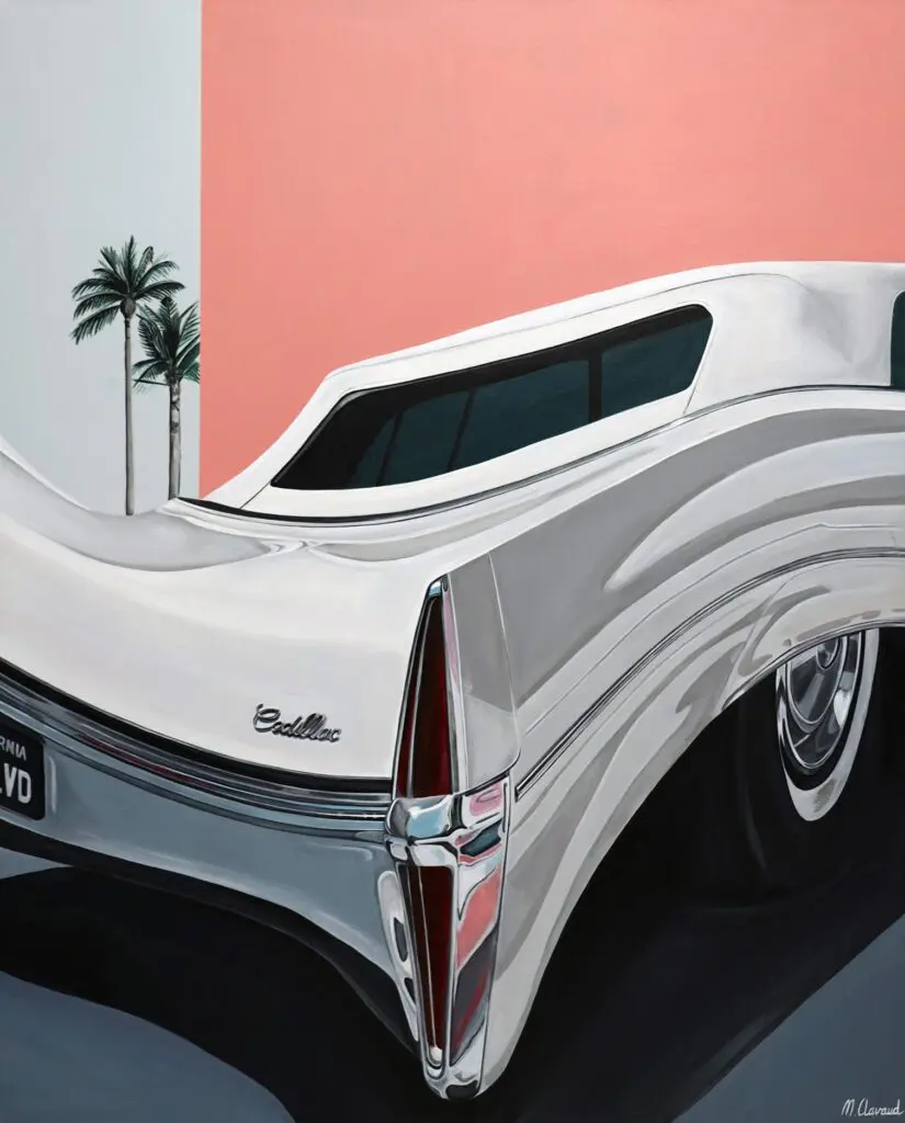 Their art reveals a fascination with detail and a passion for capturing the hidden beauty in everyday objects. By transforming mundane elements into poetic expressions, the artist invites viewers to reconsider the familiar, encouraging a dialogue between the ordinary and the extraordinary. This meticulous focus on detail is complemented by their varied subject matter, from California-inspired retro themes to the sleek elegance of vintage Cadillacs. Works such as Jungle Cadi immerse the viewer in an enigmatic atmosphere, juxtaposing the reflective body of a Cadillac with a dark, vegetal background, while Fluid Cadi reinterprets travel memories through surreal distortions that blur the line between dream and reality.
