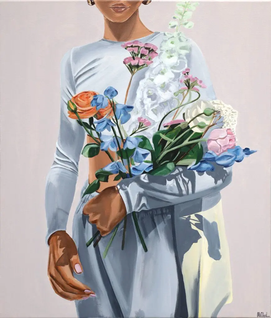 Their connection to figurative art is apparent in works like Street Bouquet, where a tightly framed composition centers on a woman holding a bouquet of flowers. By omitting facial details, the artist introduces a deliberate ambiguity that invites the viewer to project their own narratives onto the work. This emphasis on negative space and tight framing directs attention to specific elements, such as the texture of fabric or the play of light on skin, creating a profound intimacy within the composition.