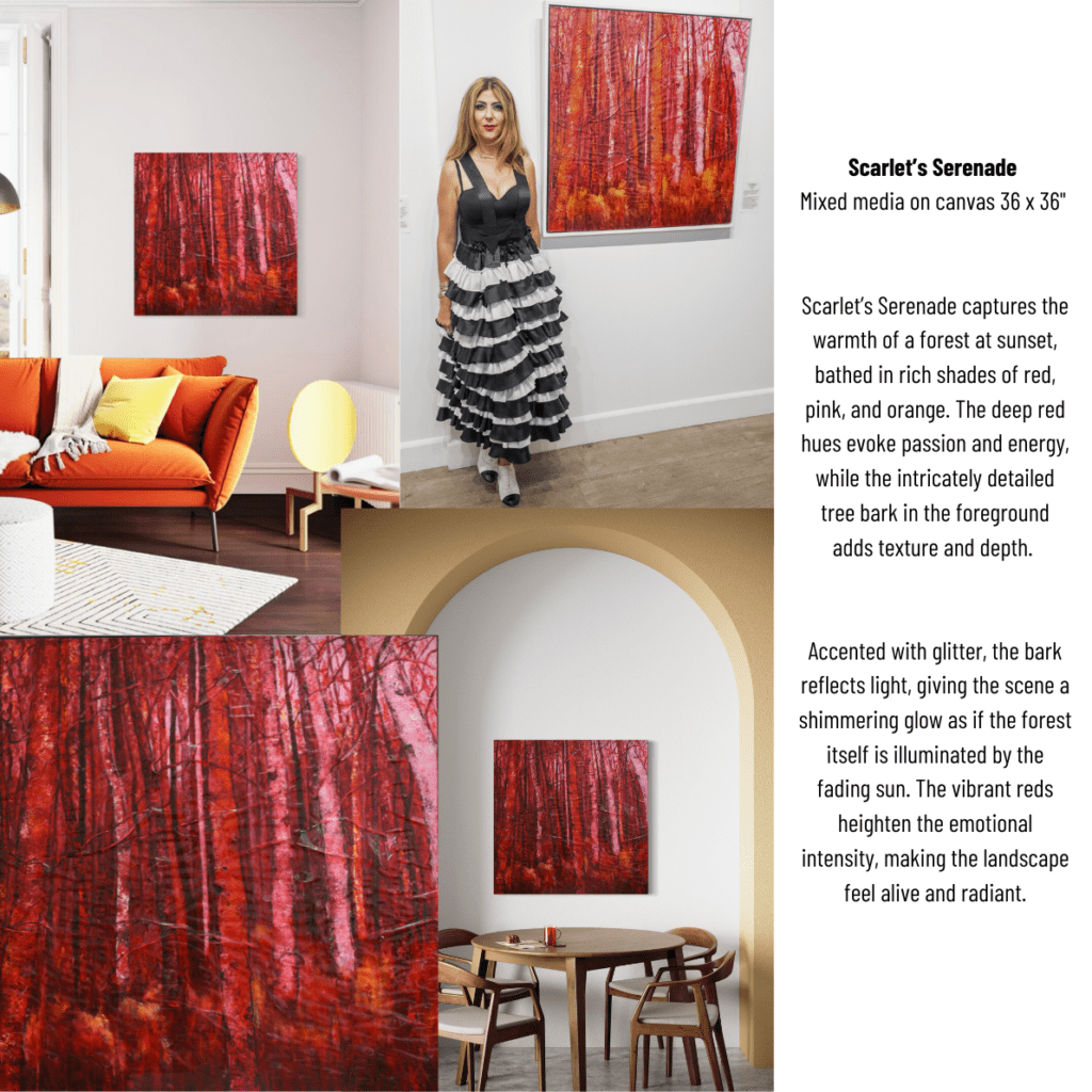 The lush glitter in Scarlet’s Serenade dazzles and compliments the domineering color red, which makes this artwork remarkably versatile.