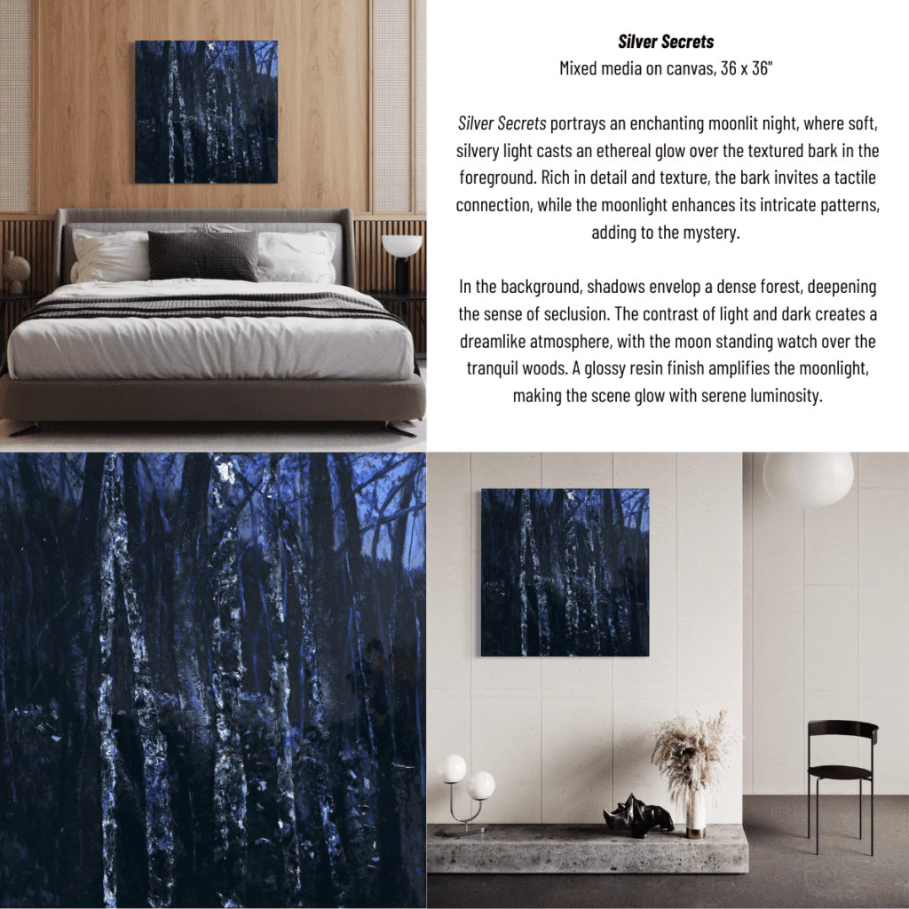 Silver Secrets evokes an enchanting nocturnal landscape with its strategic use of blue, where the delicate glow of moonlight cascades over the intricately textured bark in the foreground, inviting a tactile connection.