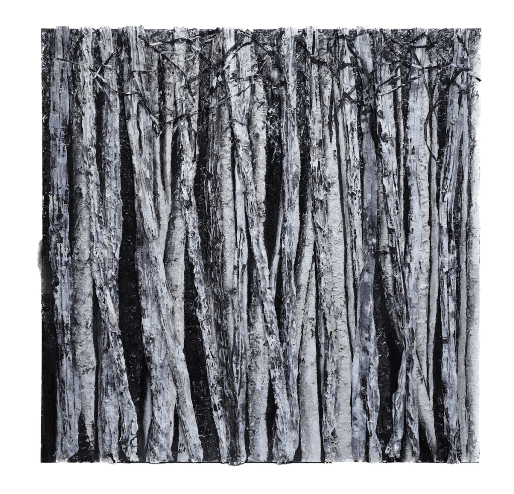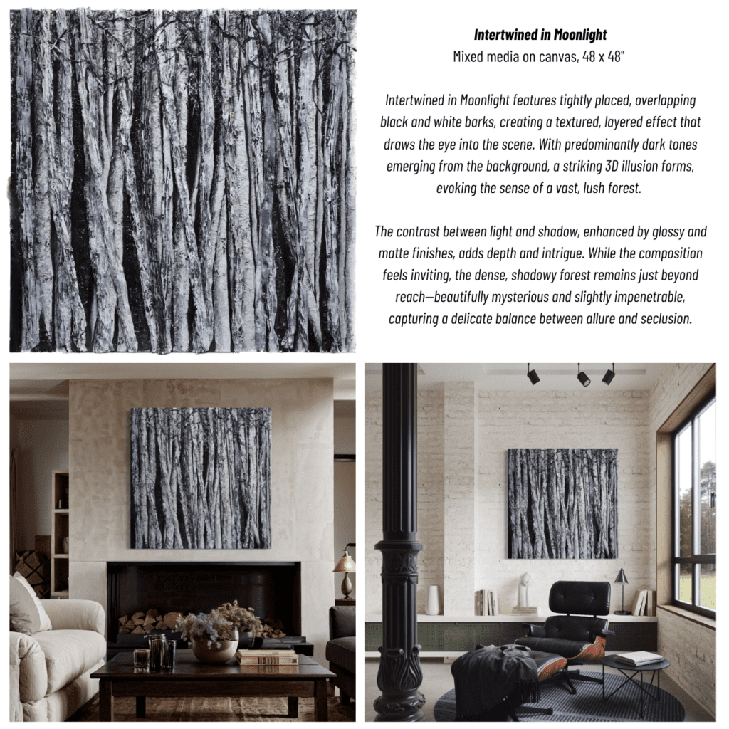 Intertwined In Moonlight showcases tightly arranged, overlapping black and white barks, generating a rich, layered texture that immediately pulls the viewer into the scene. Predominantly dark tones from the background create a striking 3D effect, evoking the impression of a vast, lush forest.