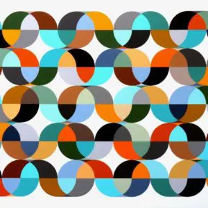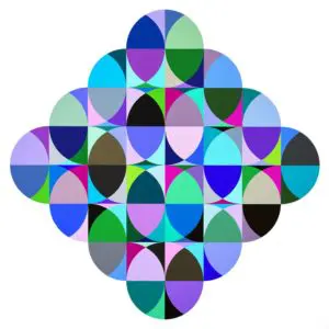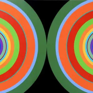 A. I begin with an initial idea, then draw multiple rough sketches until I am satisfied with the composition, one that is balanced and energetic, then draw up a final plan on graph paper with dimensions, and transfer it with pencil on a sanded canvas using straight edges and compasses. I apply varying widths of tape to mask areas in order to achieve a neat, hard edge. I then select my music, then paint intuitively with little pre-planning of color. The composition is the stable element and then I “risk all” and let my mind and music determine the colors which allow for many more varieties of color than a planned color scheme would allow. Since the eye can never figure out the color pattern, it keeps scanning and searching for a pattern, and then when the eye goes to the hard edge where two colors meet, halo effects form similar to what I have learned from studying the early pointillist painters. When the painting is complete, I apply multiple layers of varnish to create a smooth finish.