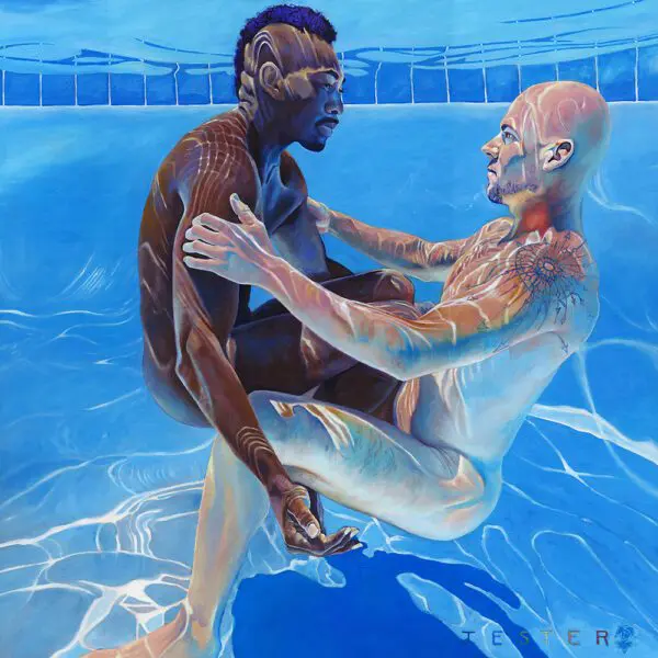 Born in Palm Springs, California, artist David Jester holds an MFA in Sculpture from Rutgers University. David Jester’s pool series of paintings is inspired by gay life online and in apps, exploring how individuals present and treat each other while celebrating the diversity and richness within the community. The pool symbolizes an isolated environment that is both separate from and connected to the larger world, with people inside and outside the pool holding distorted views of each other.