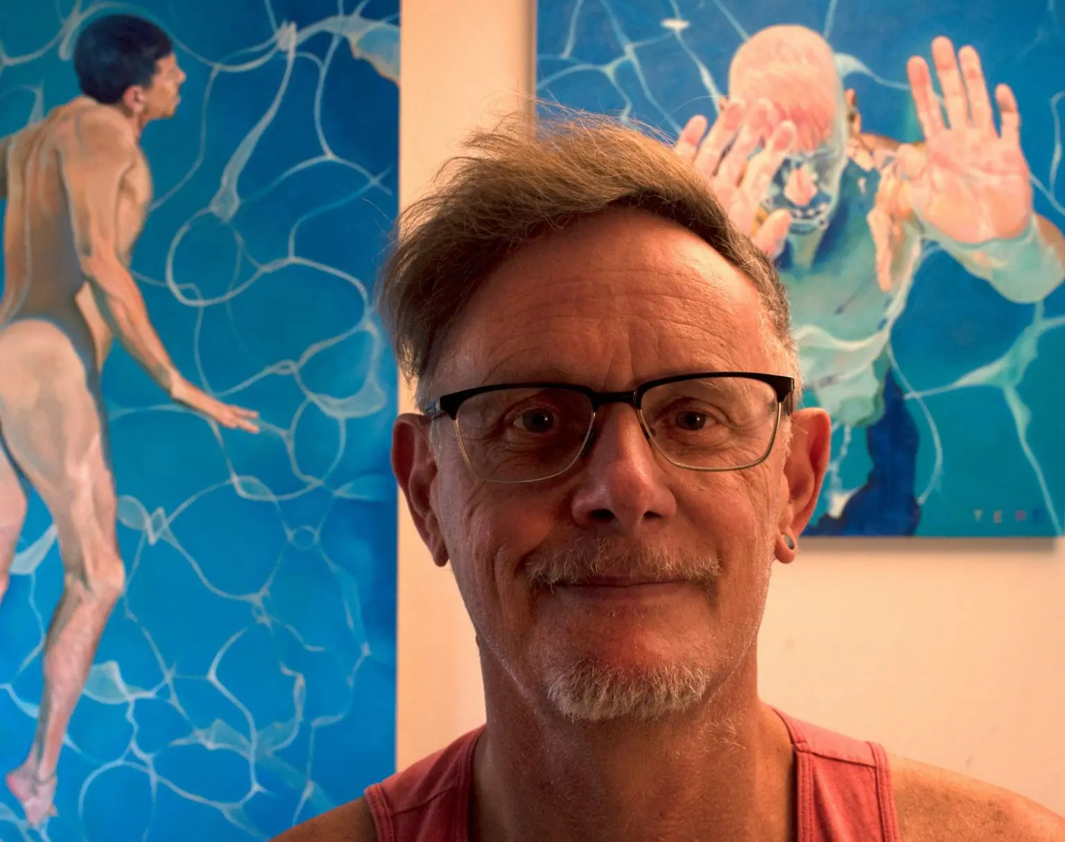Born in Palm Springs, California, artist David Jester holds an MFA in Sculpture from Rutgers University. David Jester’s pool series of paintings is inspired by gay life online and in apps, exploring how individuals present and treat each other while celebrating the diversity and richness within the community. The pool symbolizes an isolated environment that is both separate from and connected to the larger world, with people inside and outside the pool holding distorted views of each other.