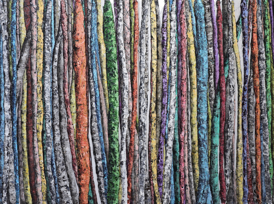 The Tree Series presents an intricate study of positive and negative space and the mystery of multitudes in minimalism. These canvases, often large-scale, have the effect of walking into a multicolored forest.