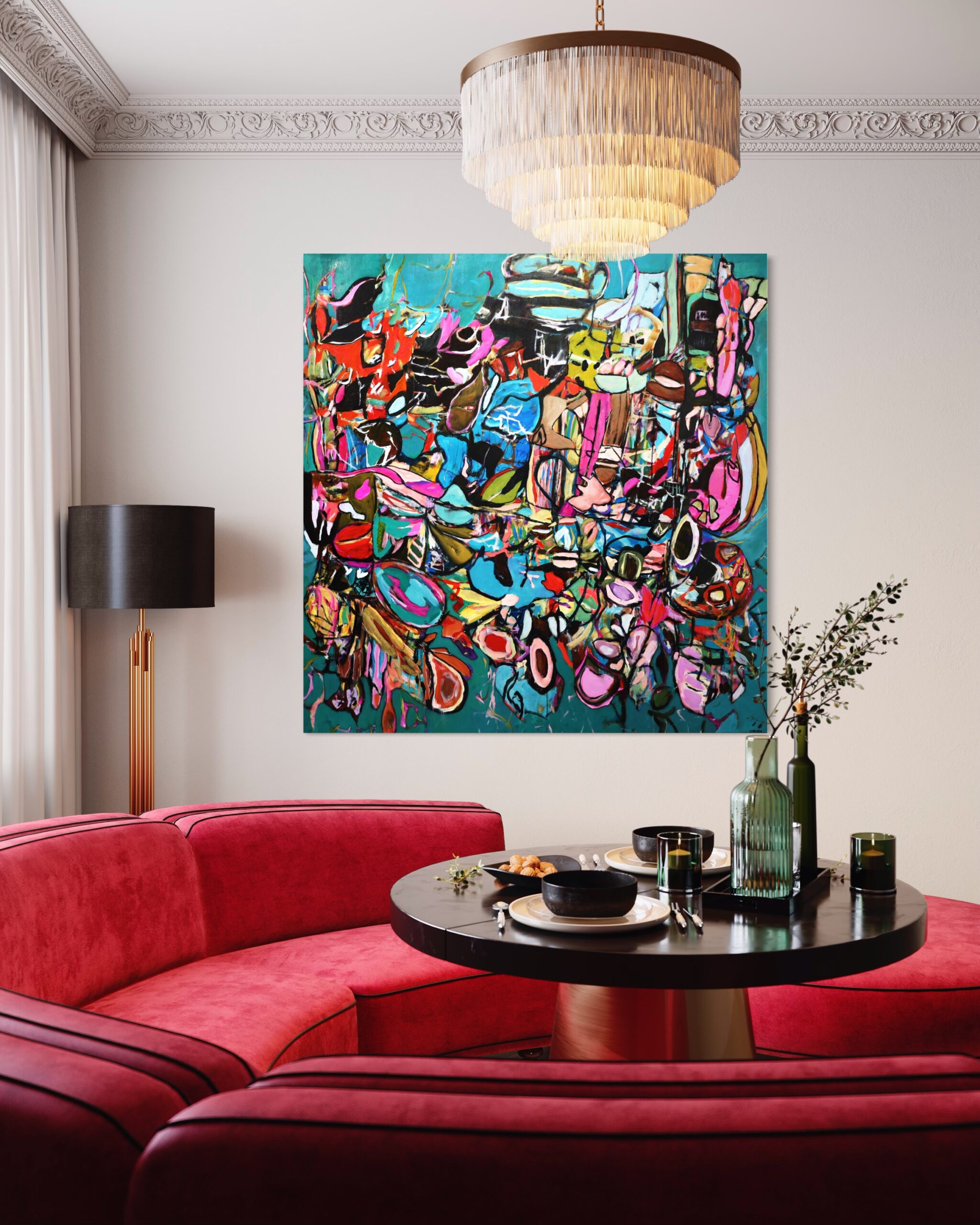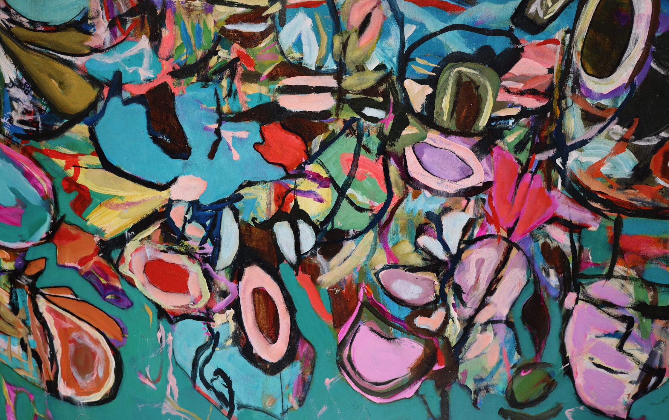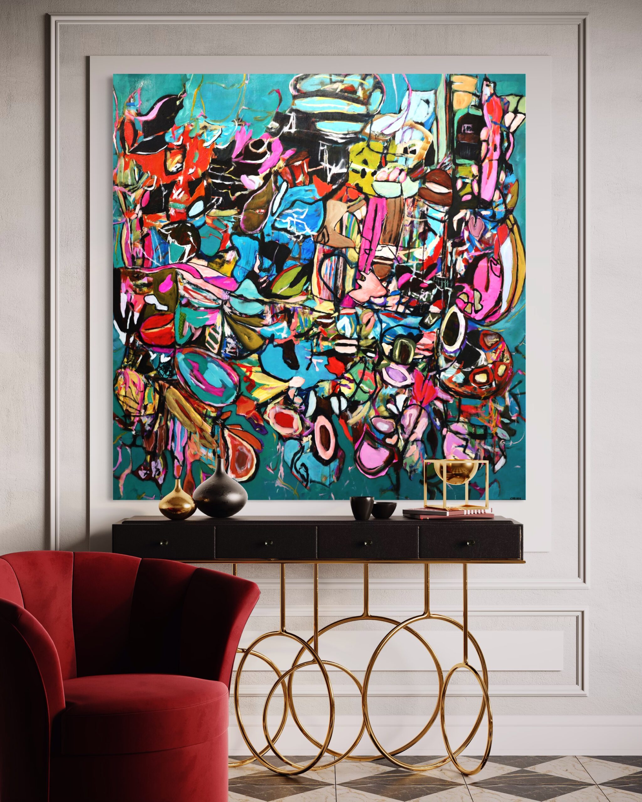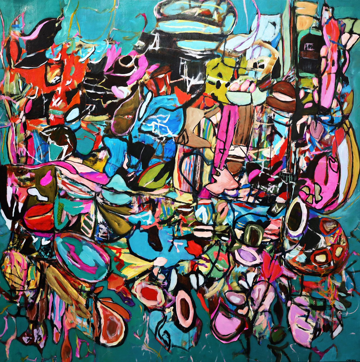 In the work entitled 1986, the observer is greeted by an abundance of intricately interwoven shapes, pulsating with vibrant blues, aquas, greens, fuchsia, and red hues, delineated by bold black or white brushstrokes. Each shape exudes an immediate presence, accentuated by a distinctive flattening effect produced by the outlined boundaries. The convergence of shapes and colors operates harmoniously, crafting a kind of narrative that imparts a compelling sense of simultaneity, as if all elements unfold within the same temporal frame—a convergence that transcends time.