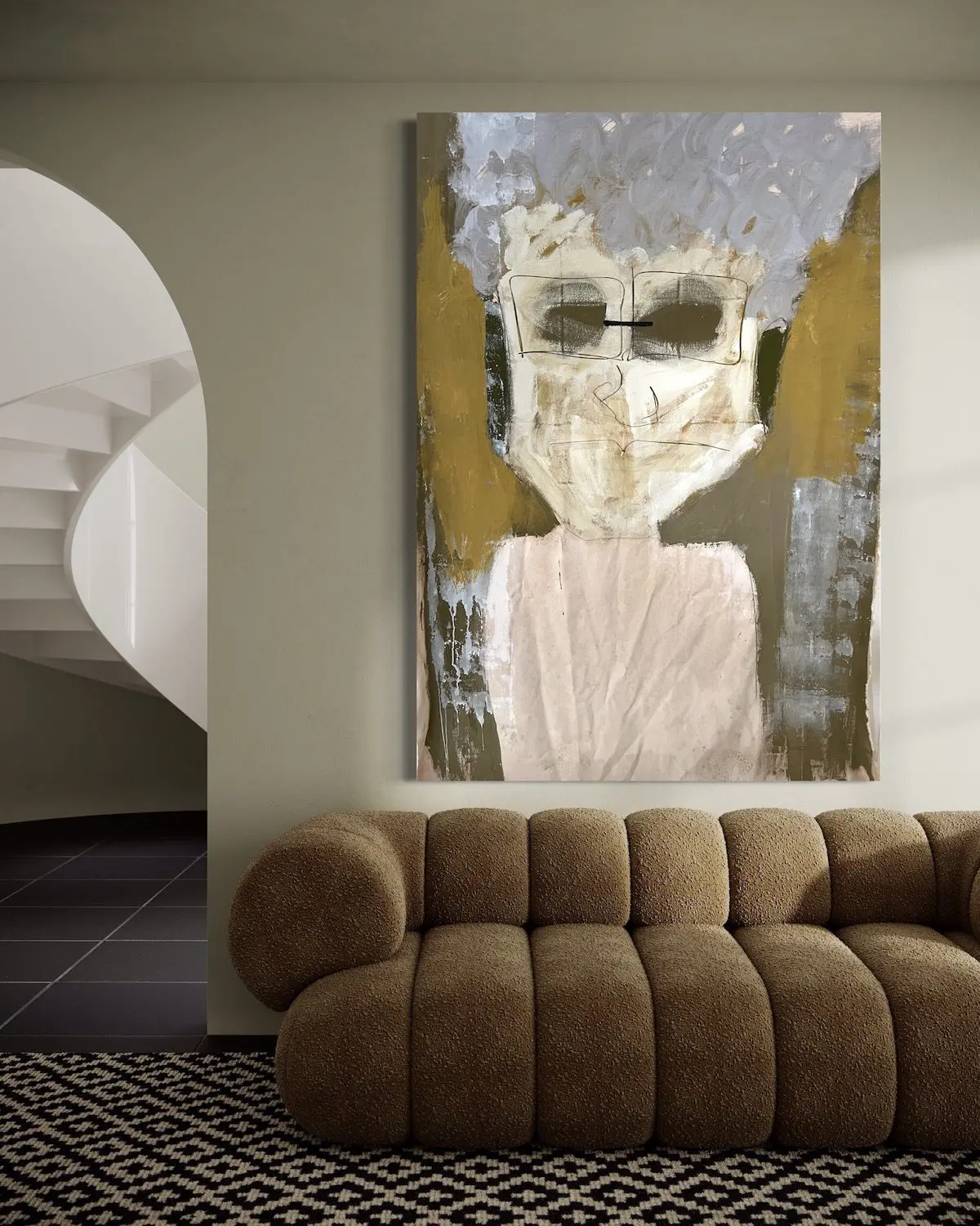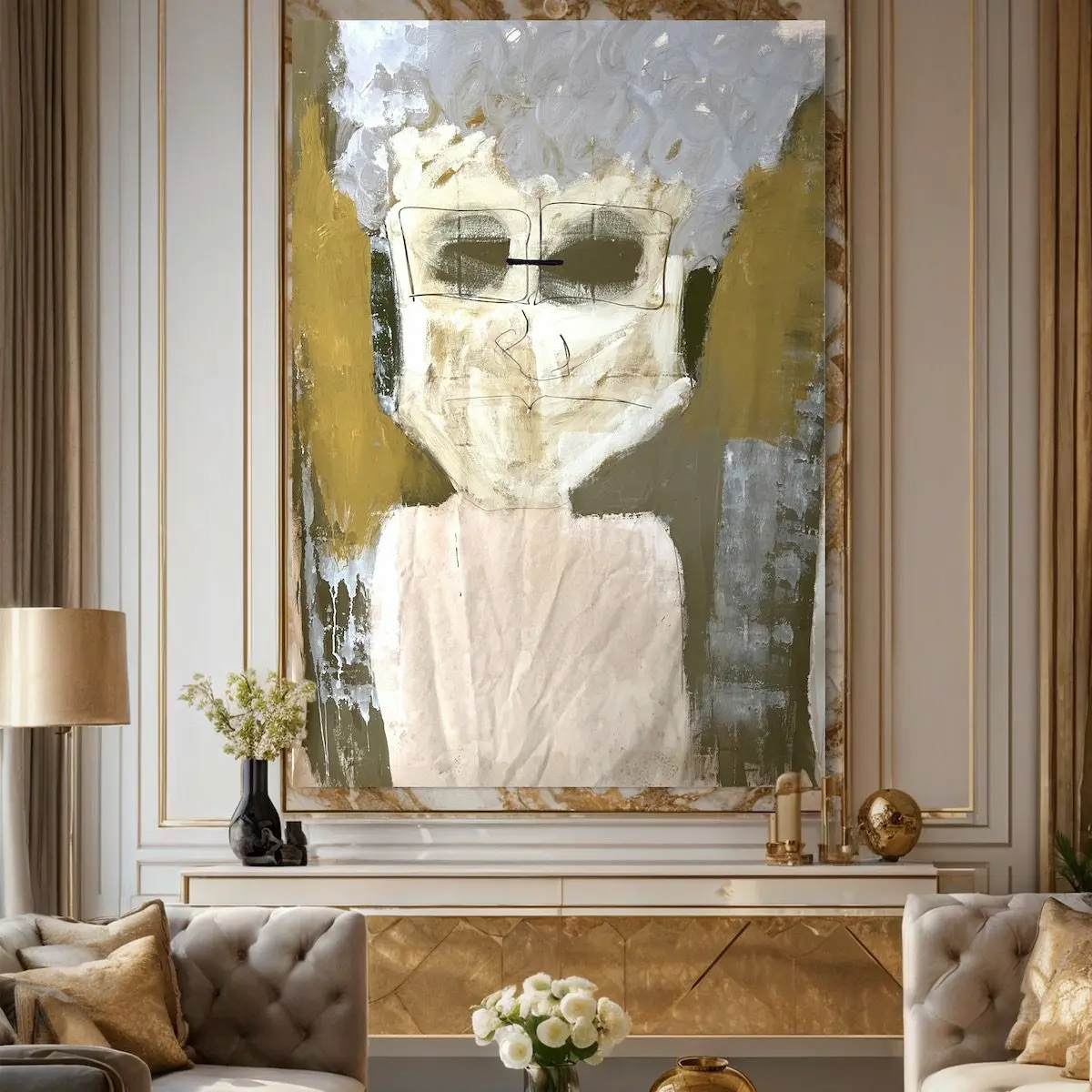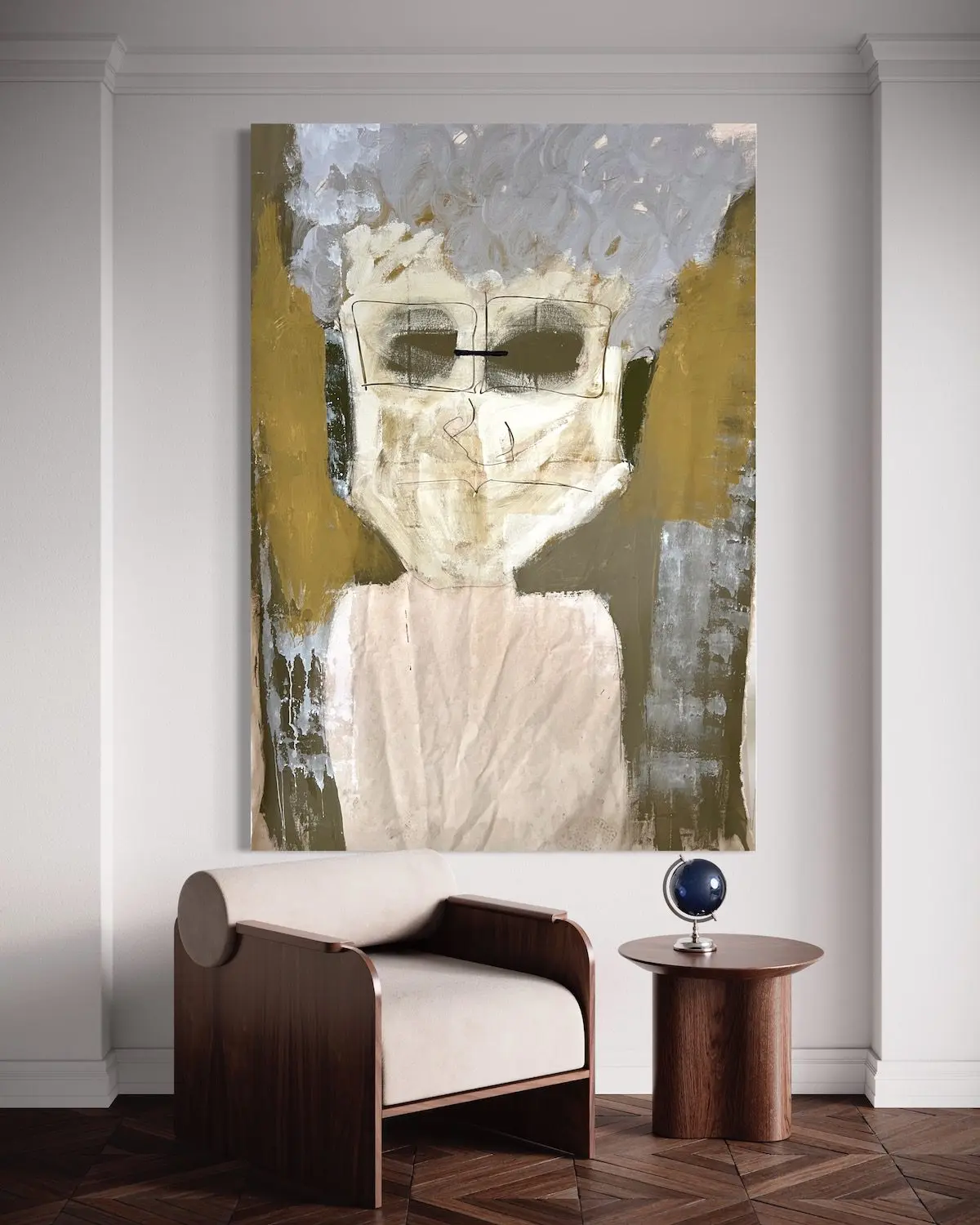 The painting “2300” by Martin Enricci presents a striking abstract figure composed with bold, minimalist strokes on a textured canvas. The central figure, which resembles a face, is rendered in a simplified style with large, dark glasses. Below the glasses, a suggested nose and mouth add a hint of human features to the otherwise obscure form. The figure’s head and shoulders are outlined against a background of muted earth tones—creams, grays, and golds—that contribute to the painting’s raw and unfinished aesthetic.