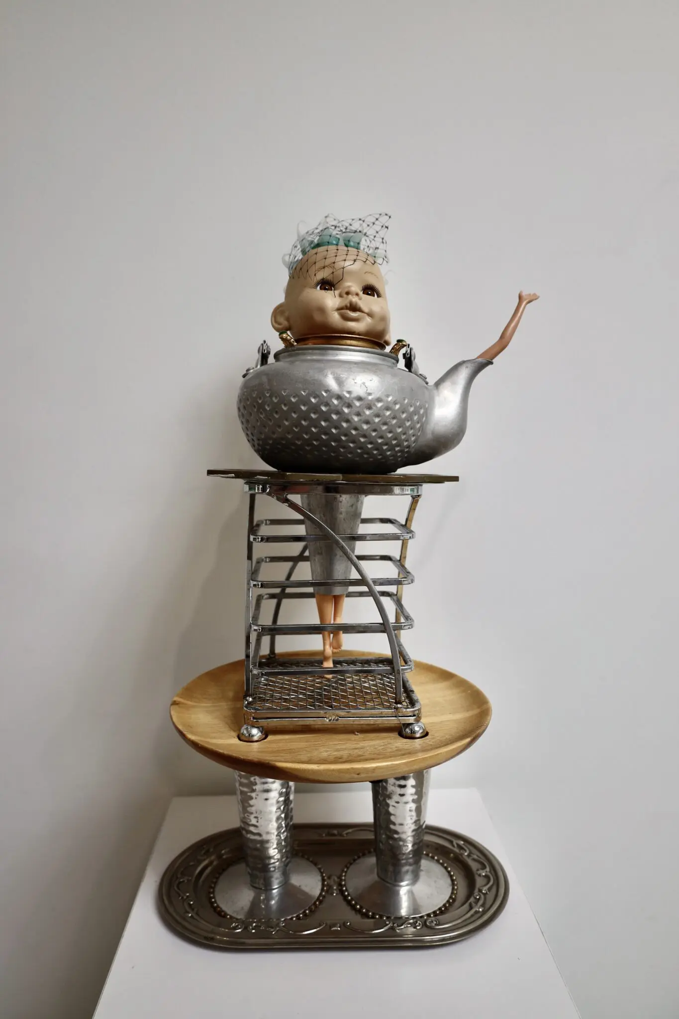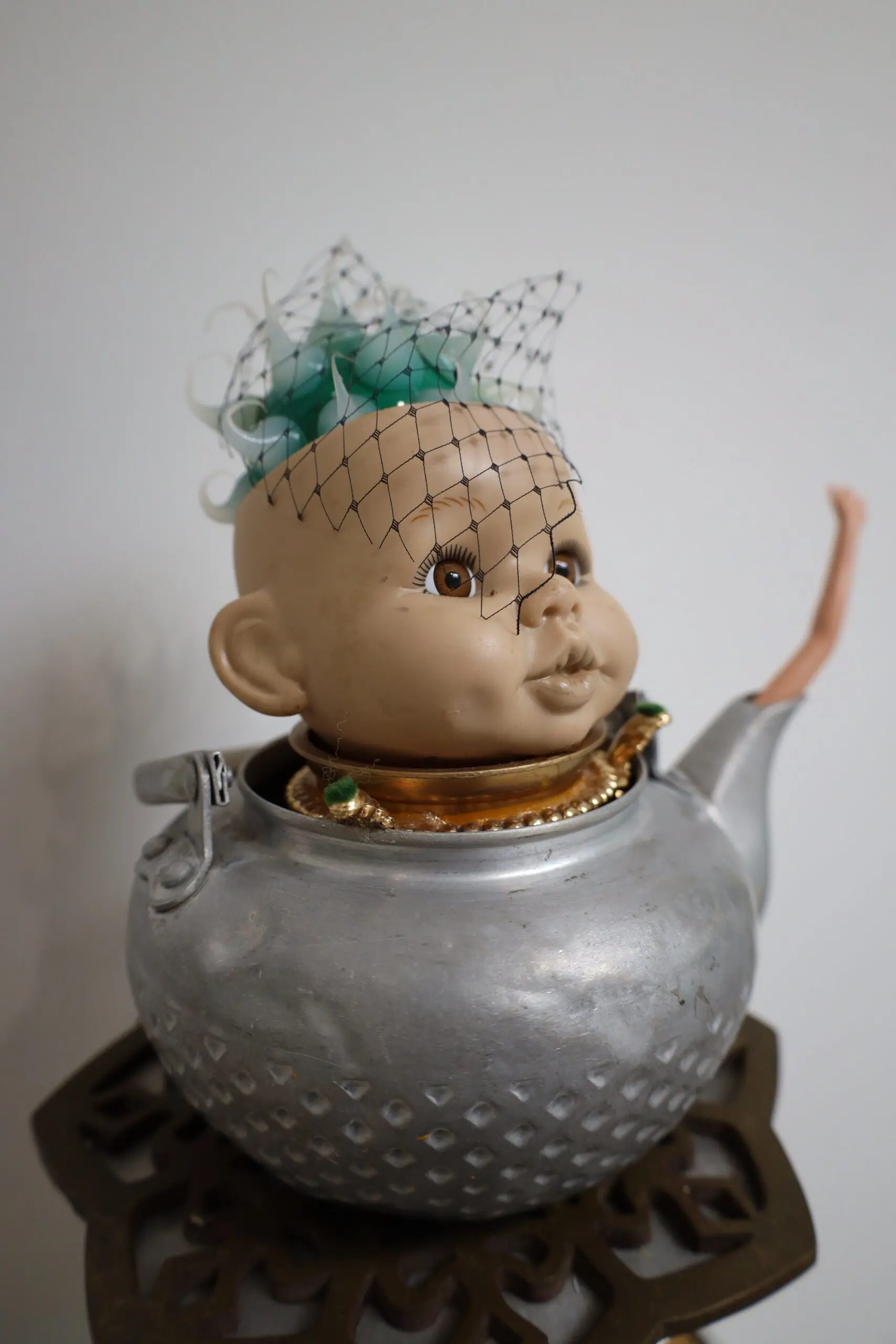 In her creative manipulation, Brooks has added a playful twist by incorporating the head of a doll sitting atop a teapot. It appears as if the doll is emerging from the teapot, with her arms playfully sticking out of the snout. This unique concept adds a sense of charm and intrigue to the artwork, reinventing the traditional tea-serving experience.