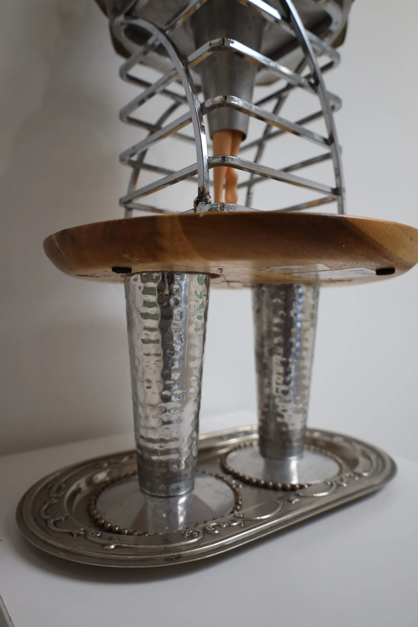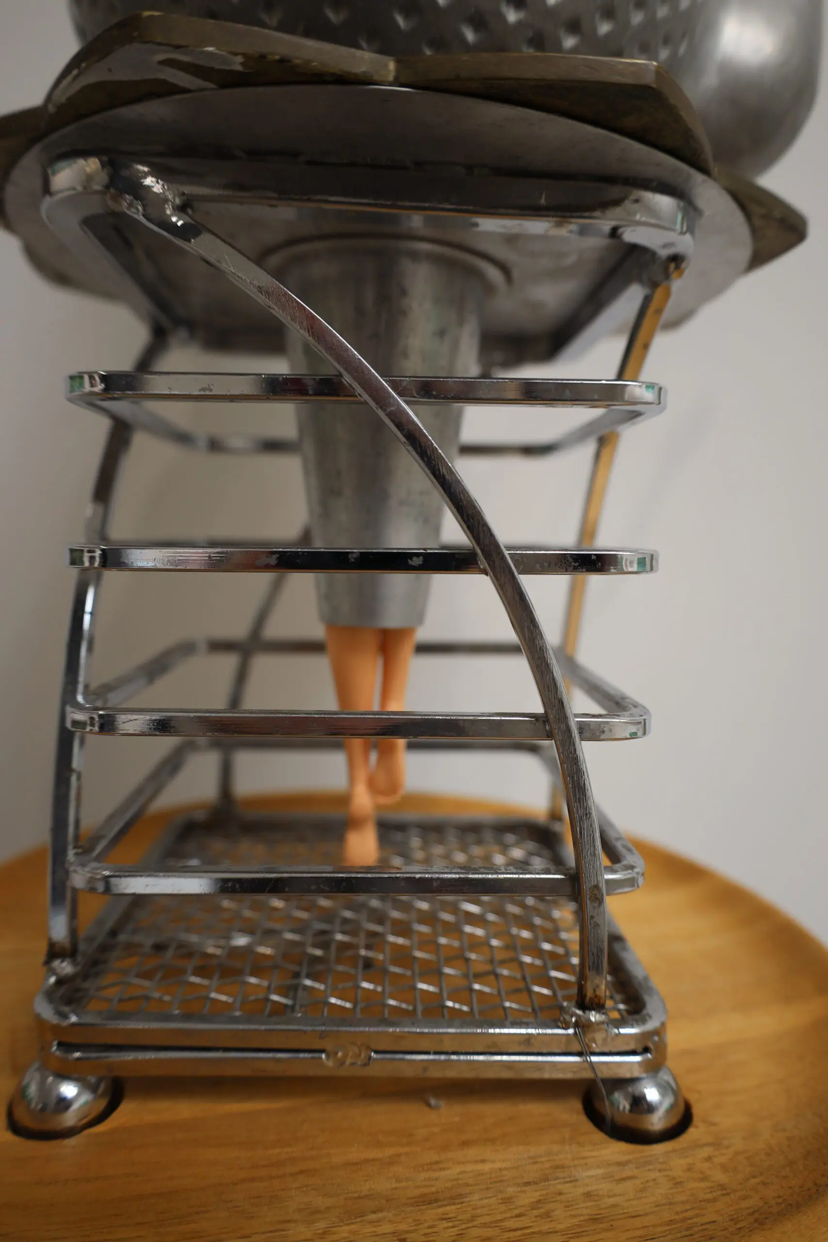The sculpture is further enhanced by the presence of multiple trays stacked together with an array of different kitchen items, assembled together in a harmonious and vintage-inspired manner.