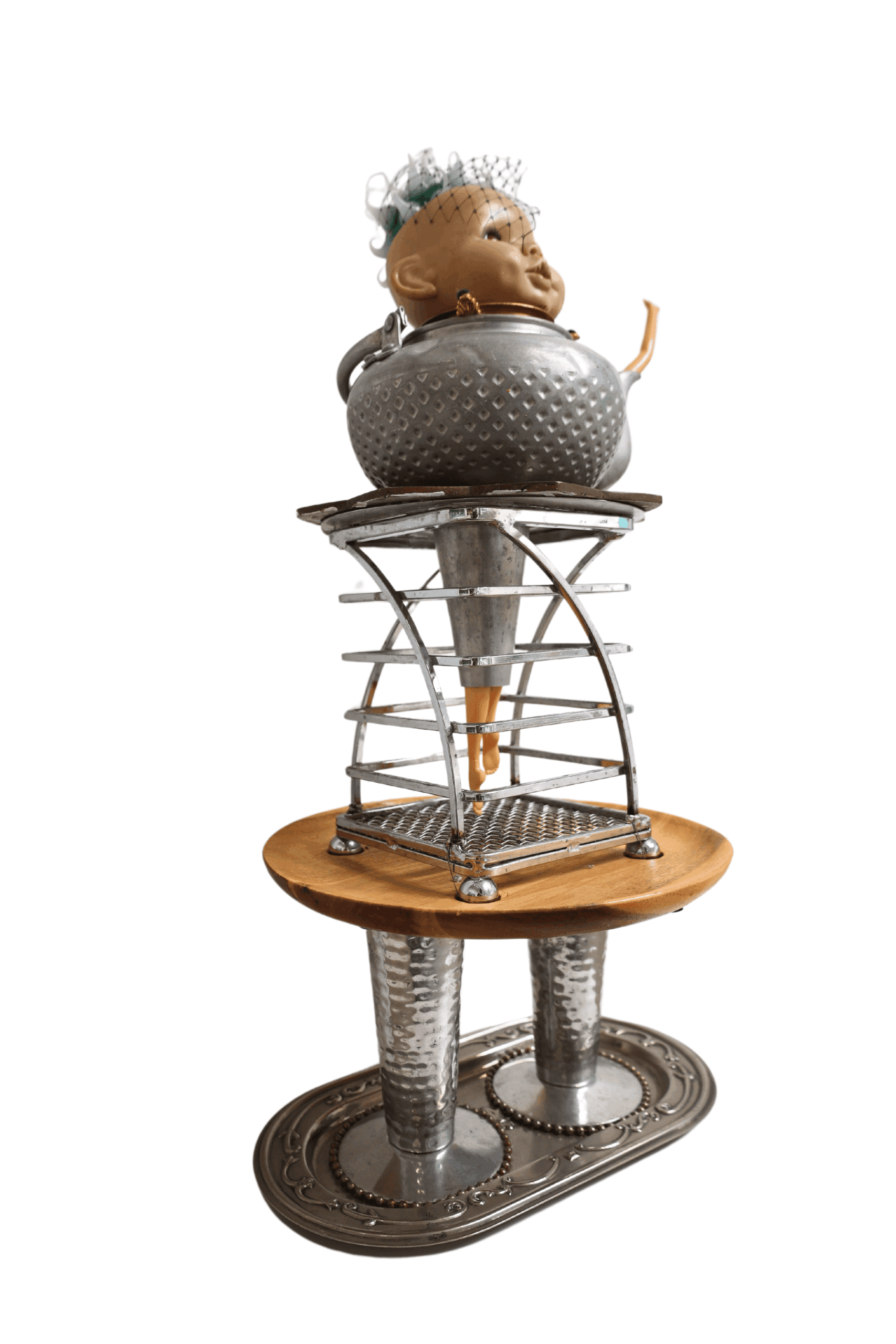 Sharon Brooks, the imaginative creator of the mixed media assemblage sculpture “Too Much Tea,” describes it as a whimsical and delightful artwork. The centerpiece of this piece is a silver tray, cleverly supported by pounded silver cones that securely hold a wooden plate in place through drilled holes. This arrangement not only provides stability but also adds a touch of resilience to the sculpture.