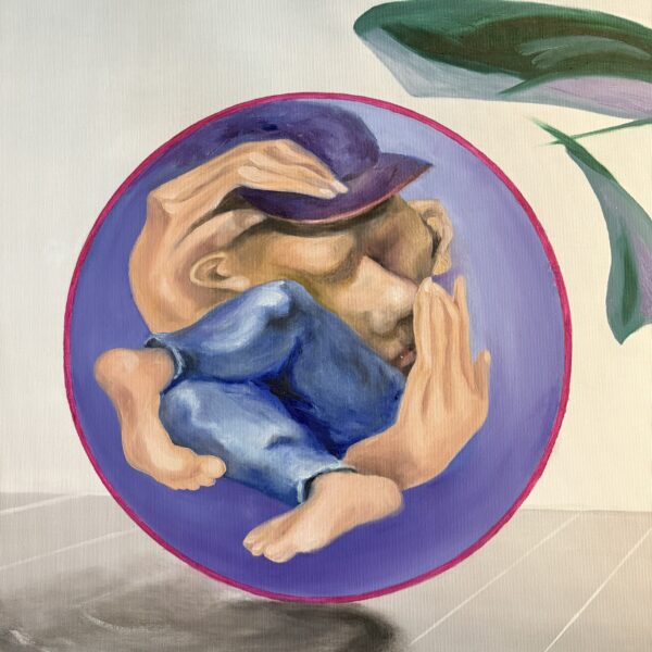 At the core of the piece, two floating spheres encapsulate fragmented human figures—one holding a contemplative figure wearing a hat, limbs entwined in introspection, while the other contains a distorted face obscured by hands, its features melting into fluid, organic shapes. These encapsulated forms suggest solitude, self-reflection, and the duality of identity, existing as isolated yet interconnected realms within the same surreal space.