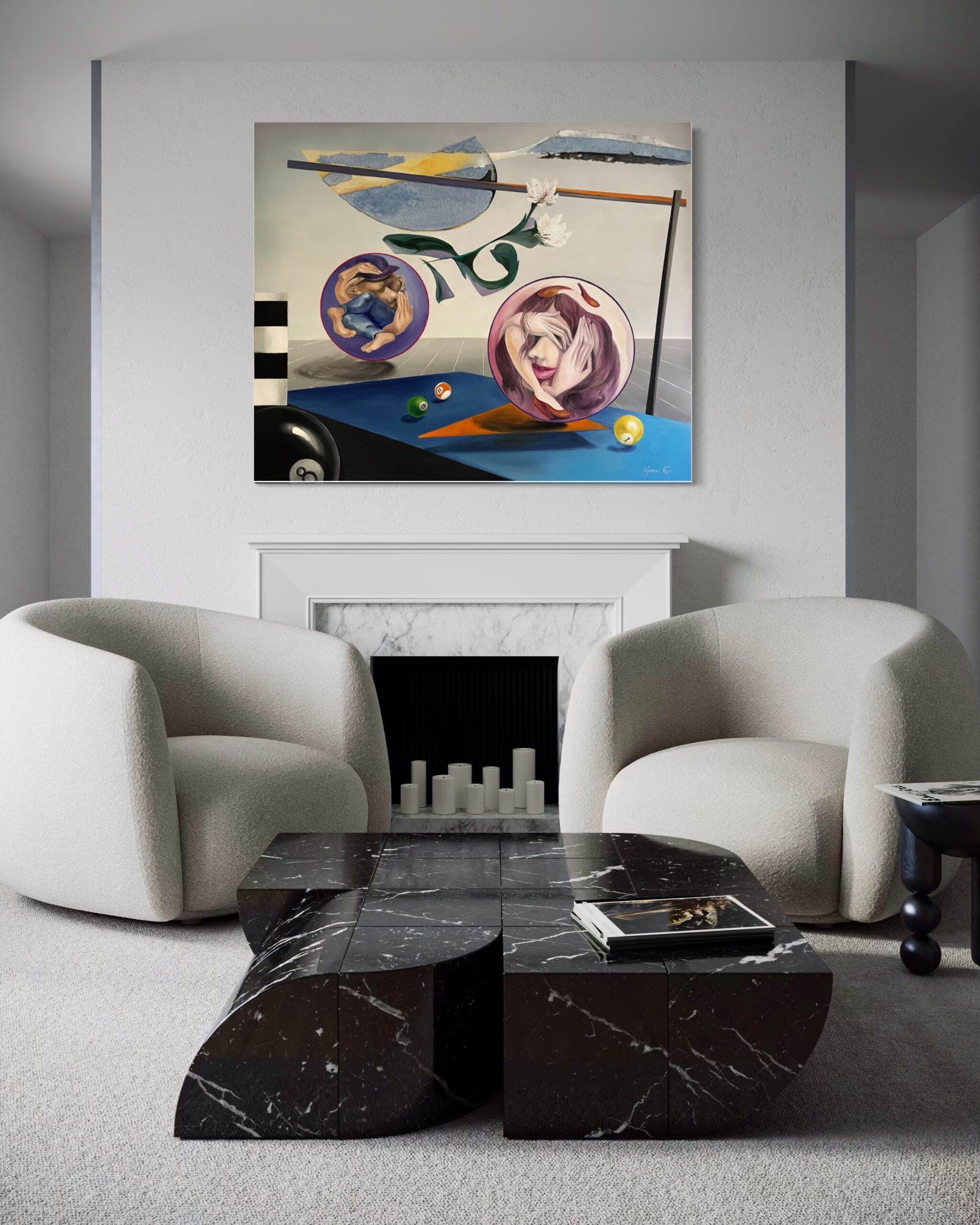 A scattered billiard table in the foreground, punctuated by the presence of an ominous black 8-ball, introduces themes of chance, fate, and life’s unpredictable trajectory. Above, a suspended flower blossoms from a geometric structure, evoking notions of fleeting beauty, transformation, and the passage of time. The fractured sky, composed of abstracted blue and yellow brushstrokes, intensifies the sense of displacement and dreamlike suspension.