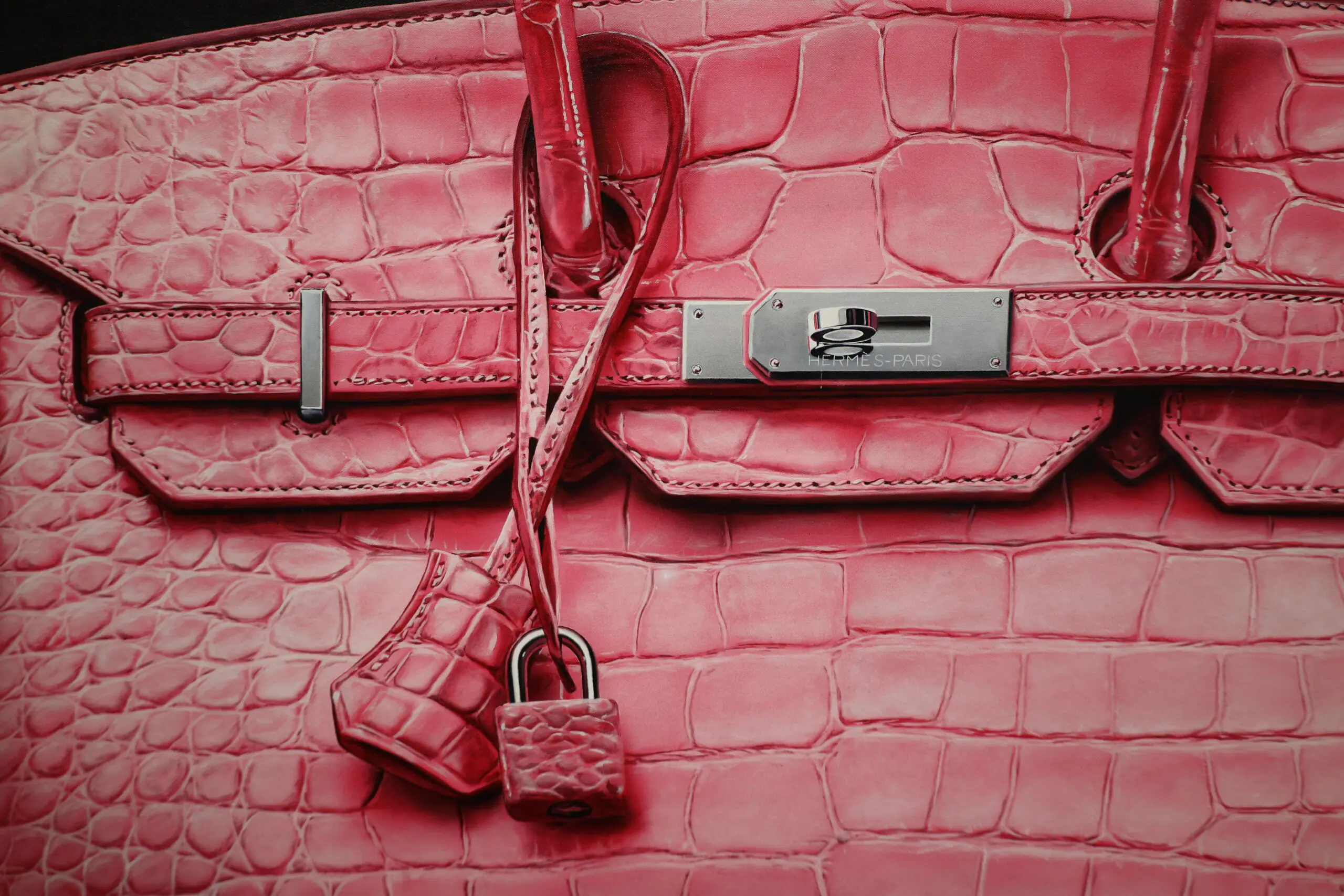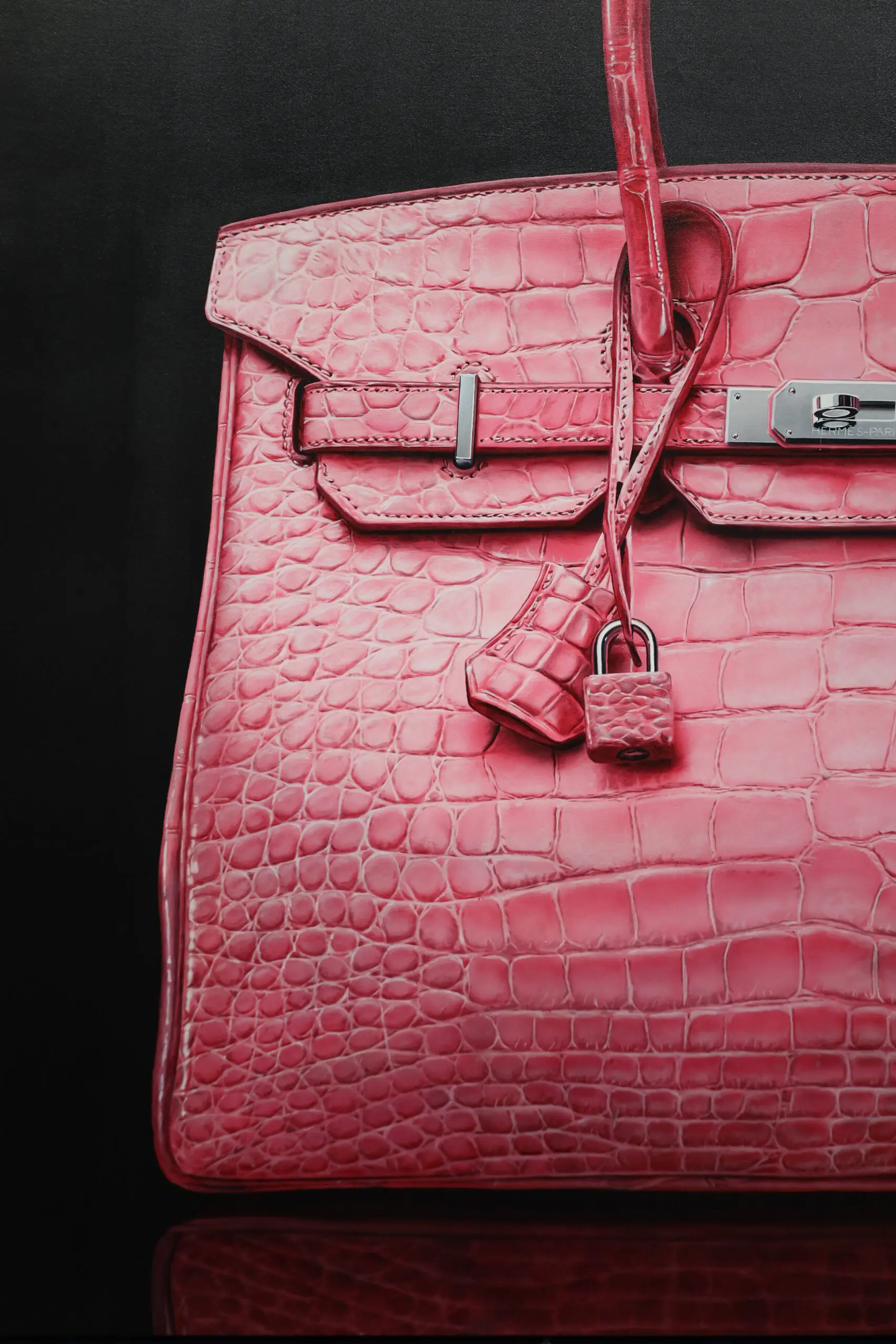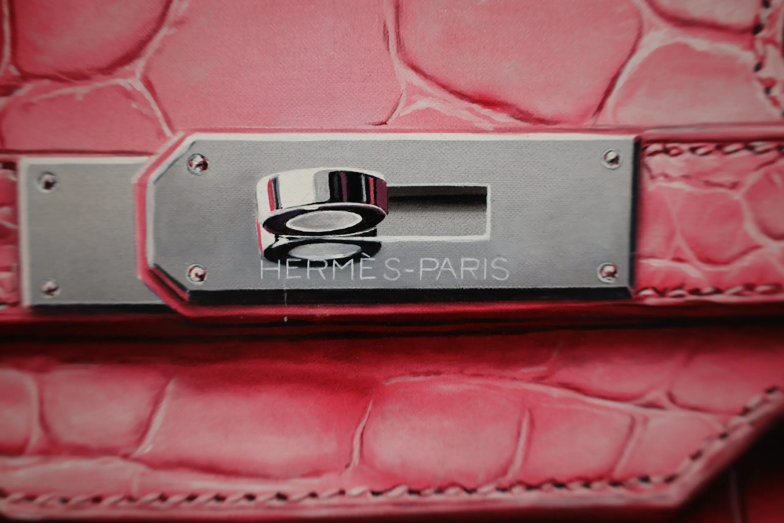 Every curve, stitch, and crease is meticulously captured, showcasing the intricate craftsmanship of the Hermès bag. The choice of crocodile leather in hot pink adds a bold and vibrant element, further highlighting the bag’s exclusivity and allure.