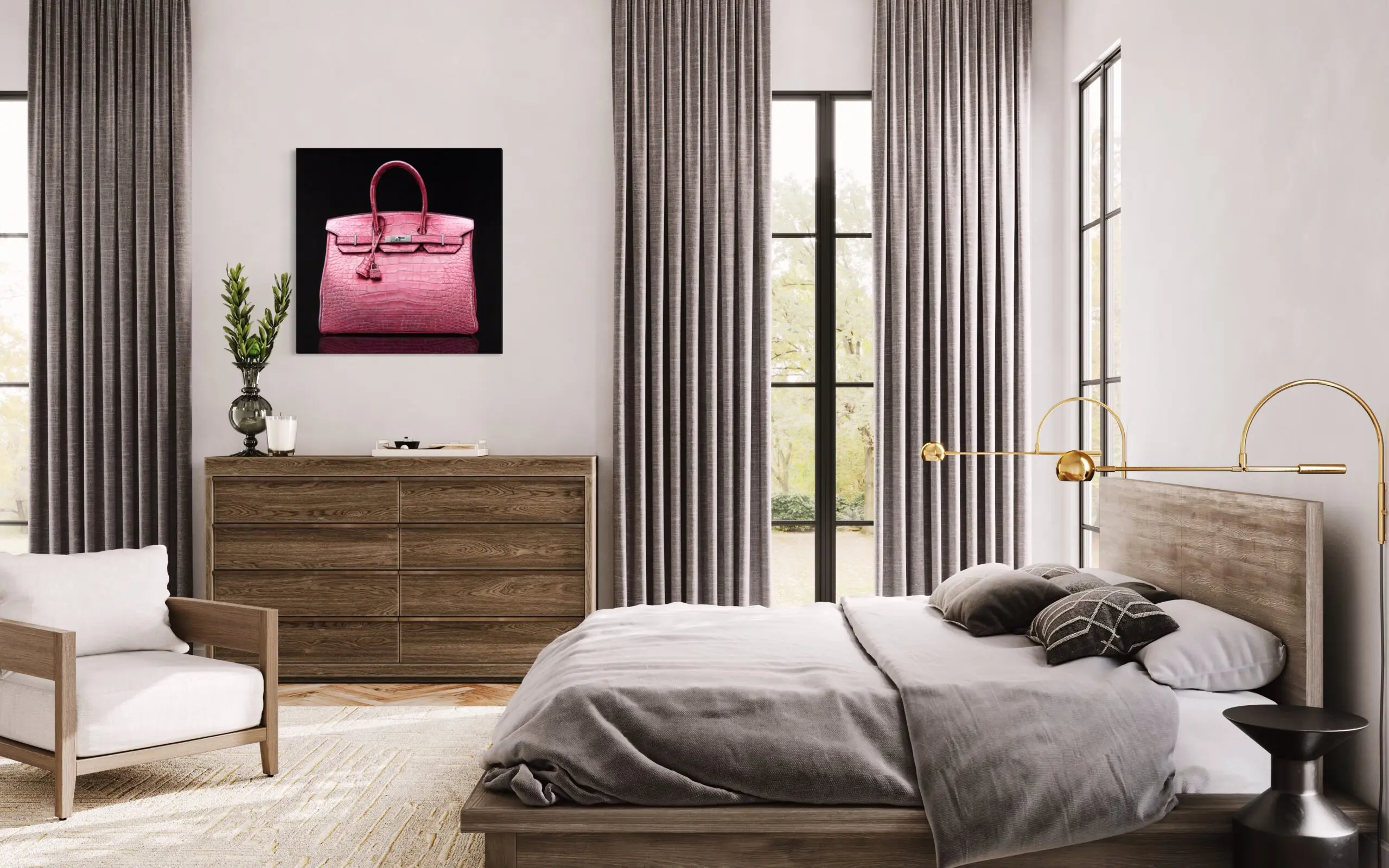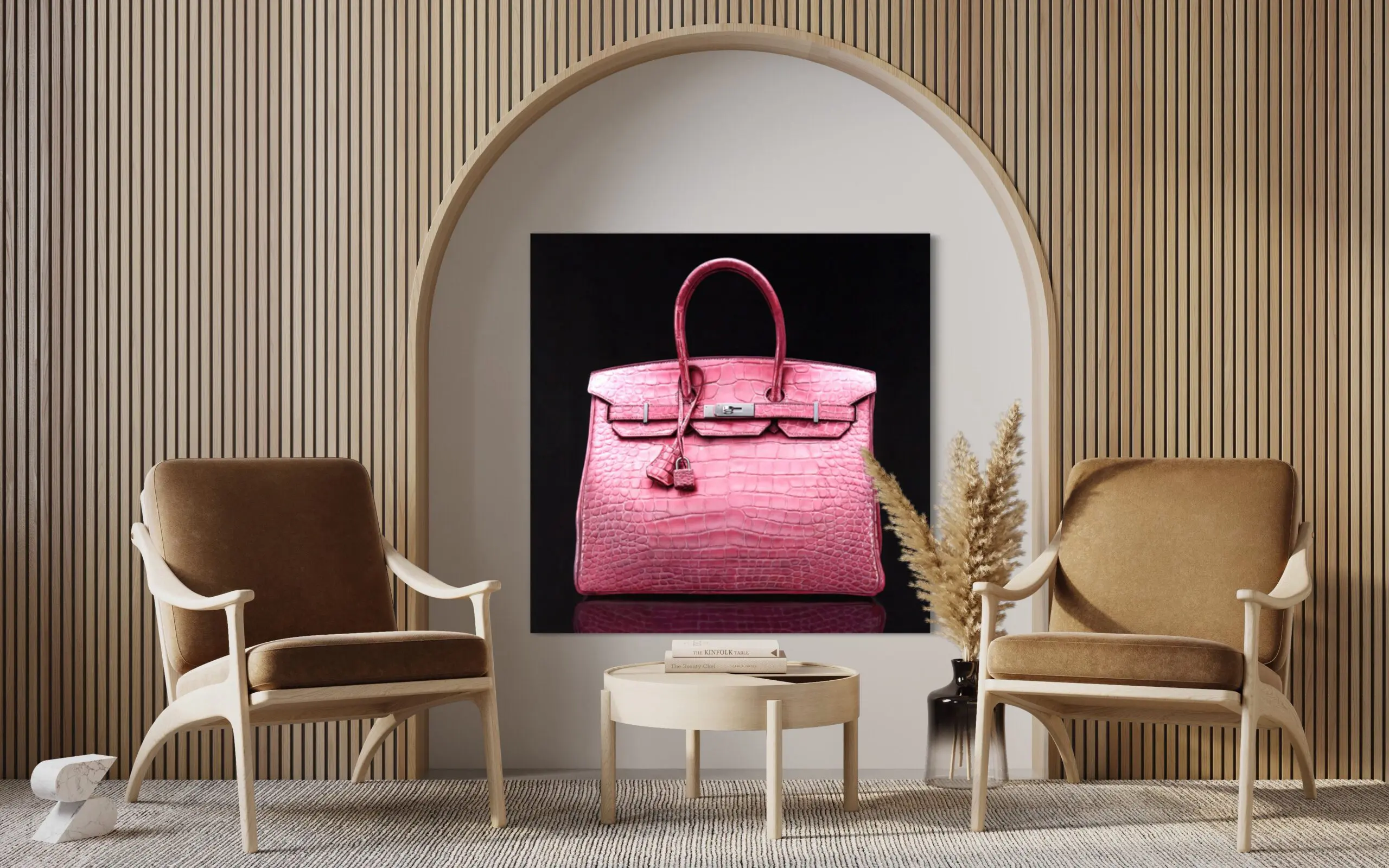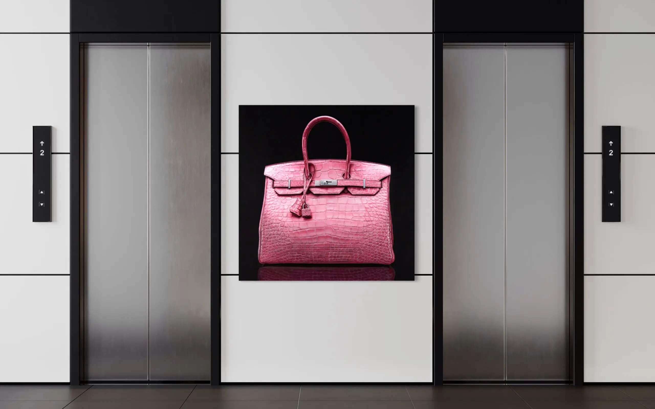 The artwork mimics a portraiture of the iconic Hermes Birkin bag, proudly positioned in space against a deep black background. The painting’s impeccable attention to detail, play of light and shadow, and three-dimensionality create a hyper-realistic depiction that celebrates the essence of luxury.