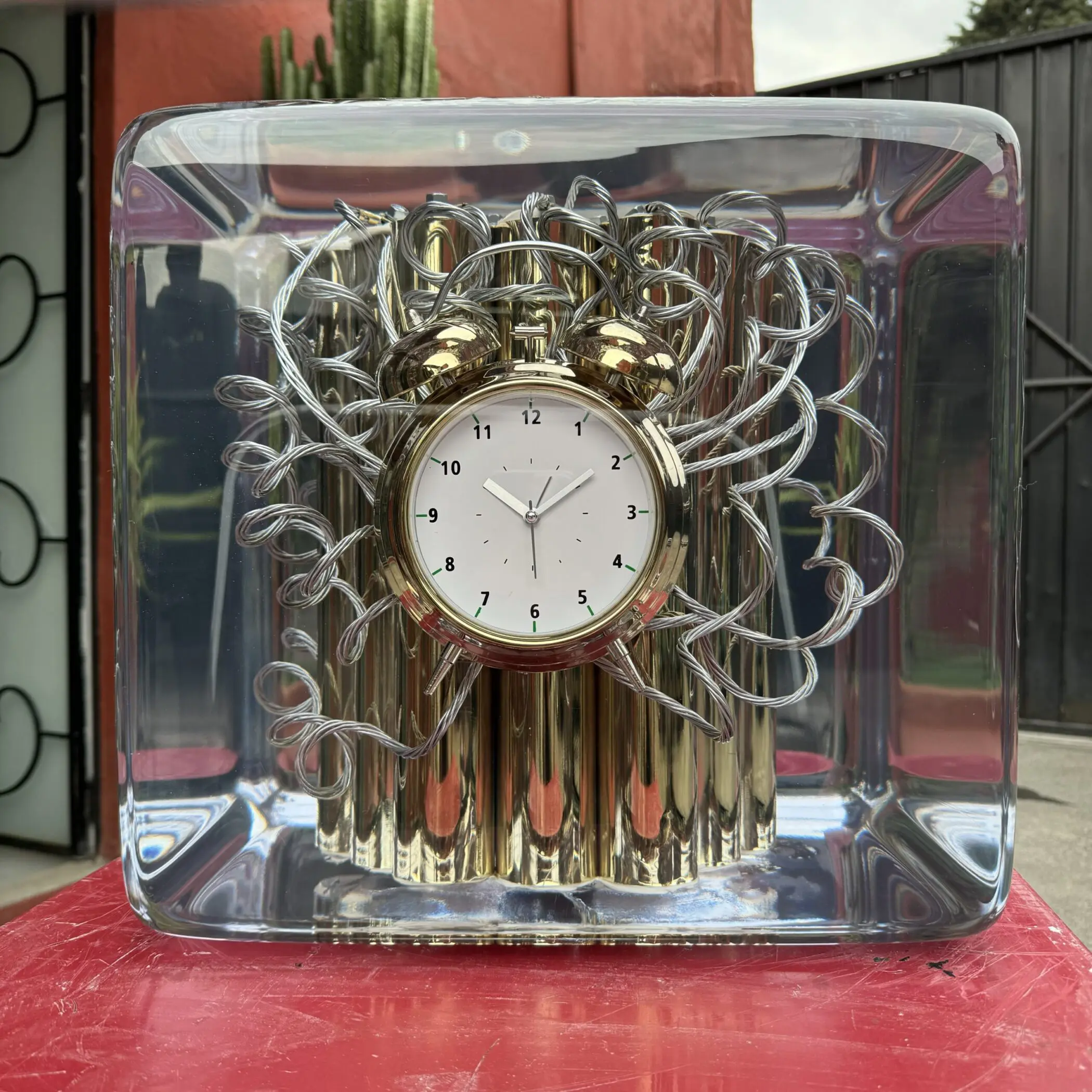 A striking commentary on the fragile nature of time and urgency, “A Time Bomb” by Emmanuel Meneses is a masterful fusion of conceptual sculpture and contemporary design. Encased in a sleek, transparent block, a classic golden alarm clock is entwined with metallic wires, resembling the intricate detonation mechanisms of a bomb. The juxtaposition of fragility and force, control and chaos, turns this piece into a bold meditation on temporality, modern anxiety, and the relentless ticking of existence.