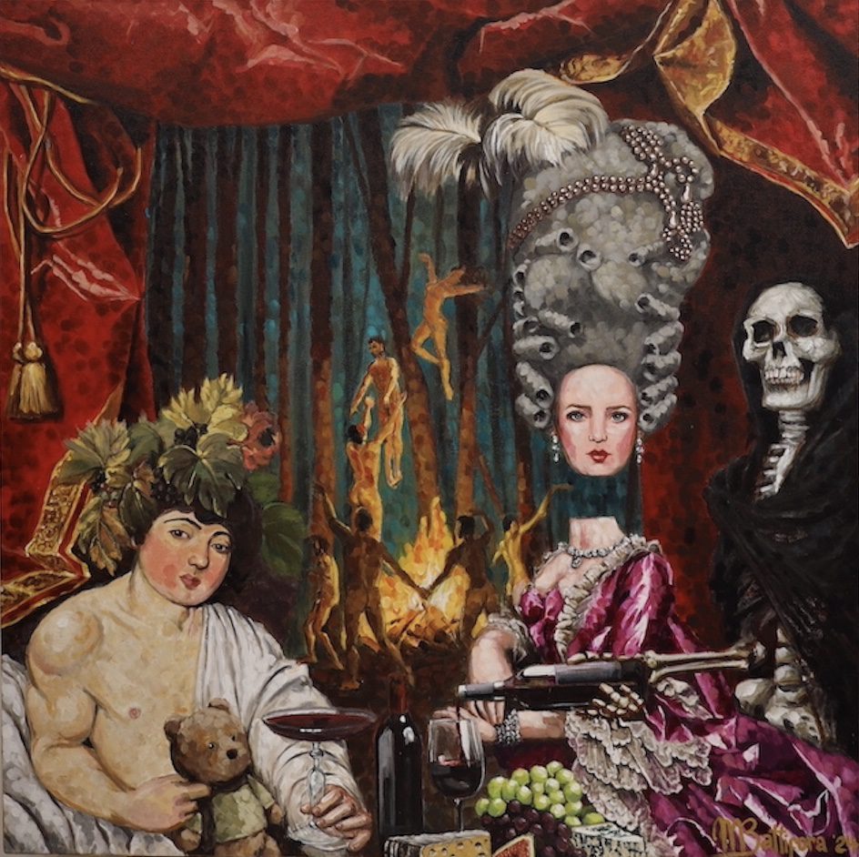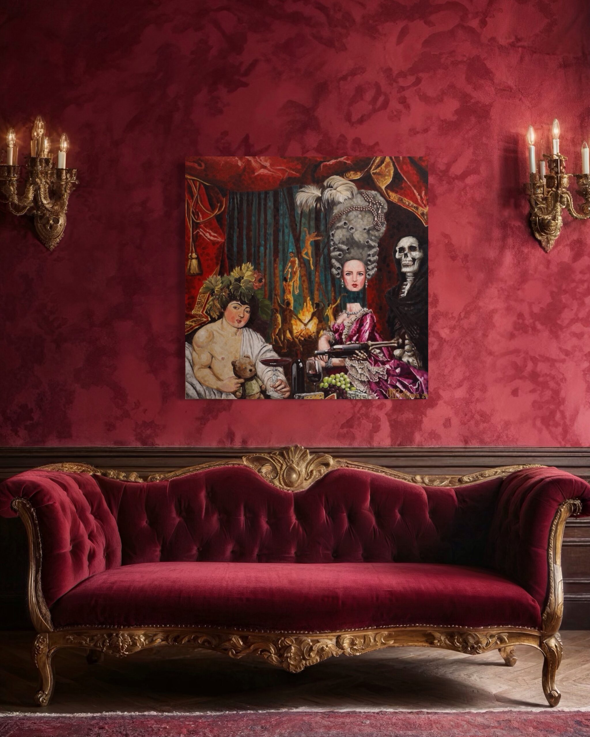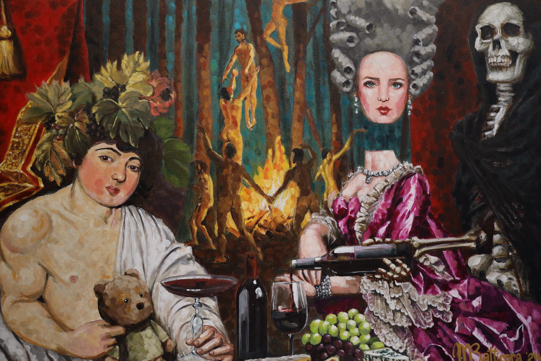 Part of Battifora’s Bacchus series, with themes of indulgence and pursue of pleasure, this painting juxtaposes innocence with mortality, inviting viewers to reflect on the dualities of life—youth and age, pleasure and inevitability. A youthful Marie Antoinette in opulent attire has been invited to our party, a semi nude bacchus God of festivity, and the contrasting presence of the skeleton serve as a reminder that all indulgence ultimately leads to the same fate, challenging us to consider how we navigate our desires in the face of life’s transience.