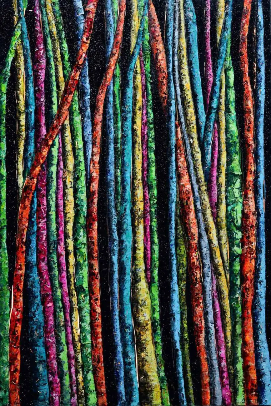 Haleh Mashian’s “Abracadabra” transforms the forest into a dazzling display of bold colors and rich textures. The contrast between the dark negative space and the bright, layered hues enhances the depth of the composition, making each trunk feel alive with energy.