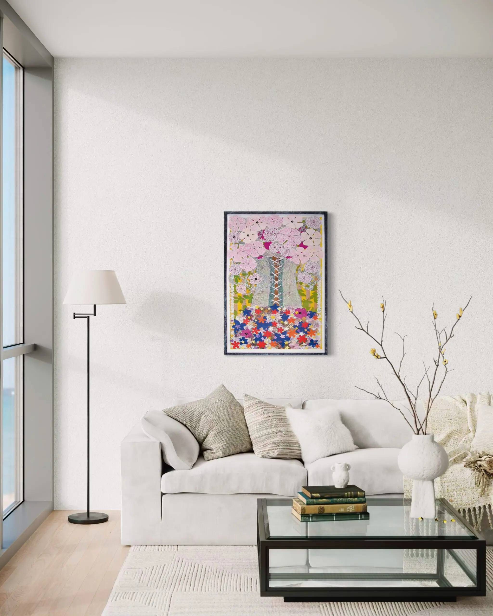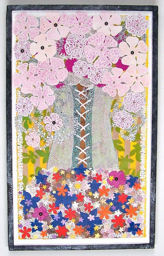 An interplay of texture, pattern, and color, “Adamantine” evokes a dreamlike fusion of nature and human form. This mixed-media piece reimagines the body as a canvas of blooming vitality, where delicate lacework and bold floral elements entwine with an underlying strength—an adamantine resilience beneath ethereal beauty.