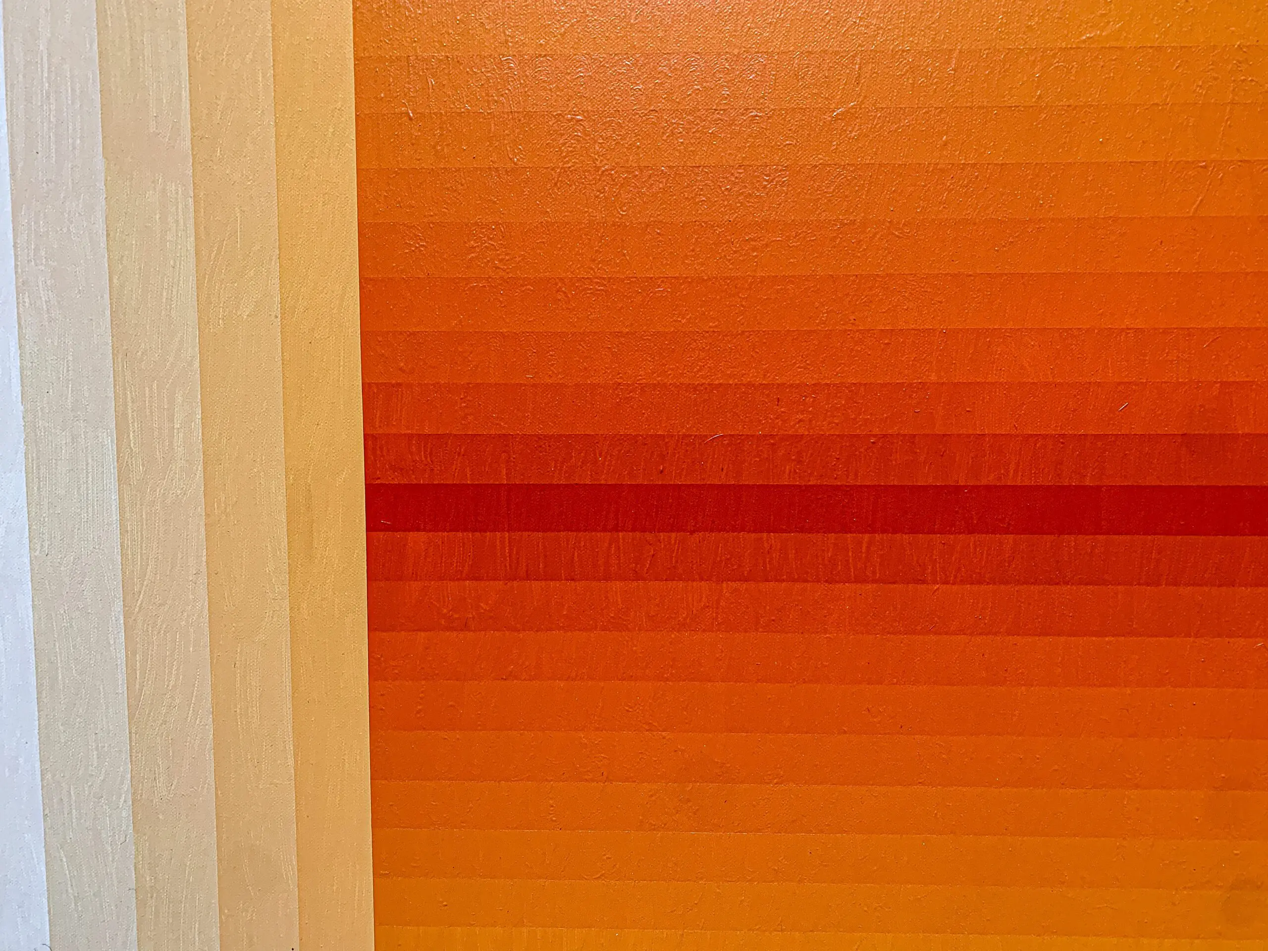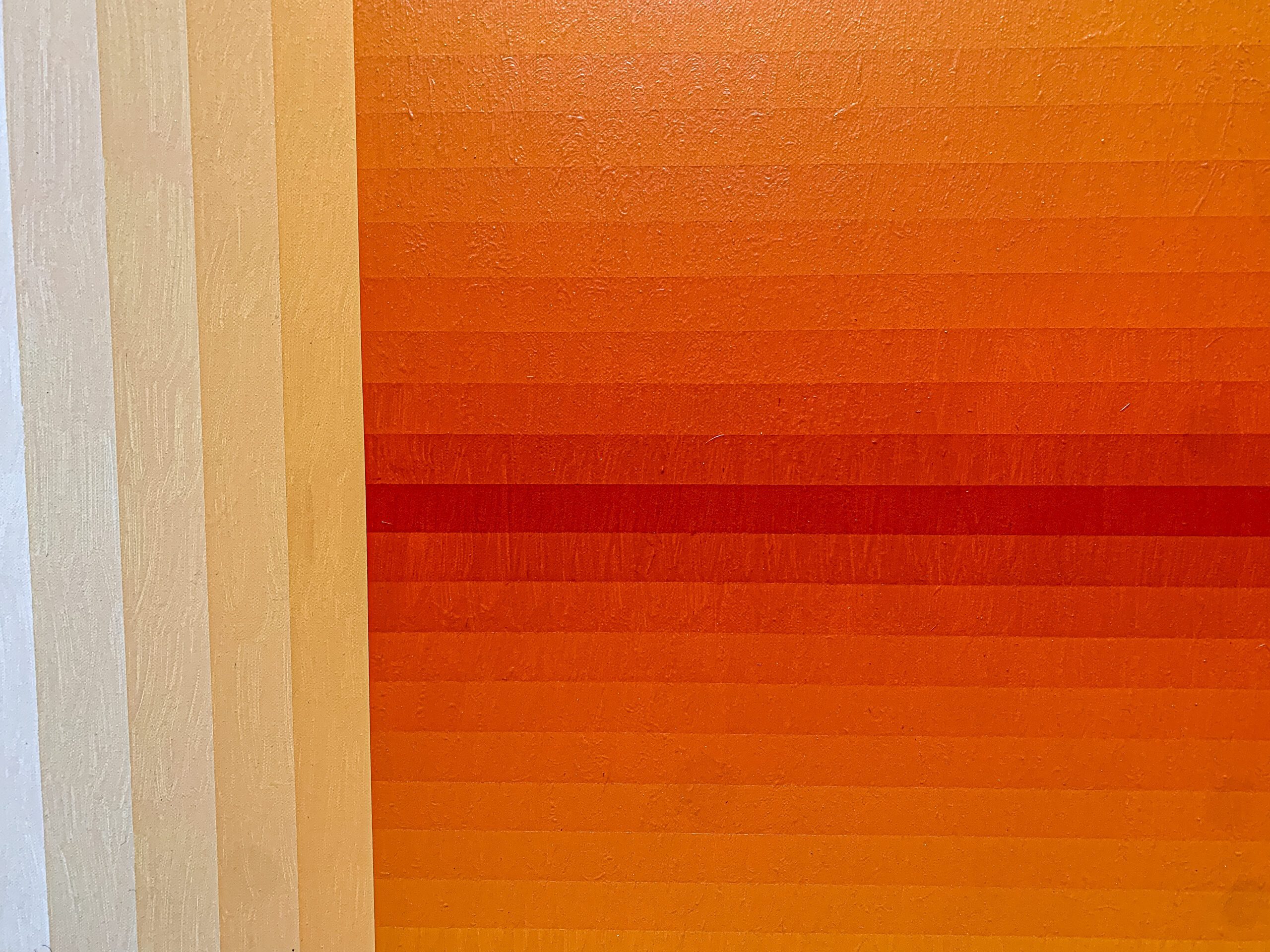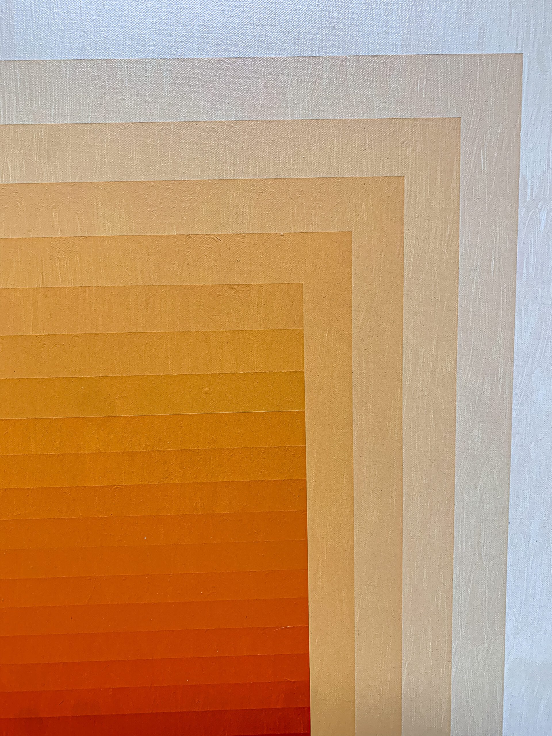 In this radiant composition, the artist orchestrates a symphony of warmth through geometry and gradation. A square within squares pulses outward from a fiery core—where deep crimson and vermilion meet—slowly diffusing into golden amber and pale buttery tones at the edge. The painting reads like a contained blaze, meticulously balanced between structure and saturation.