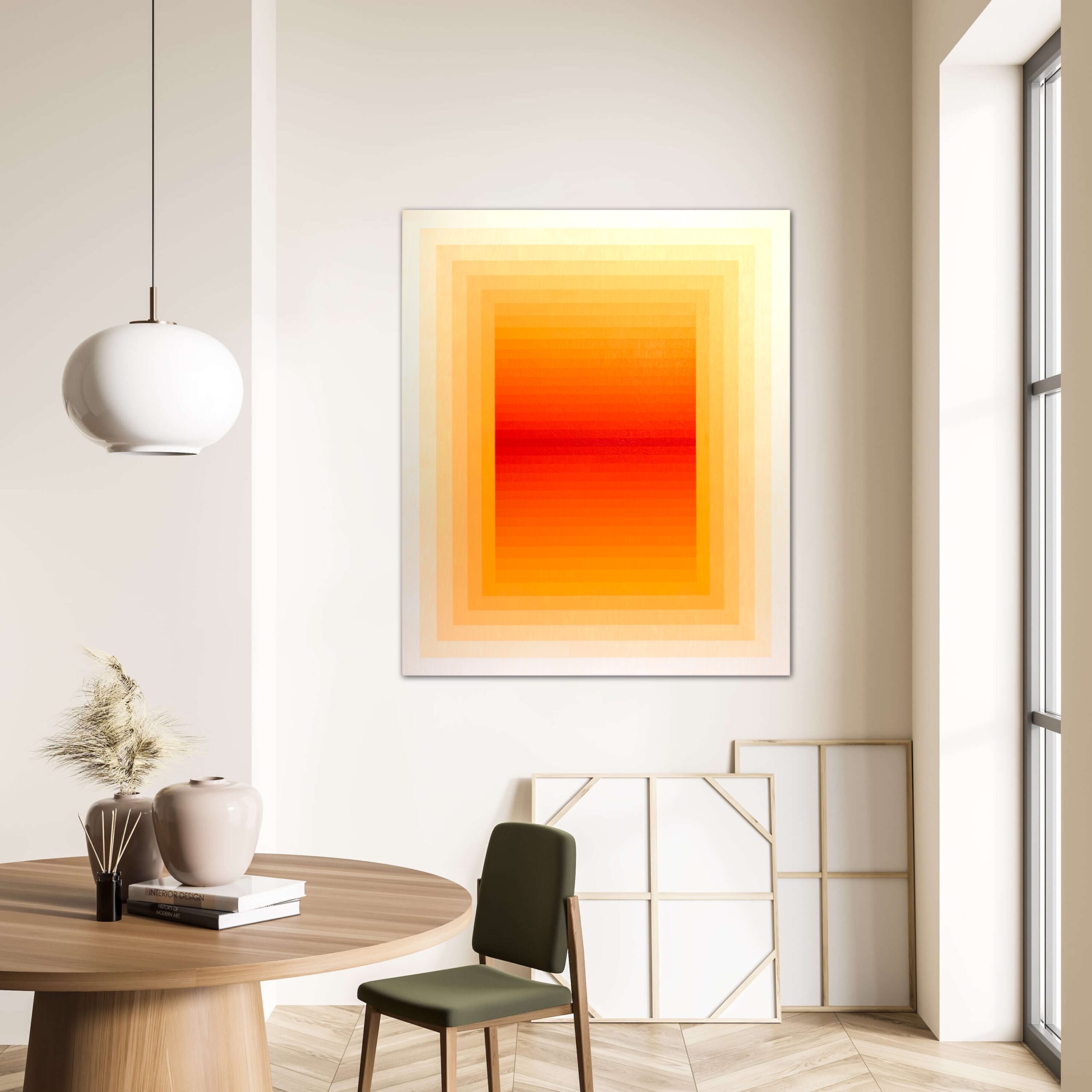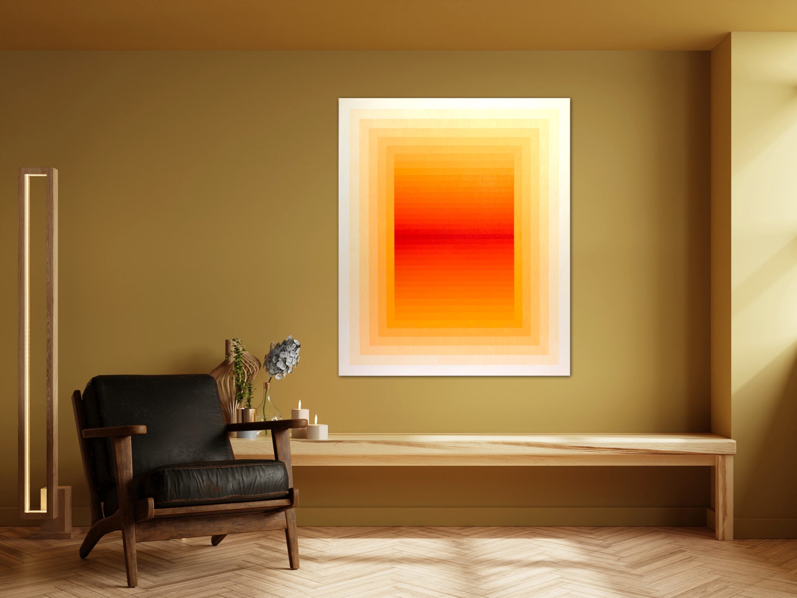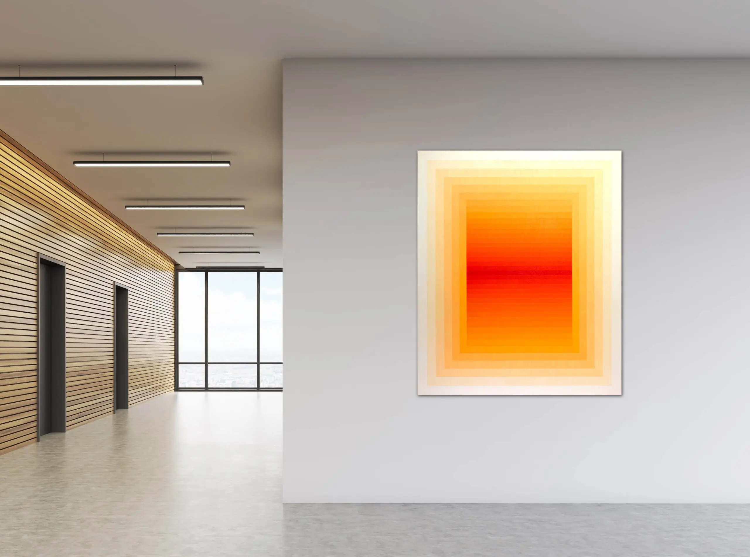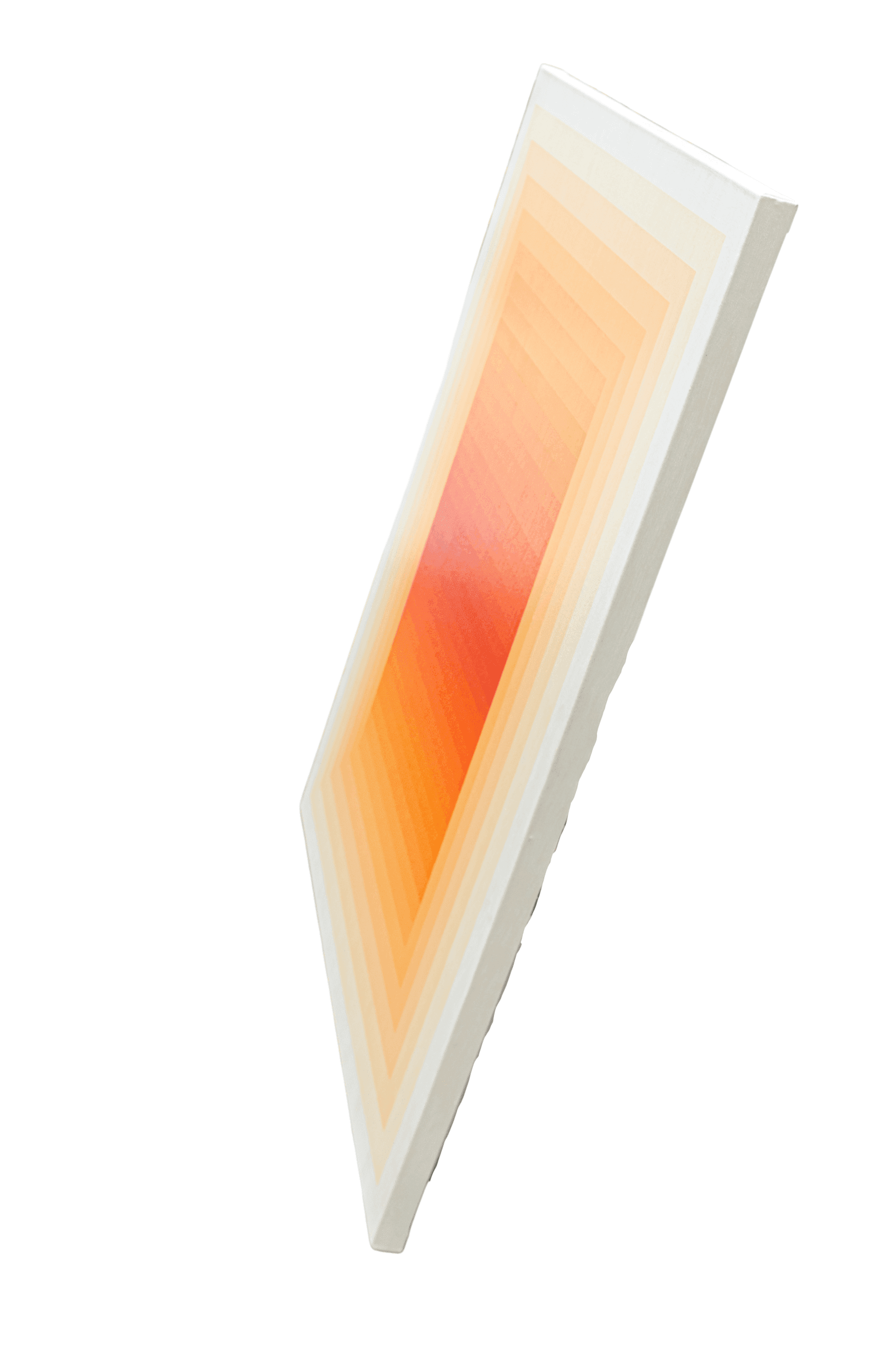 In this radiant composition, the artist orchestrates a symphony of warmth through geometry and gradation. A square within squares pulses outward from a fiery core—where deep crimson and vermilion meet—slowly diffusing into golden amber and pale buttery tones at the edge. The painting reads like a contained blaze, meticulously balanced between structure and saturation.