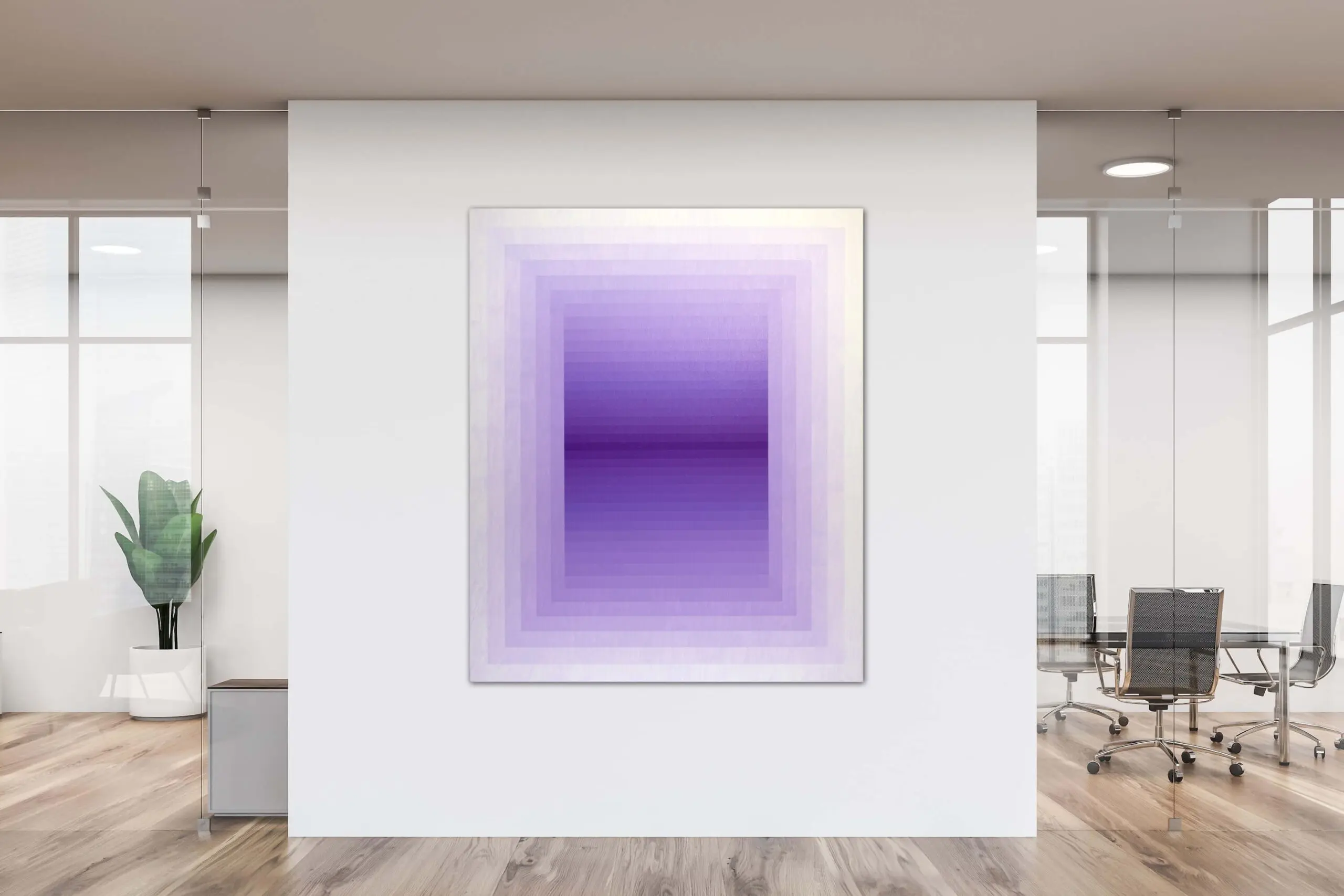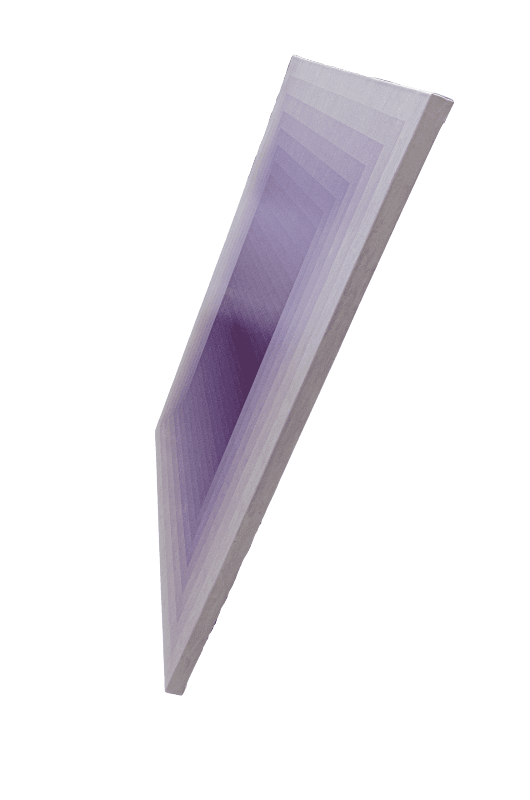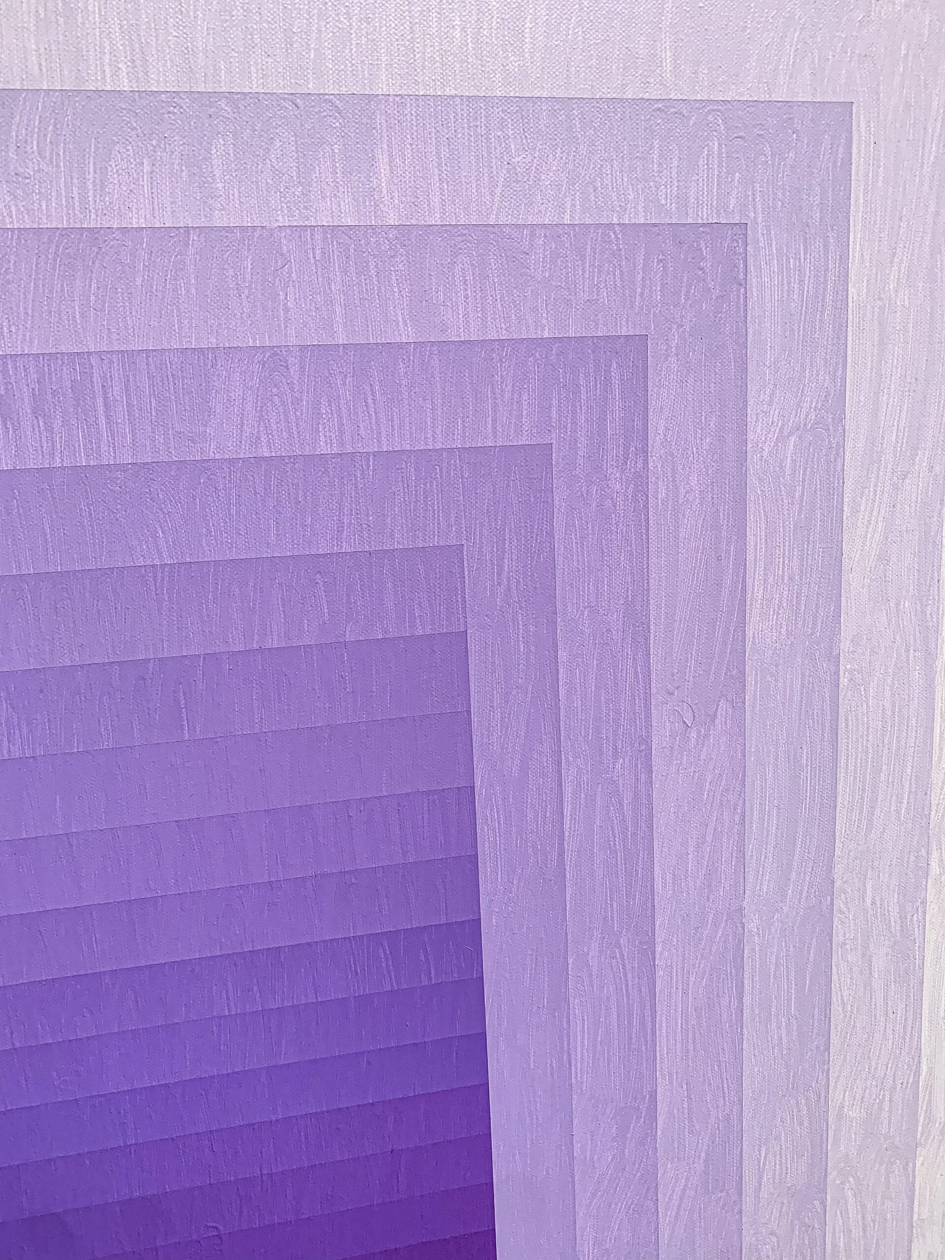 This painting presents a refined exploration of gradient, geometry, and perception. Structured with concentric rectangles that gently transition from pale lavender at the edges to a rich, saturated violet at the center, the composition pulls the viewer inward, evoking a sense of spatial depth and meditative stillness. The repetition of form and controlled chromatic shifts recall the language of Op Art and Color Field painting, yet the softness of the transitions introduces a contemplative, almost atmospheric quality.