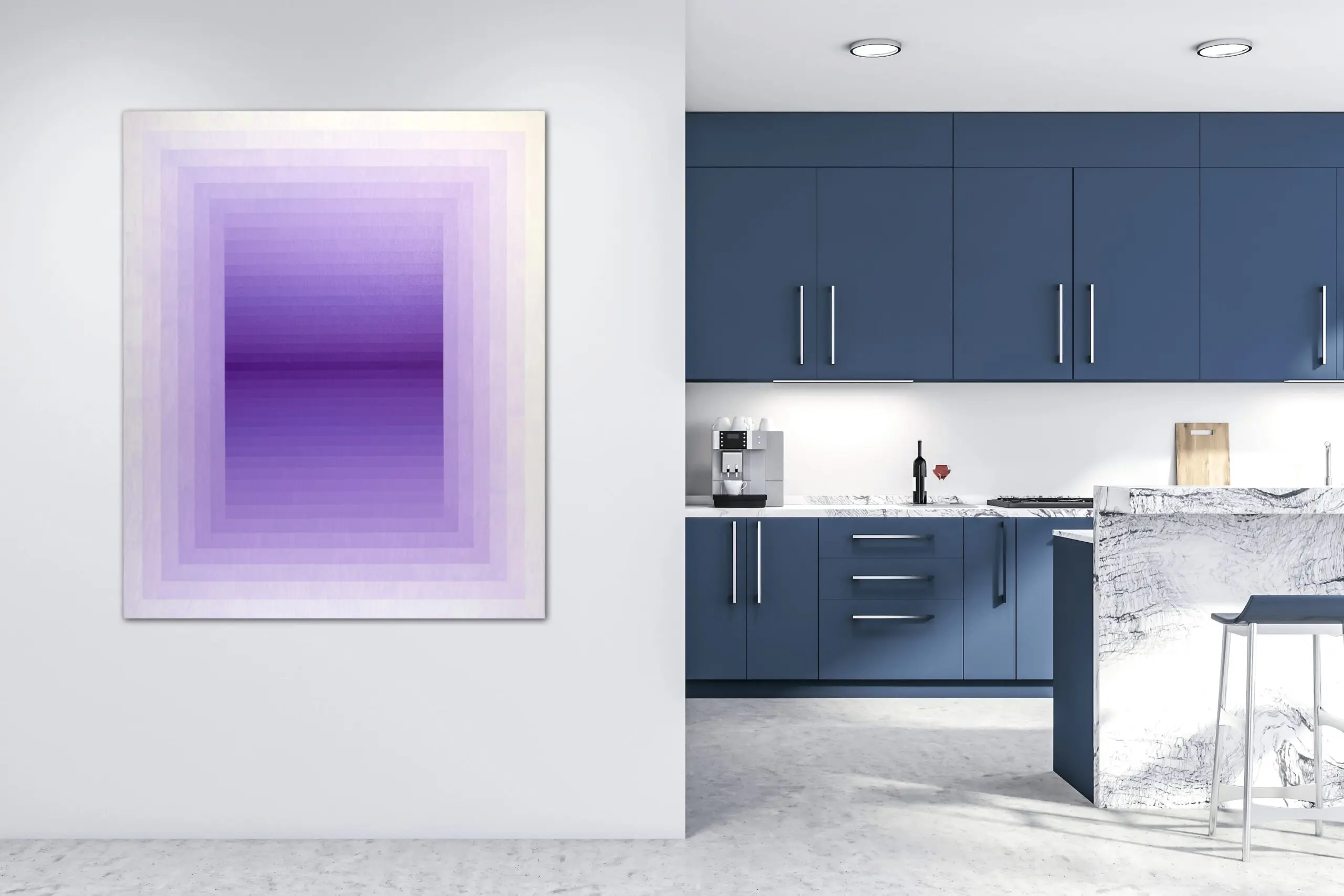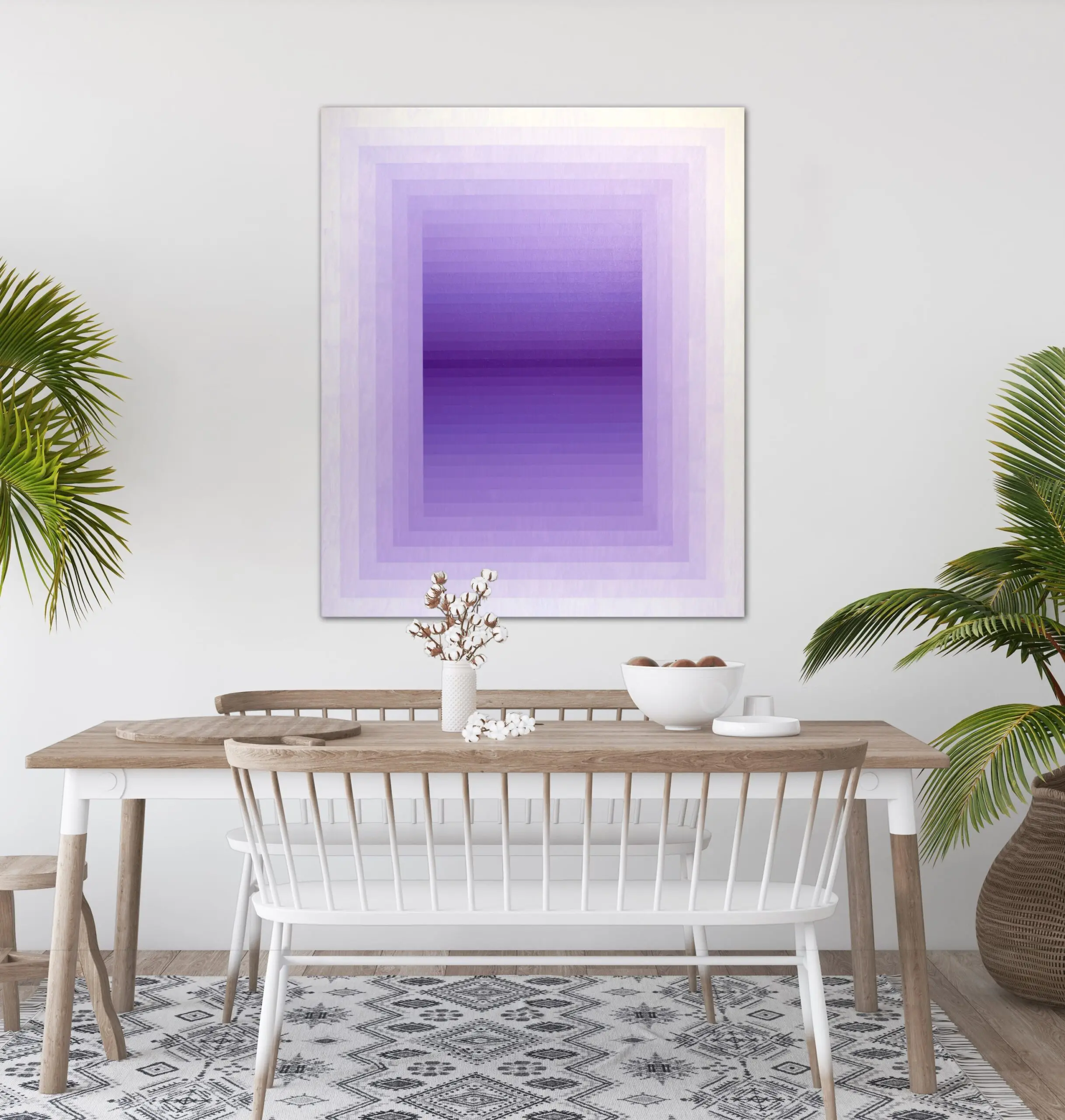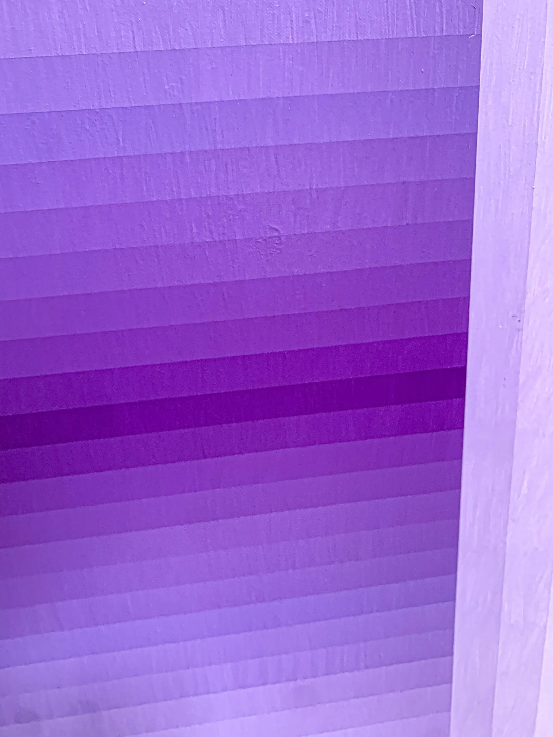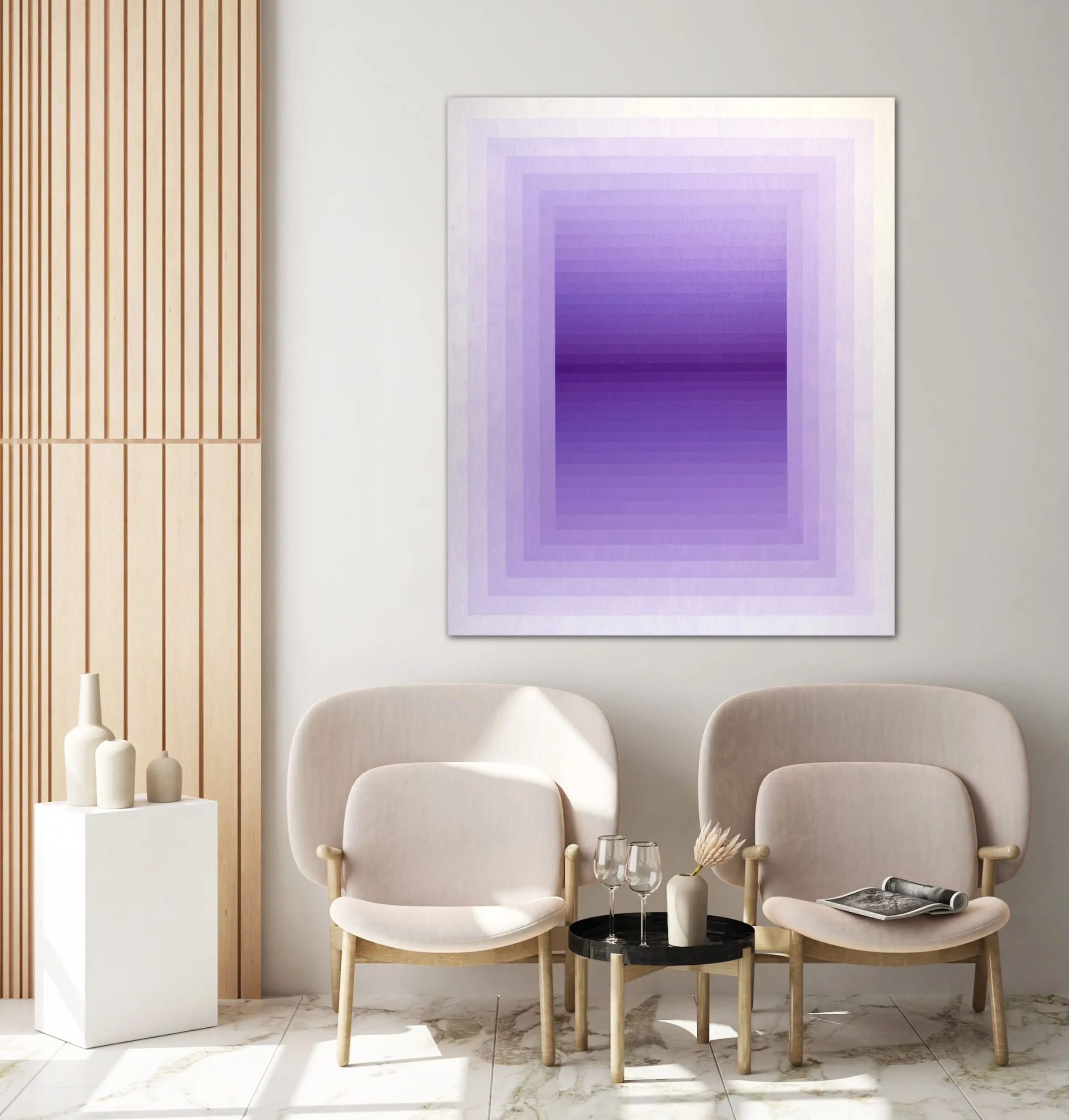 This painting presents a refined exploration of gradient, geometry, and perception. Structured with concentric rectangles that gently transition from pale lavender at the edges to a rich, saturated violet at the center, the composition pulls the viewer inward, evoking a sense of spatial depth and meditative stillness. The repetition of form and controlled chromatic shifts recall the language of Op Art and Color Field painting, yet the softness of the transitions introduces a contemplative, almost atmospheric quality.