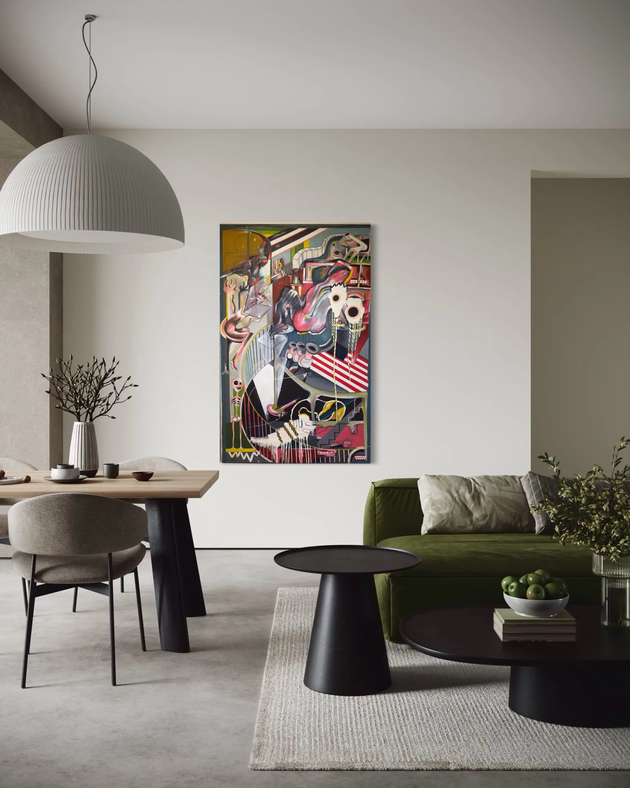 A strong sense of movement permeates the composition, as though everything is being pulled apart, yet held together by invisible forces. The dripping paint and layered textures heighten this effect, creating a visceral, almost liquefied reality that mirrors the instability of contemporary existence.
