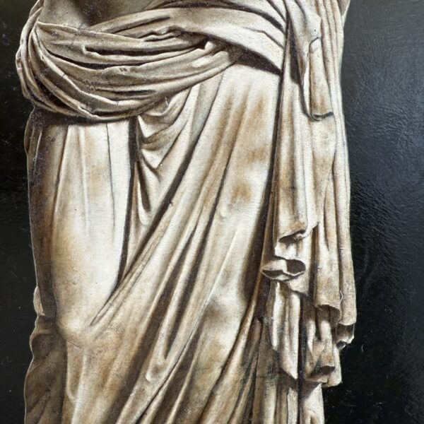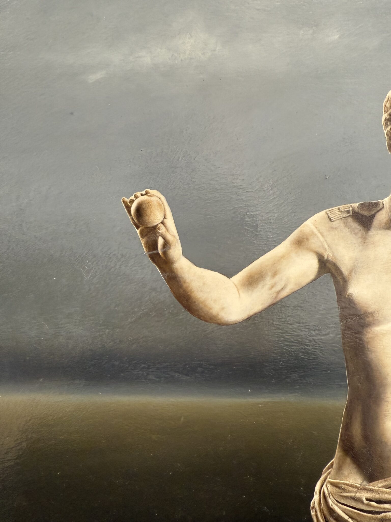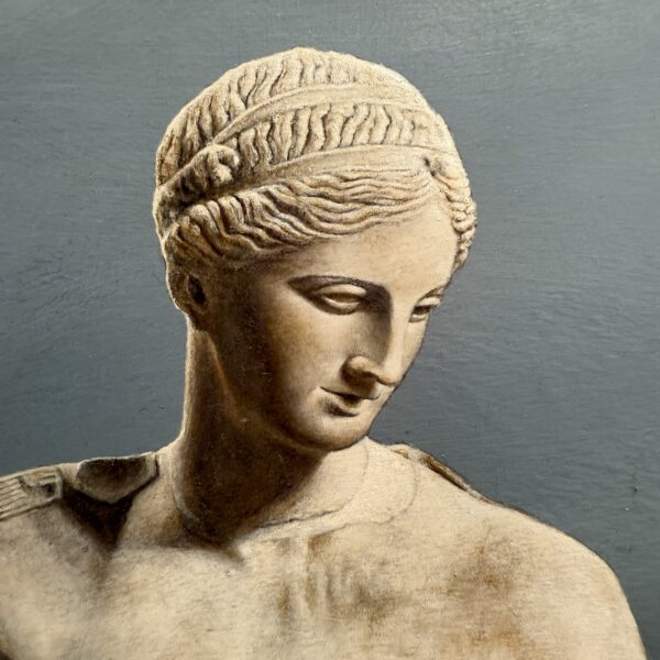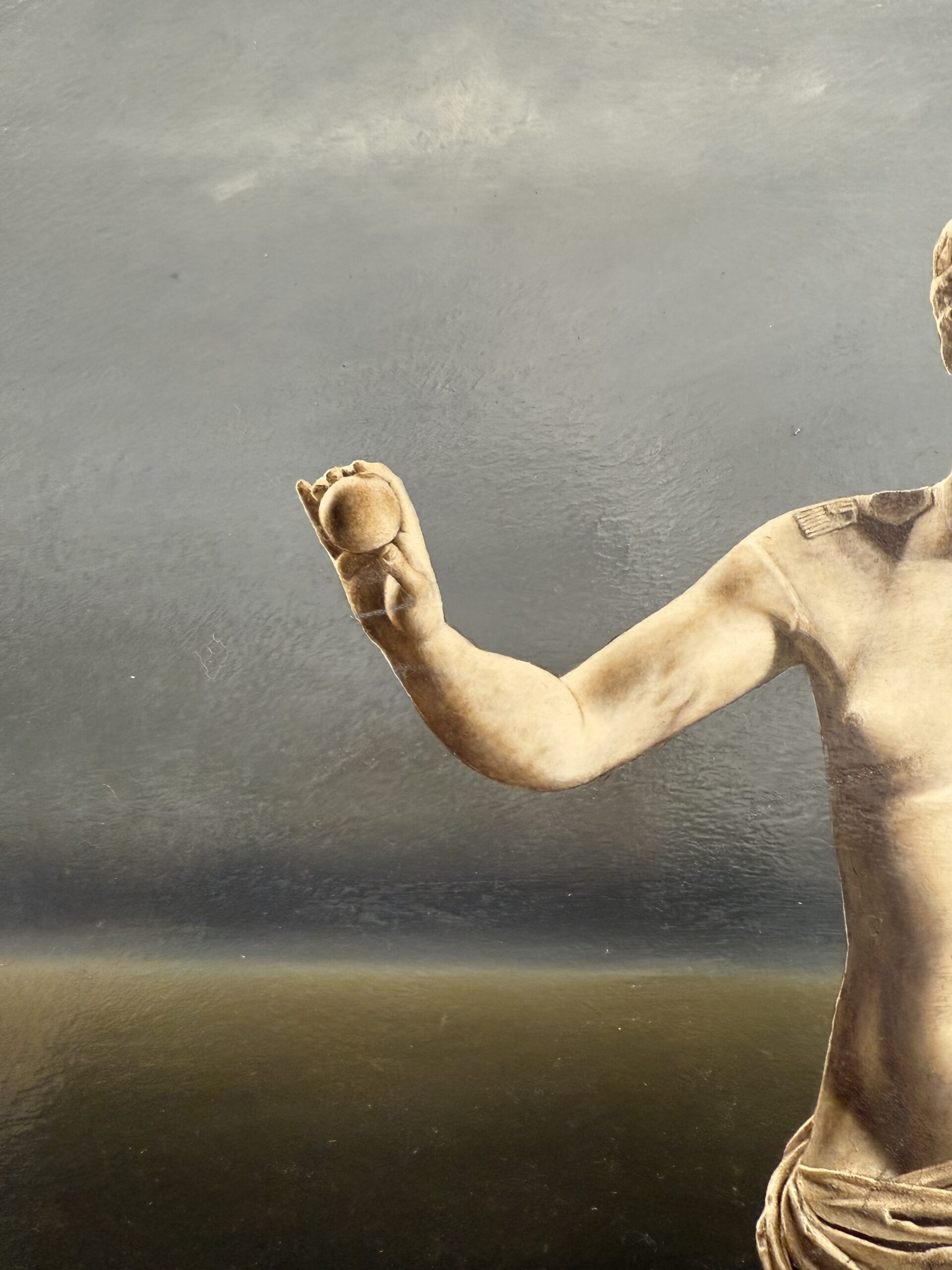 Art historians and specialists have long debated whether the original sculpture depicted Aphrodite holding a mirror, symbolizing beauty and self-reflection, or an apple, representing desire and allure. In this contemporary interpretation, Binder masterfully restores her missing arms, seamlessly integrating them into the figure’s timeless body. Aphrodite holds an apple in her hand, a powerful symbol of divine beauty deeply rooted in Greek mythology. Painted with exceptional skill through masterful oil painting, Binder captures the smooth texture, subtle veining, and luminous surface of marble, achieving a lifelike quality that blurs the boundary between painting and sculpture. This striking realism blurs the line between painting and sculpture, bringing the goddess into the present day while honoring her classical origins.