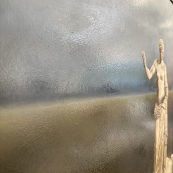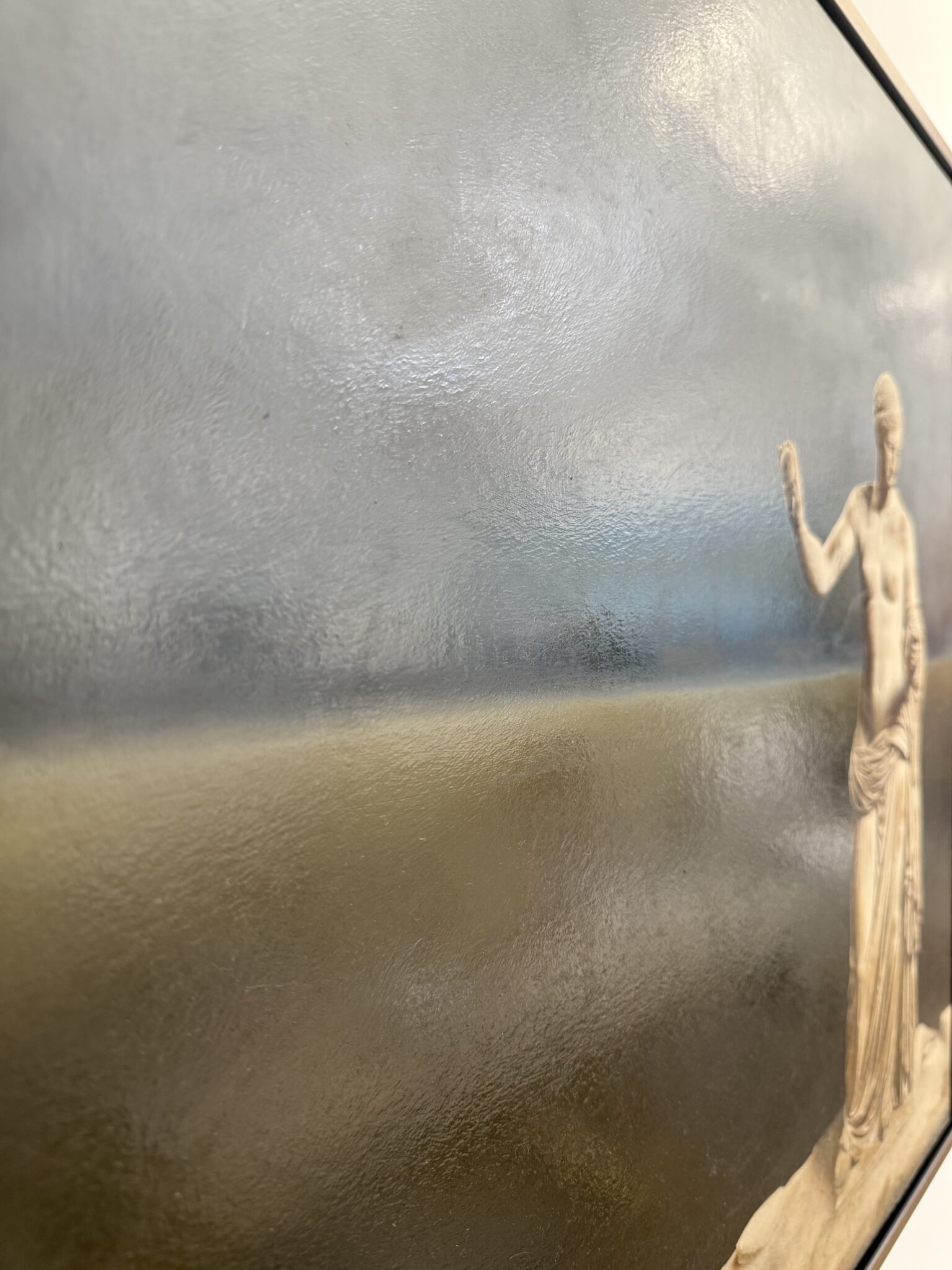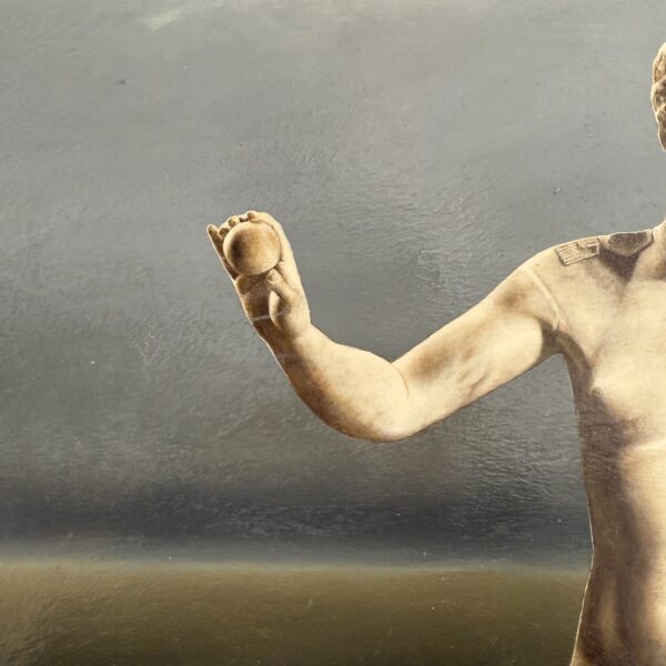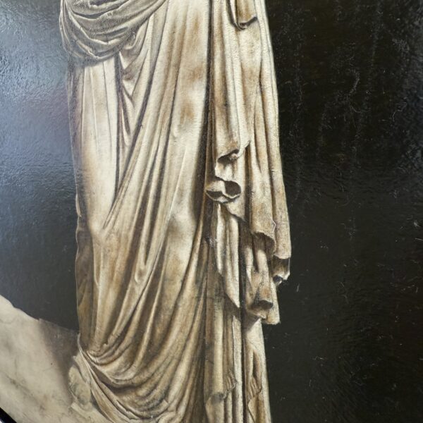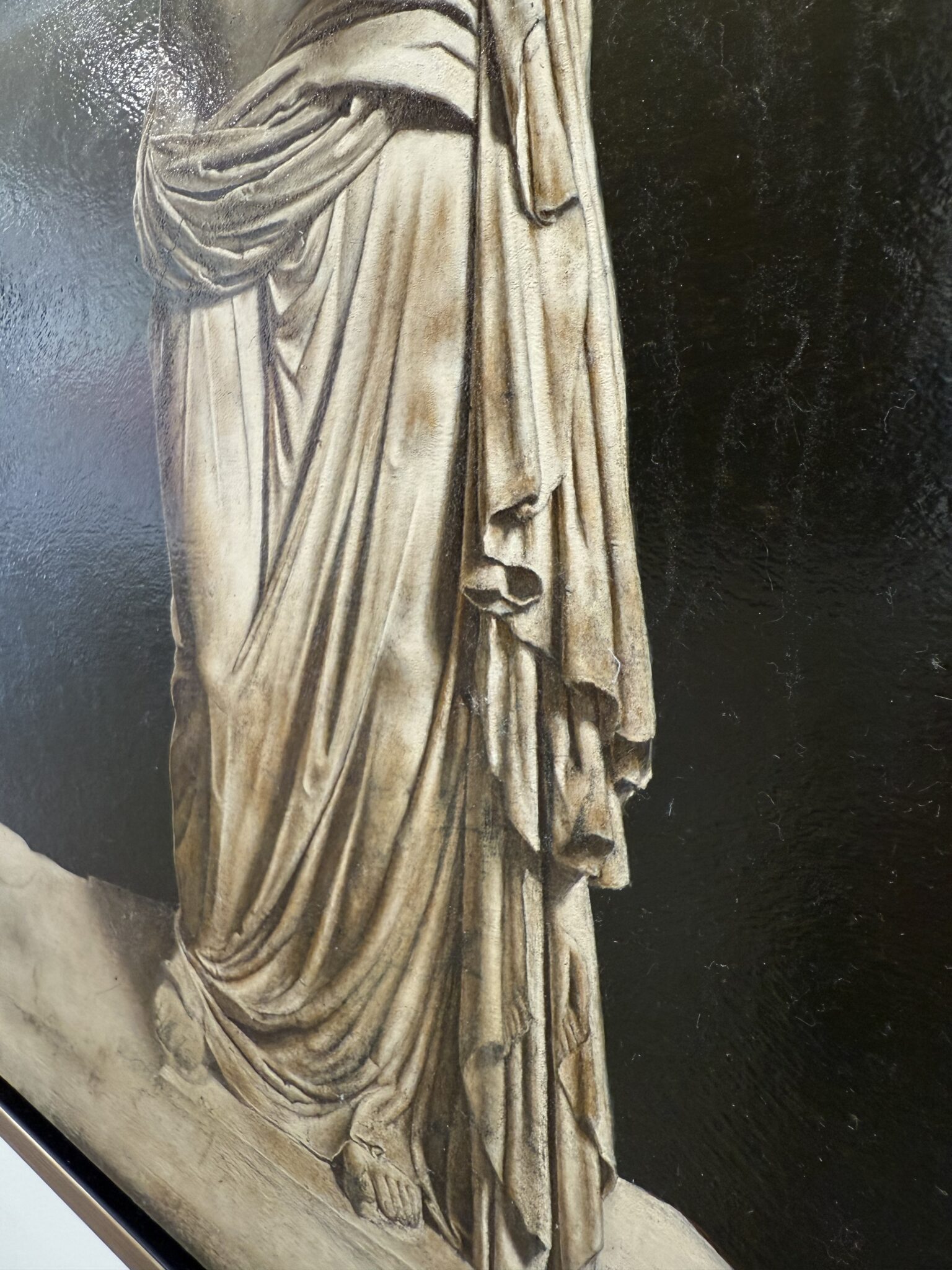 Art historians and specialists have long debated whether the original sculpture depicted Aphrodite holding a mirror, symbolizing beauty and self-reflection, or an apple, representing desire and allure. In this contemporary interpretation, Binder masterfully restores her missing arms, seamlessly integrating them into the figure’s timeless body. Aphrodite holds an apple in her hand, a powerful symbol of divine beauty deeply rooted in Greek mythology. Painted with exceptional skill through masterful oil painting, Binder captures the smooth texture, subtle veining, and luminous surface of marble, achieving a lifelike quality that blurs the boundary between painting and sculpture. This striking realism blurs the line between painting and sculpture, bringing the goddess into the present day while honoring her classical origins.