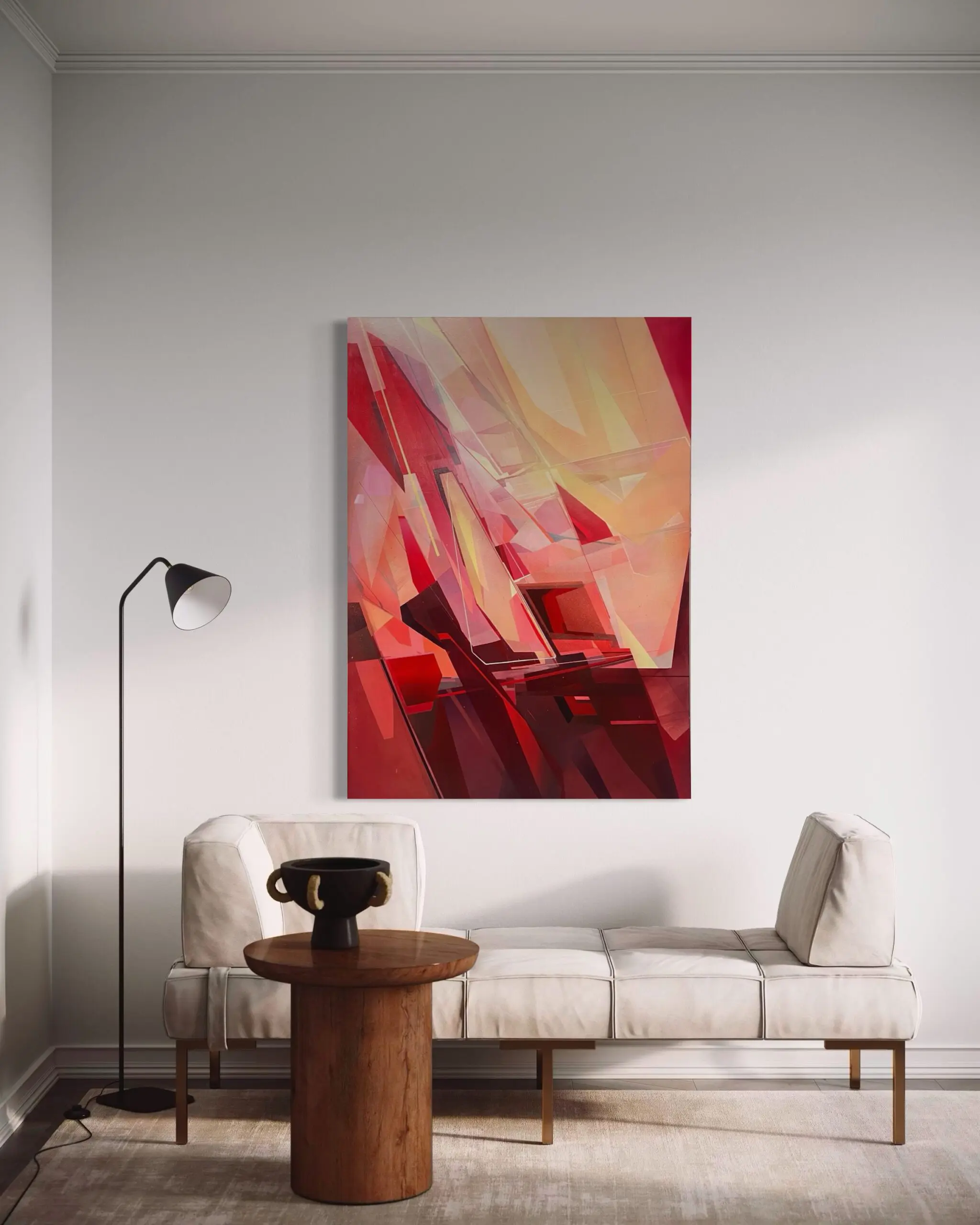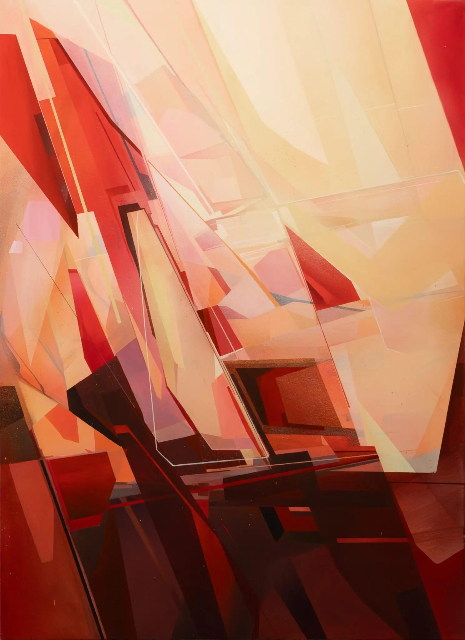 Arriving at Eternal Love by Itaewon is a layered abstract painting that explores movement and spatial tension through intersecting planes of color and light. Angular forms sweep across the canvas in overlapping trajectories, creating a sense of forward momentum and quiet collision. Rendered in a palette of deep reds, warm blush tones, amber, and translucent golds, the composition feels architectural and atmospheric.