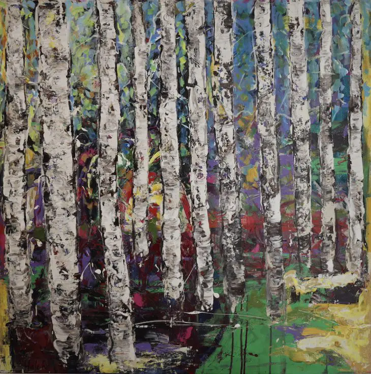 “Awakening” by Haleh Mashian feels like the forest emerging from sleep after a long winter. Thick textures and earthy tones give the piece a grounded presence, with tall, bark-like forms stretching vertically across the canvas. Charcoal, cream, rust, and amber tones blend and collide, creating a sense of movement that feels both physical and emotional.