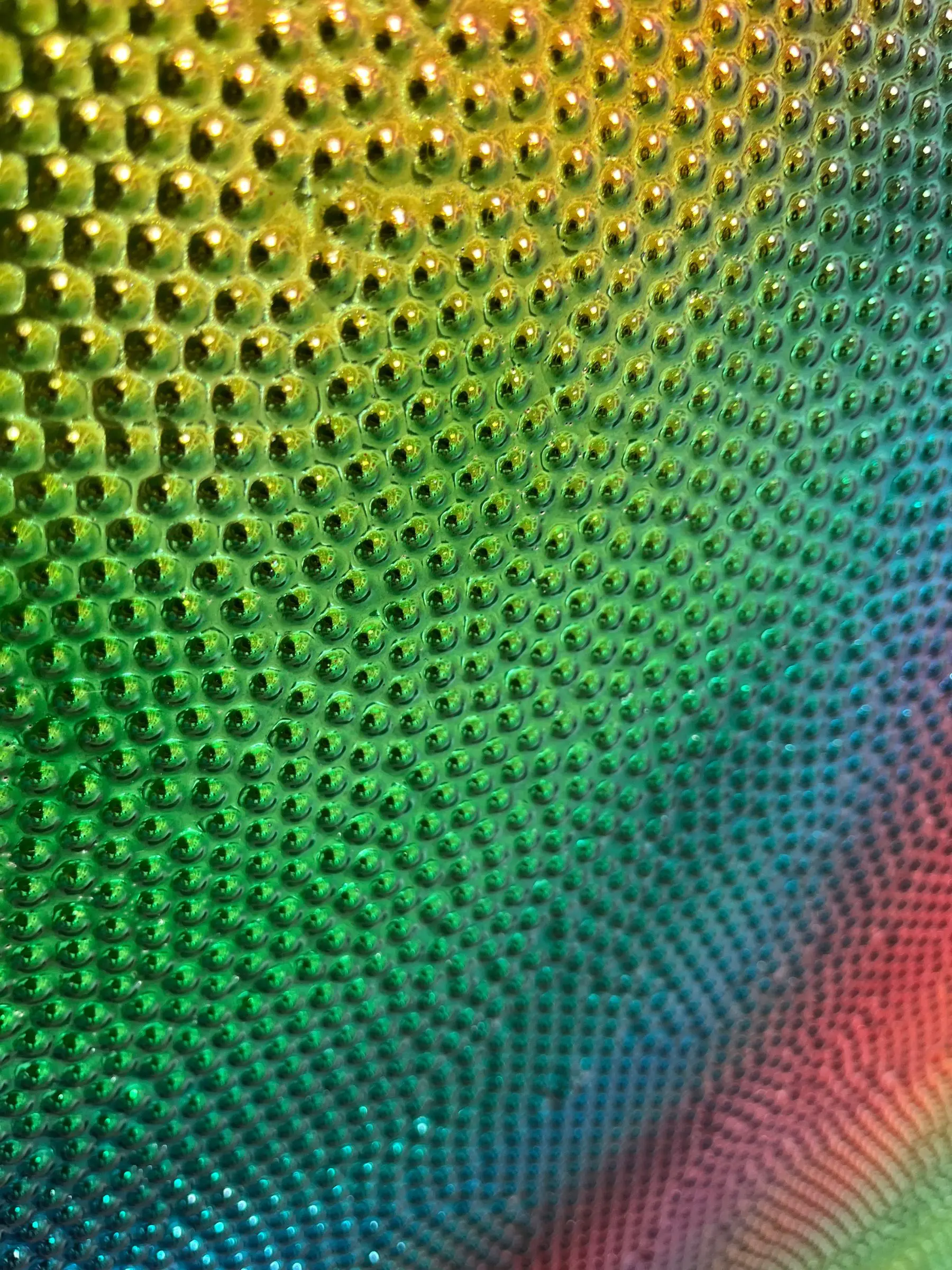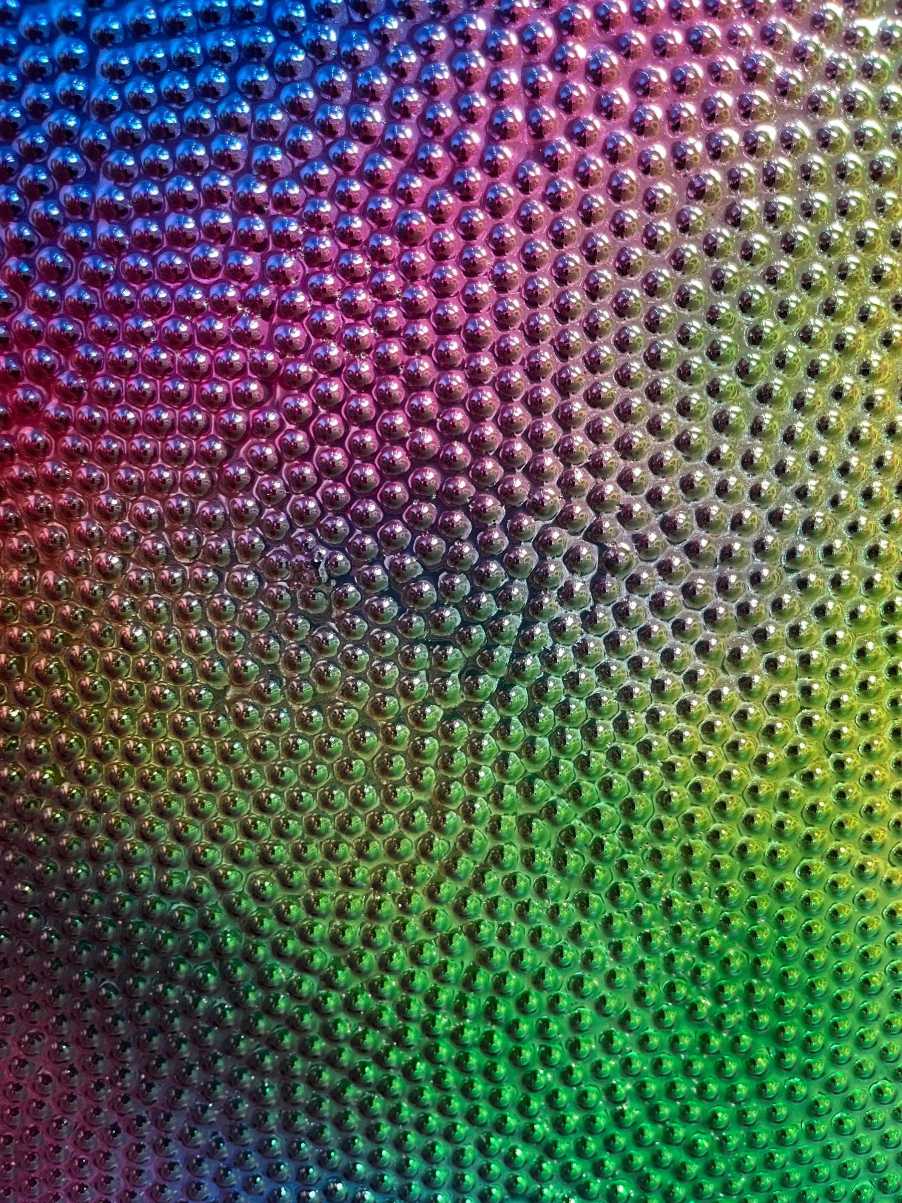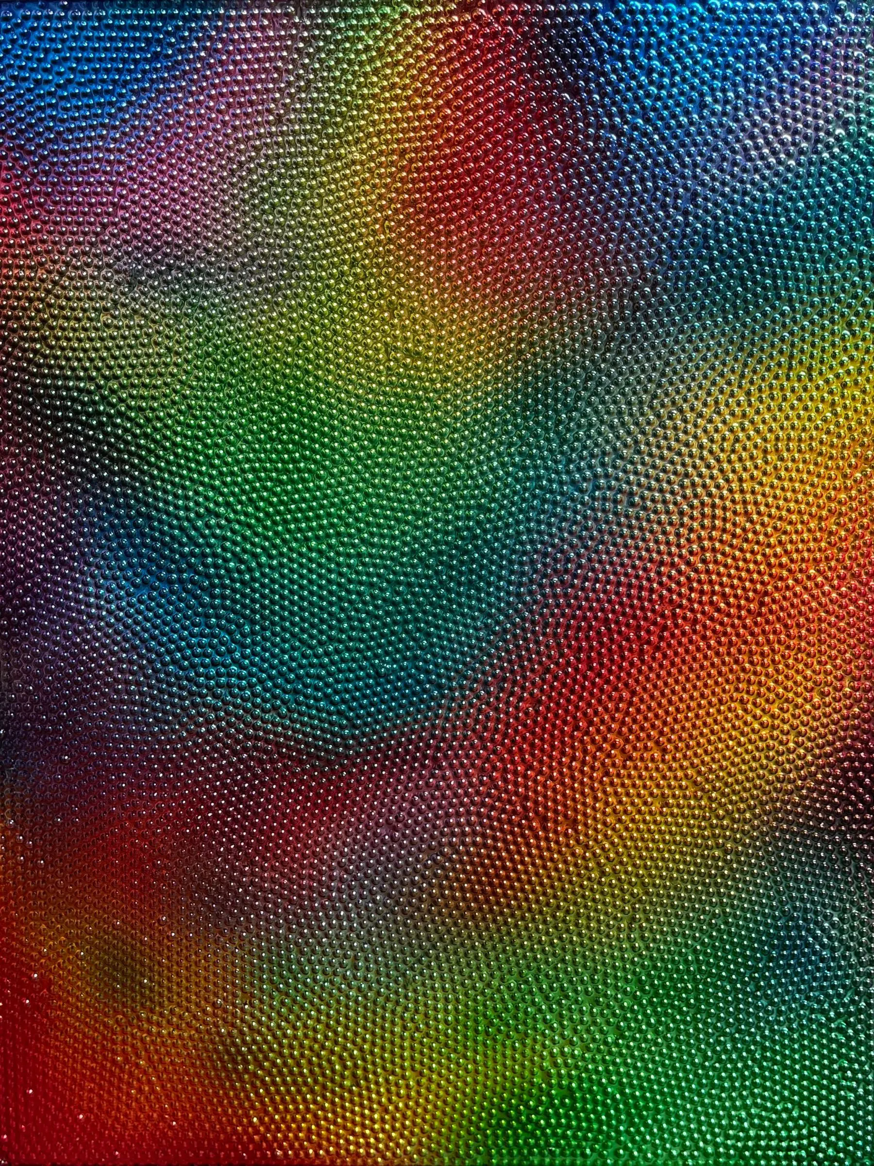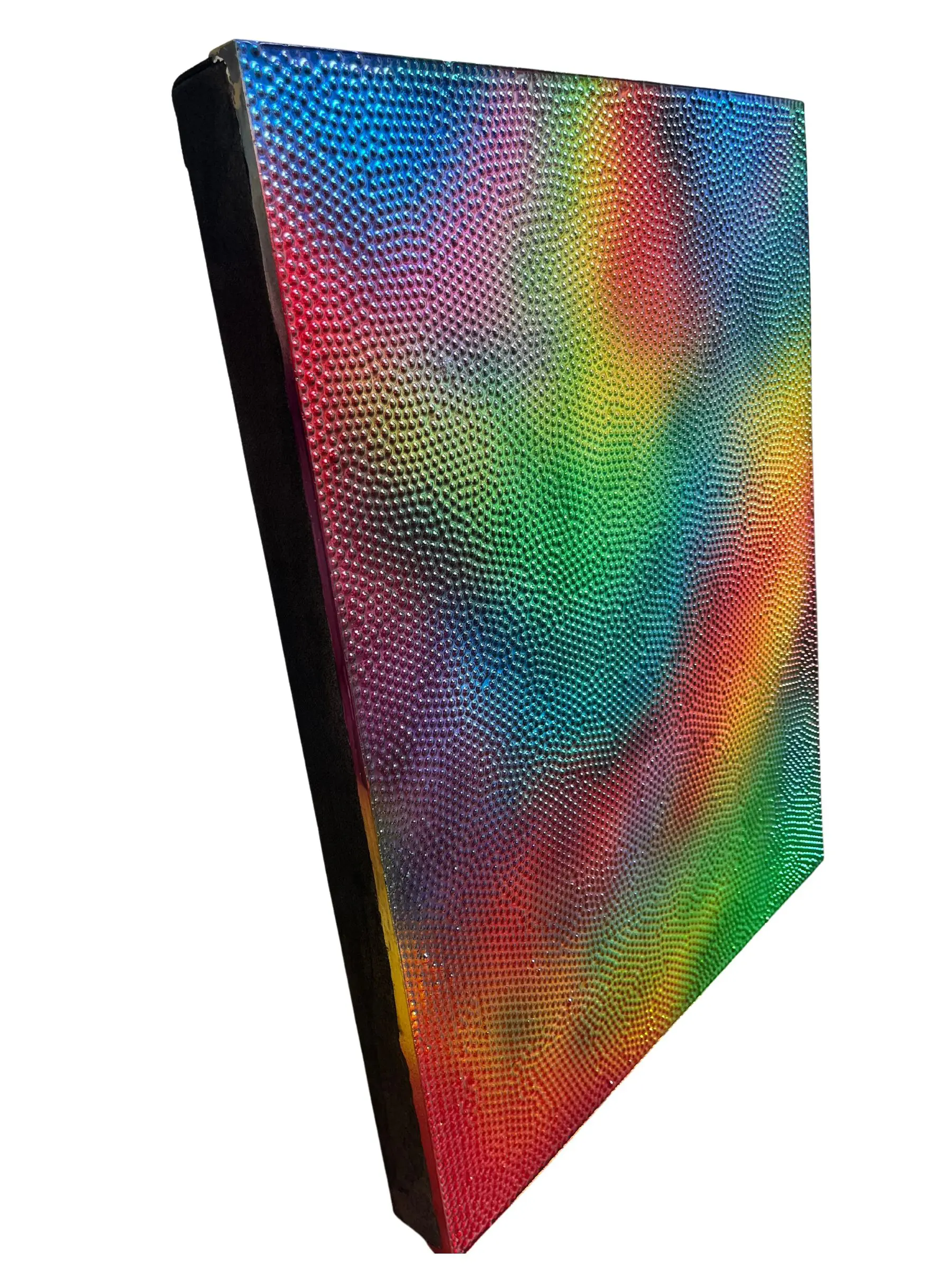Canvas over artist made panel with epoxy, and 6mm airsoft ammunition, with poly primer, silver deposit, and candy color.