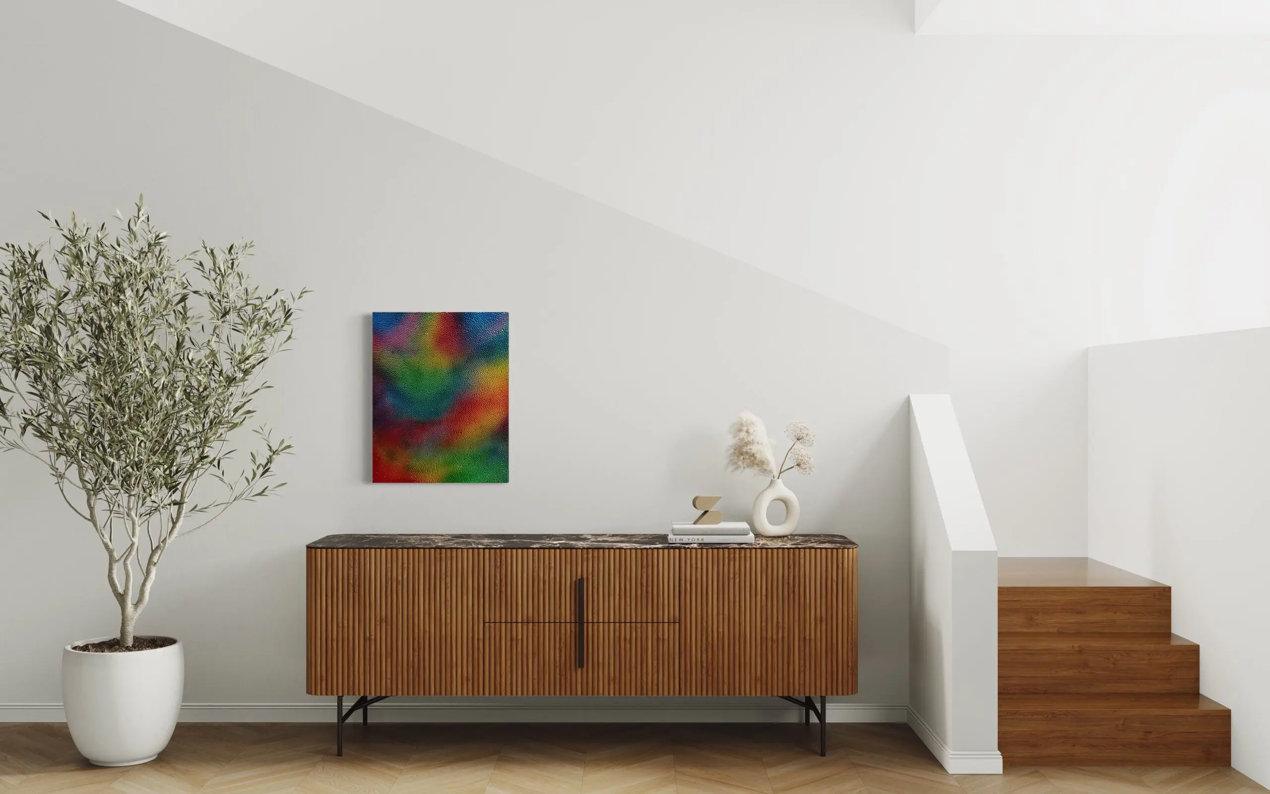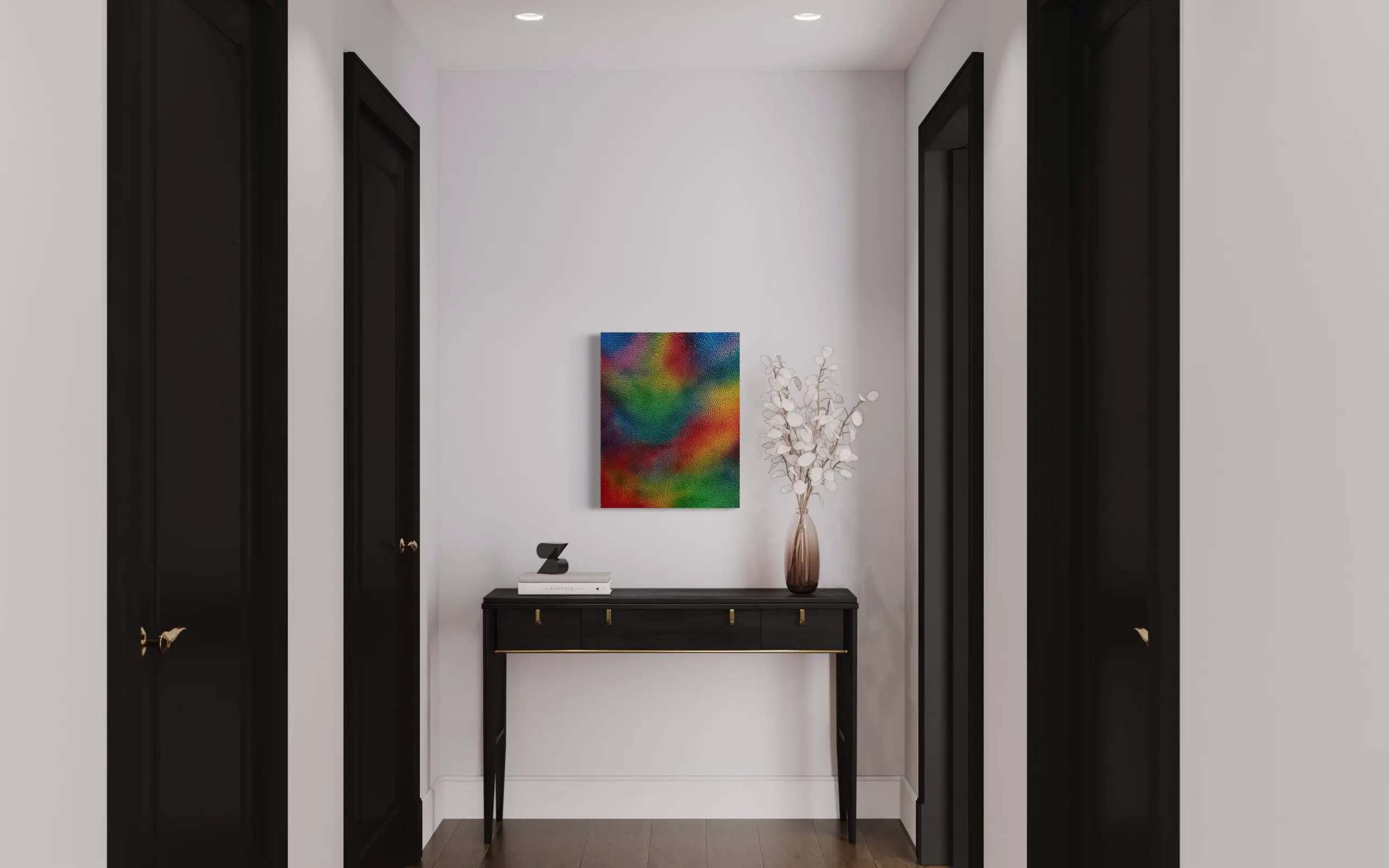 This extraordinary artwork is expertly crafted on canvas, delicately layered over an artist-made panel, creating a dynamic interplay of textures. The addition of epoxy and six millimeter airsoft ammunition, meticulously applied, adds a distinctive tactile quality that invites closer inspection. The piece is adorned with a poly primer silver deposit and candy color, enhancing its visual impact and giving it a captivating allure.