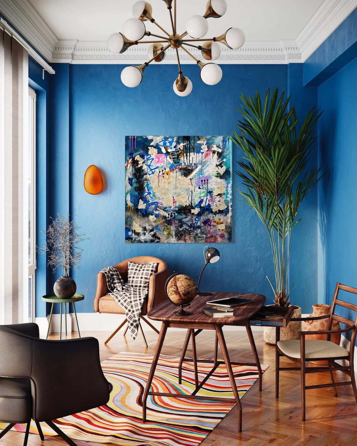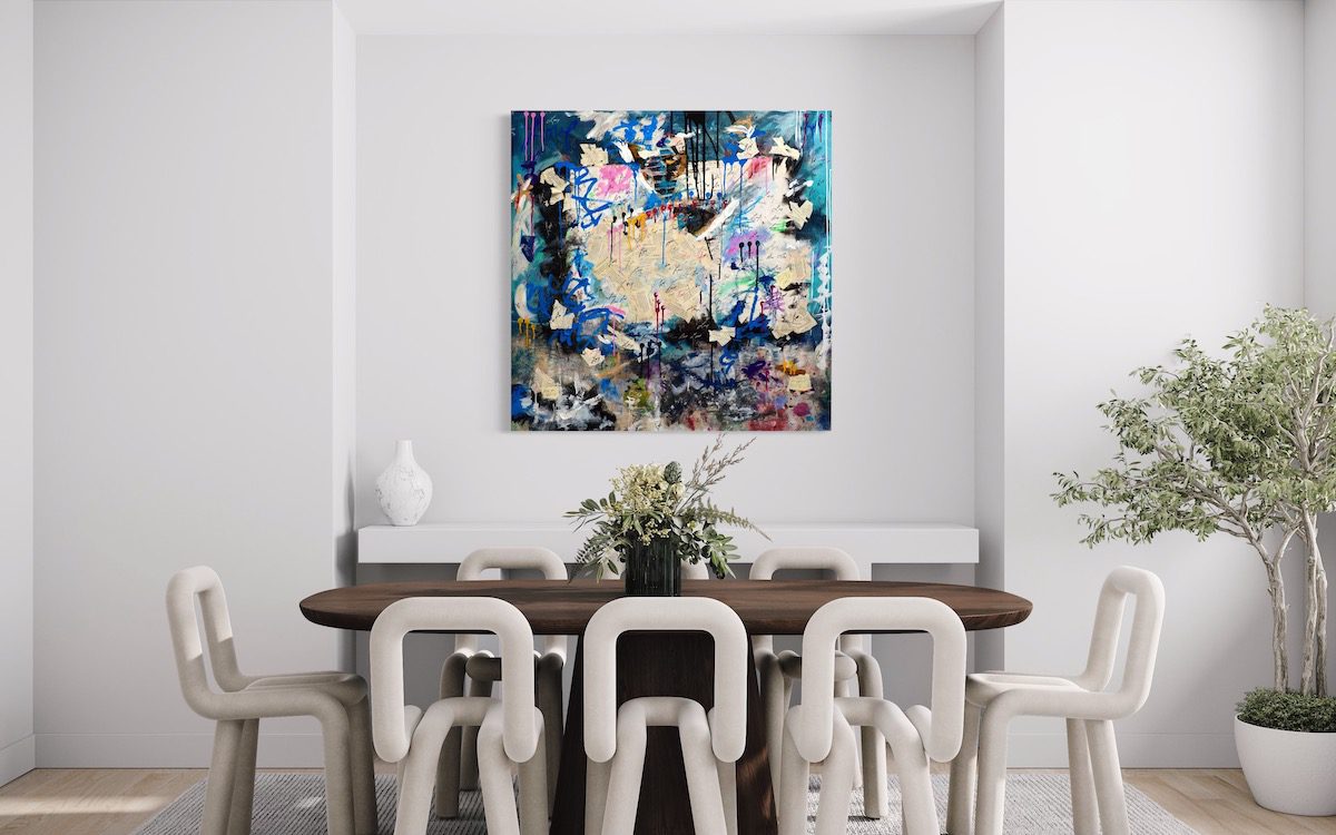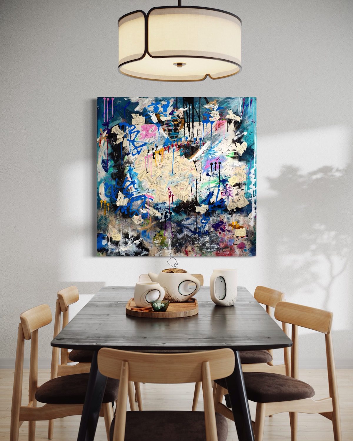 “Be Happy” by Amanza Smith is a work teeming with a blend of colors and forms that evoke a sense of controlled chaos. The background is a blend of blues and grays, overlaid with bursts of white, pink, and blue brushstrokes that create a sense of movement and depth. Prominent throughout the canvas are vertical drips and scattered splashes in colors ranging from deep purple to bright yellow, suggesting rain or cascading light. The pages included in the work are derived from the artist’s own writing which she titled “On Being Happy”.