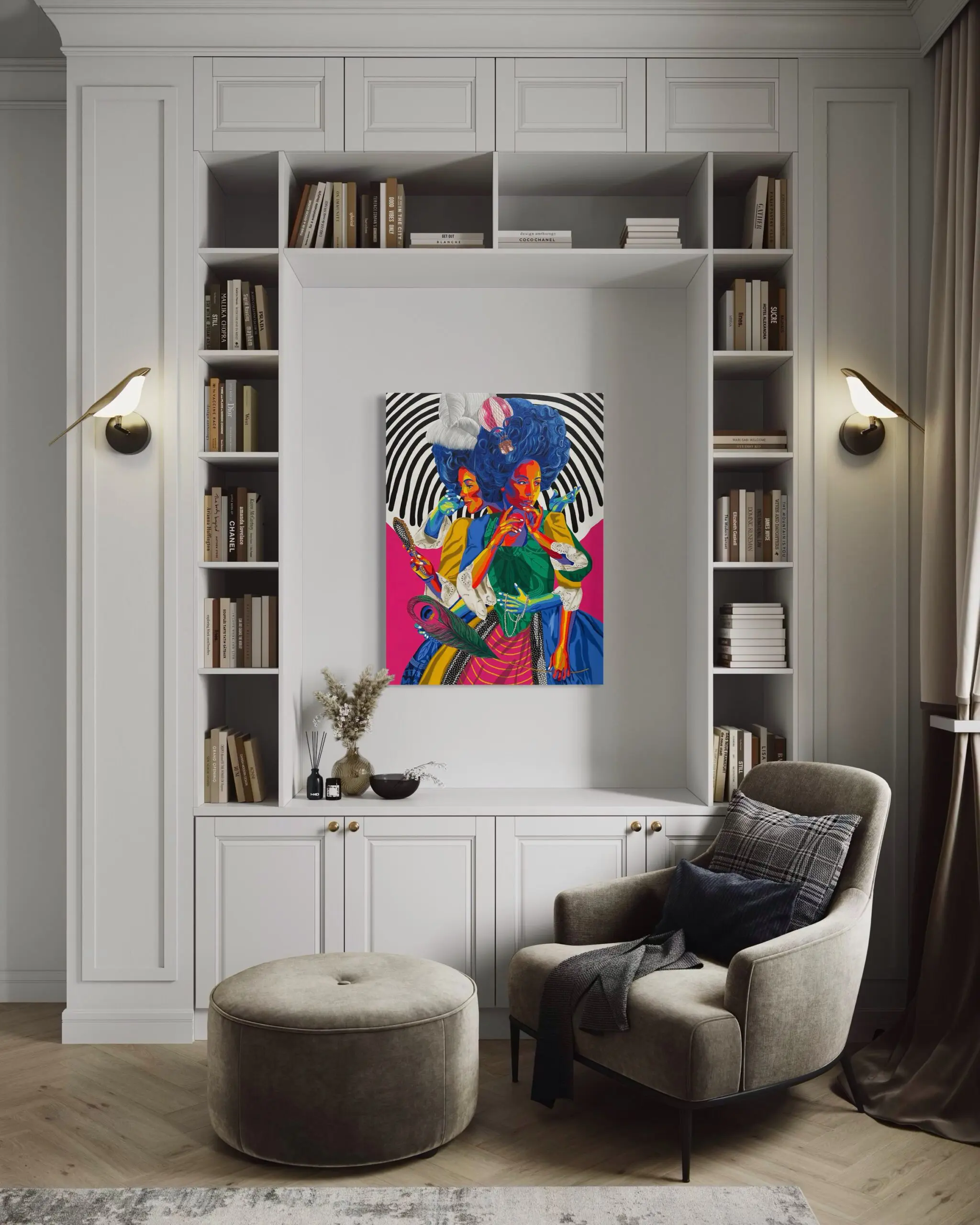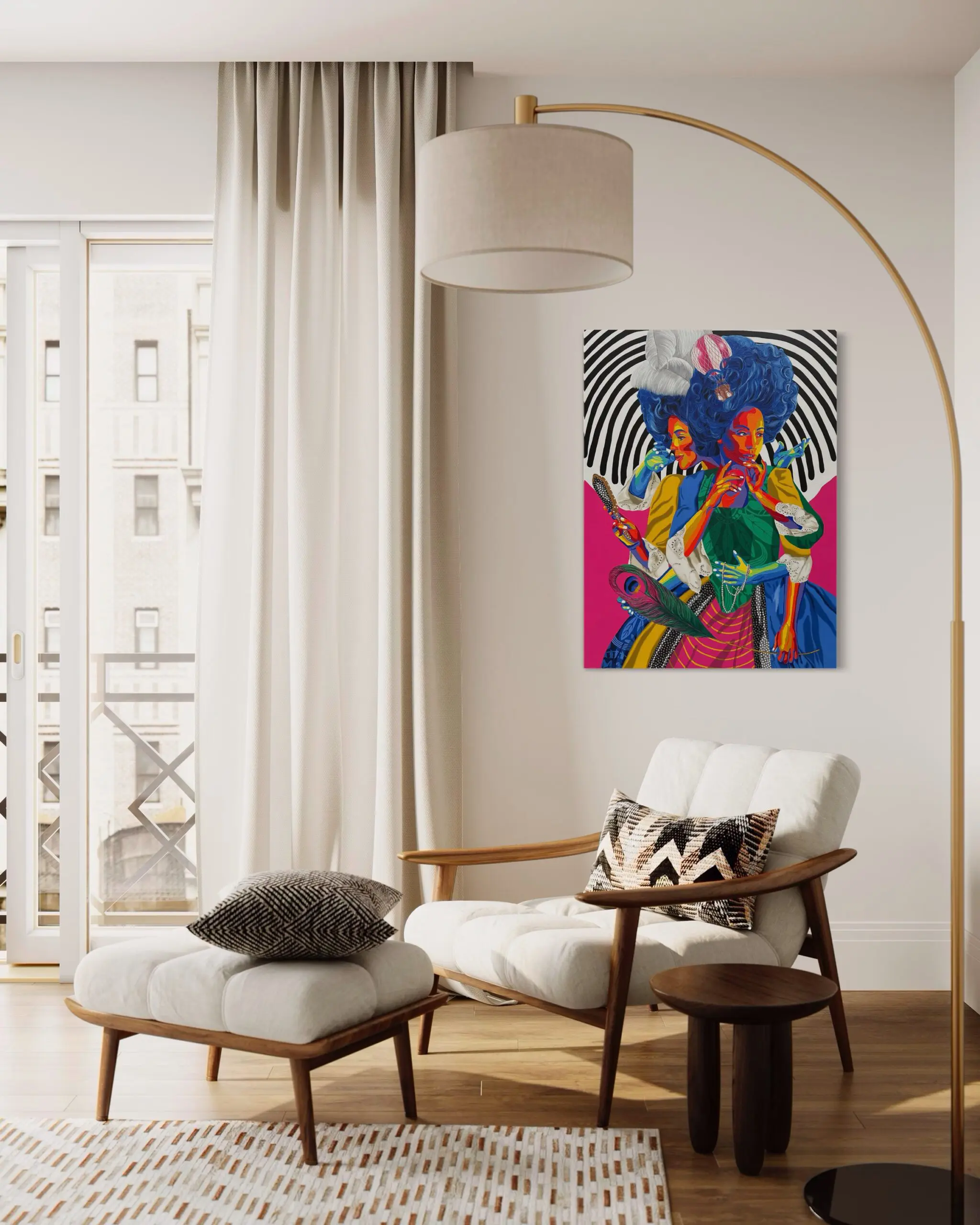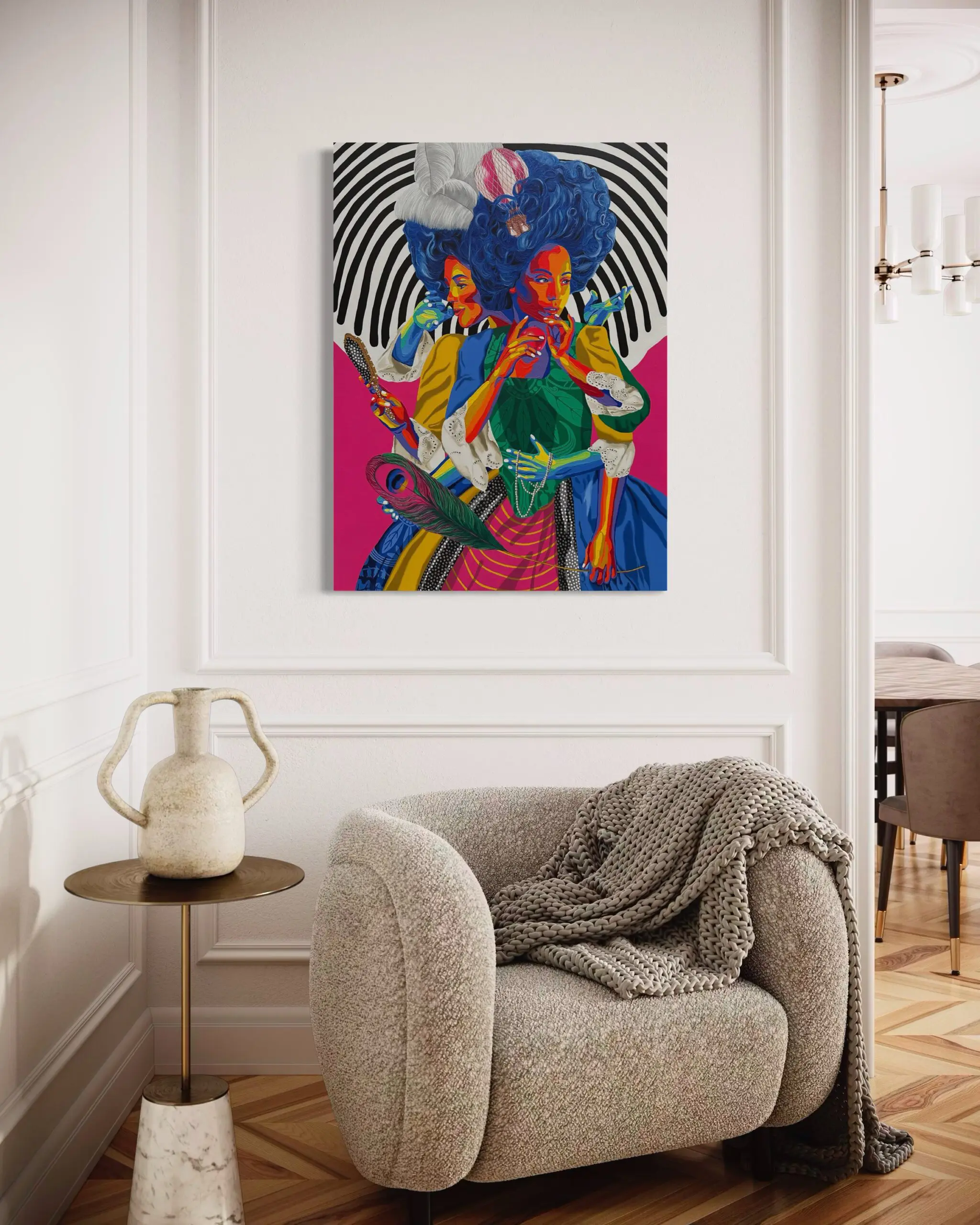 This vivid work speaks to femininity as ceremony, the labor behind elegance, and the cultural structures that crown some bodies as worthy of display. It radiates energy and drama, inviting viewers to explore themes of beauty, identity, and performance while celebrating the fearless use of color and form.