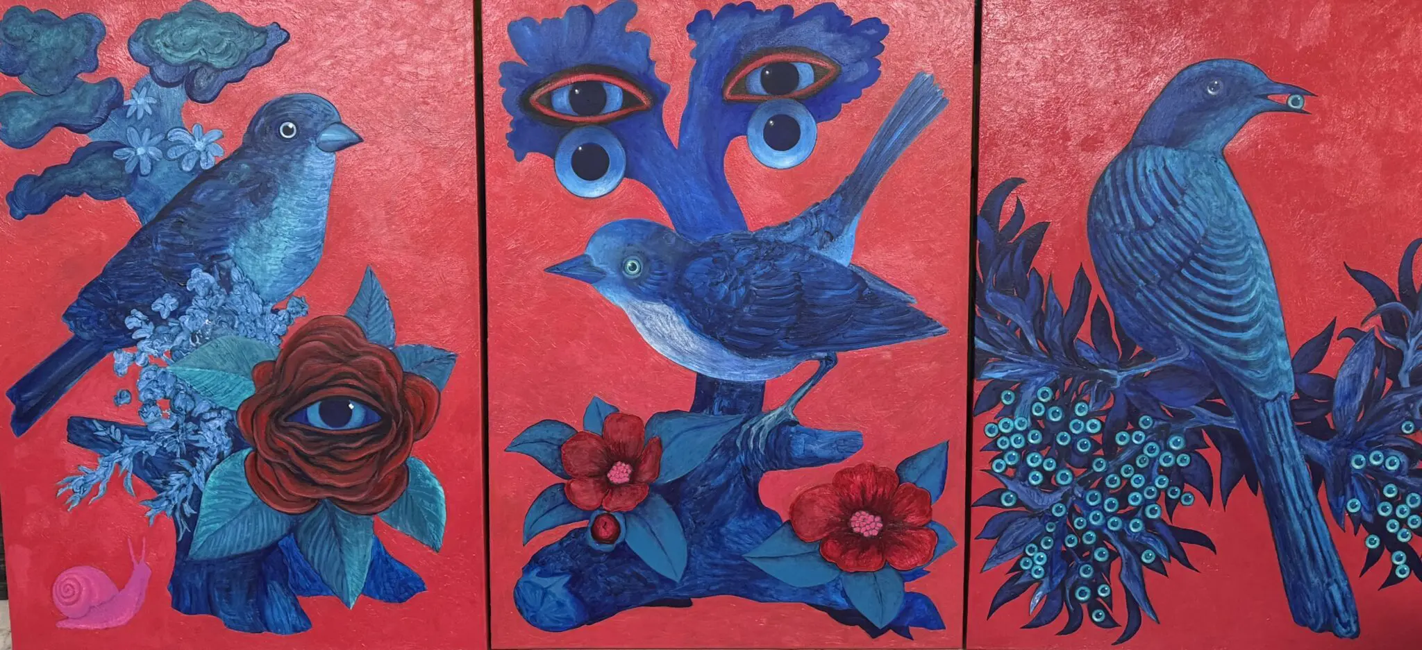 Radovanovic’s “Bird Circuit” is a surrealist triptych, where natural symbolism and metaphysical inquiry converge to create a world of heightened perception and unseen connections. The bold contrast between deep blue avian figures and an intense, fiery red background generates an immediate, almost hypnotic visual impact, drawing the viewer into a realm where nature, mystery, and consciousness intertwine.