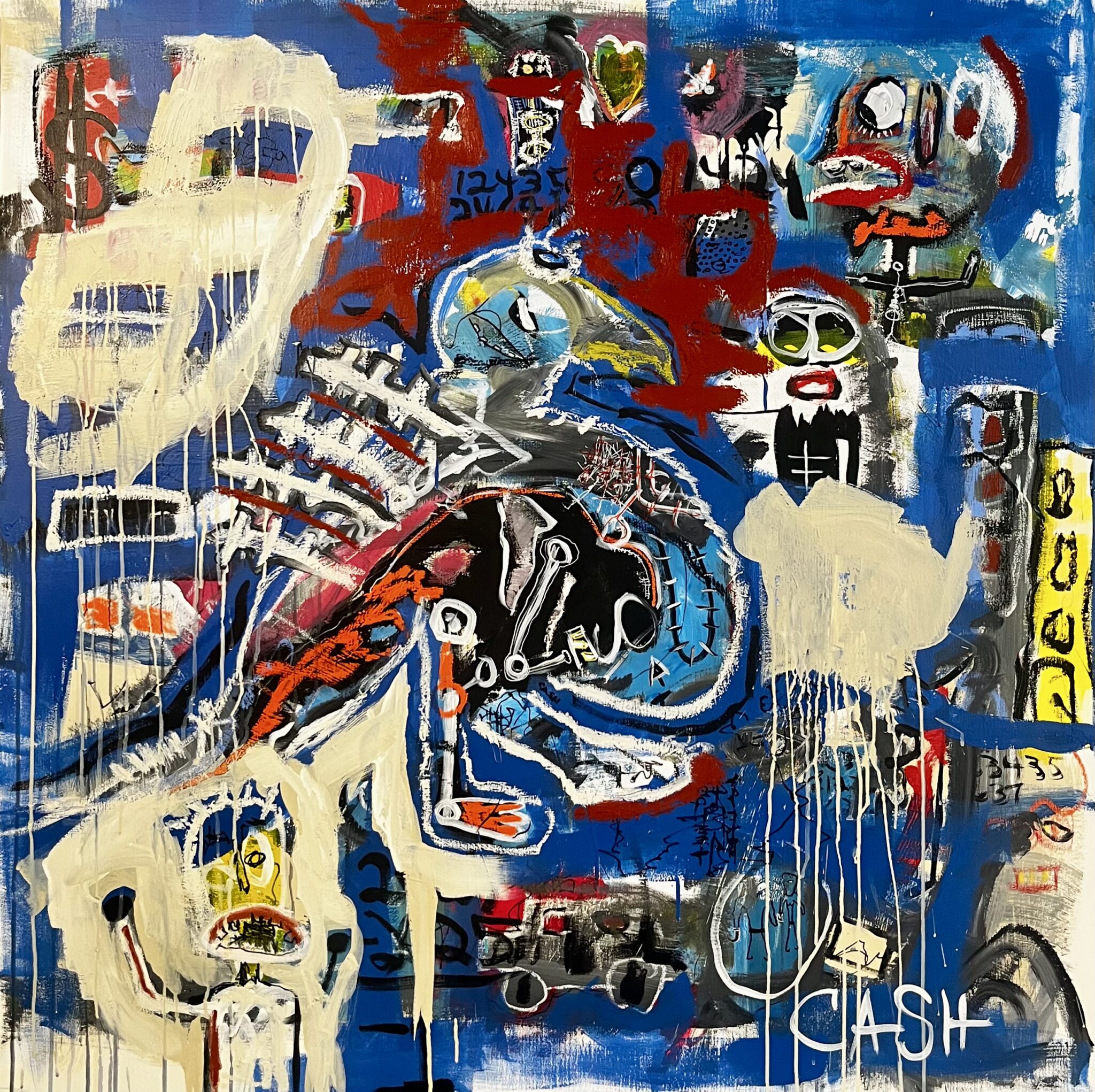 “Birthday” by emerging contemporary artist Cash Christopher is a bold mixed media painting that channels the rebellious spirit of 1980s neo-expressionism while bringing forward a uniquely modern voice. This piece stands out within today’s landscape of urban art and emotional abstract art, with its vivid color palette, graffiti-style marks, and frenetic brushwork that feel both instinctual and deeply considered.