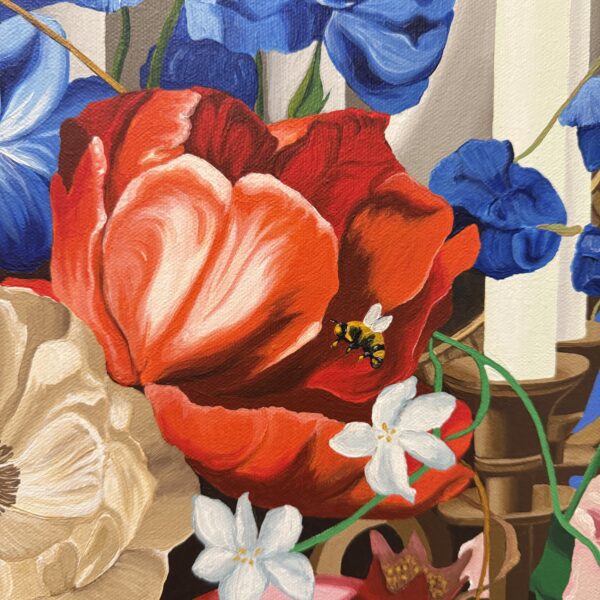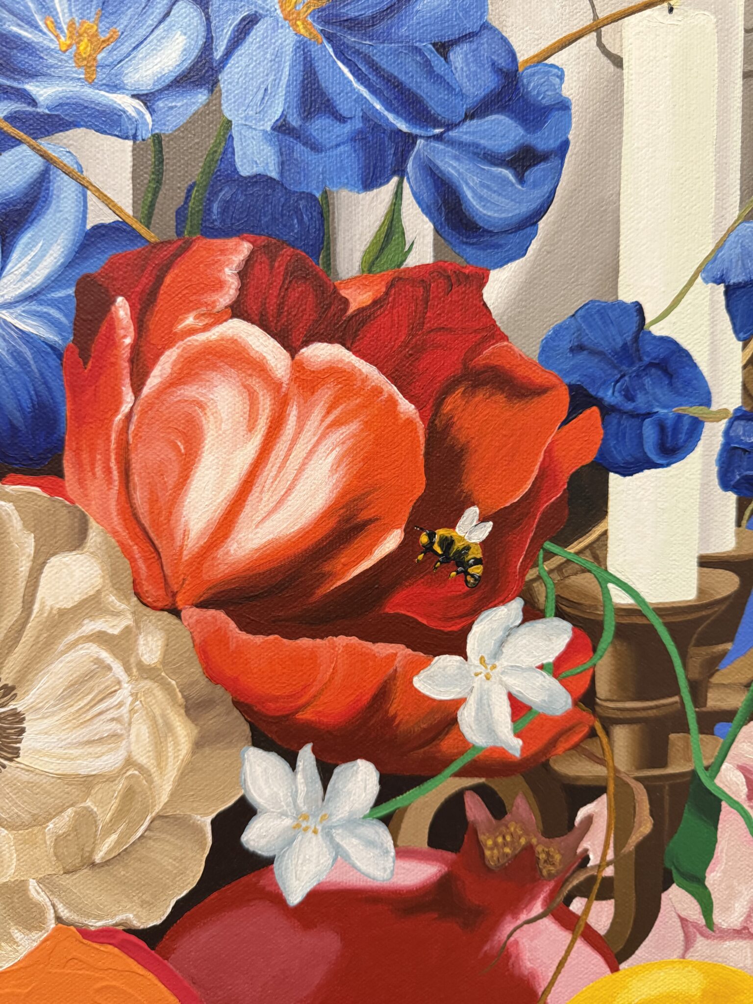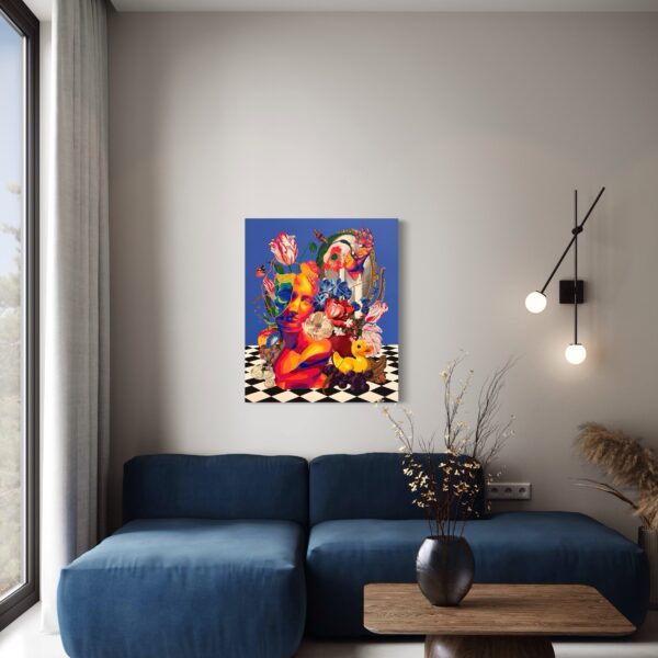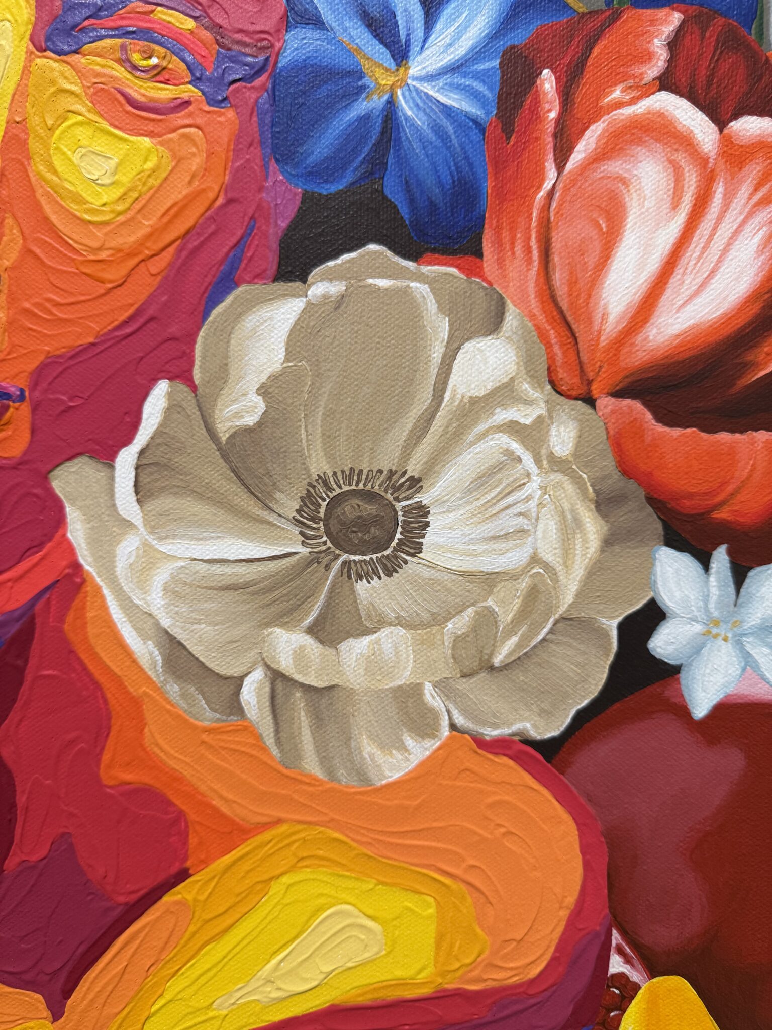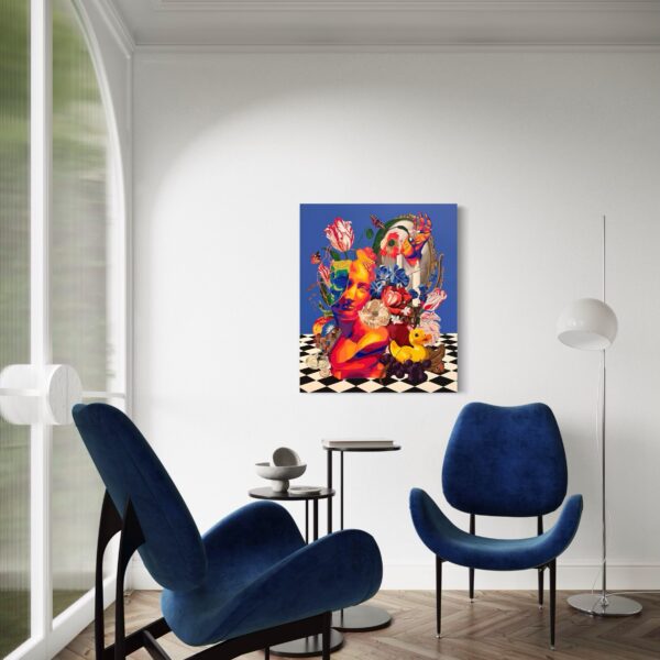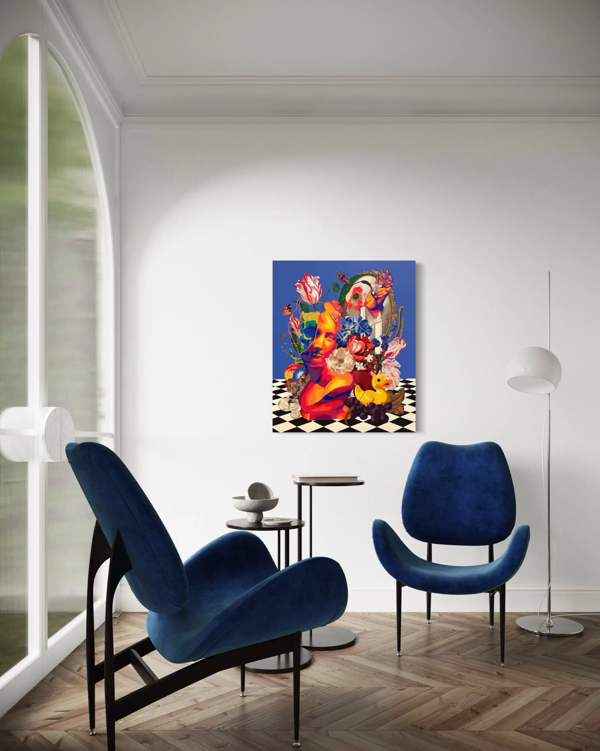 Kumar’s meticulous precision, high-contrast color palette, and sharp surrealist juxtapositions make Vanitas Reimagined a contemporary meditation on identity, excess, and the fluidity of meaning in a world overflowing with symbols. At once a celebration and a warning, this piece is a visually stunning and deeply philosophical work that invites the viewer to consider what is real, what is fleeting, and what is merely illusion.
