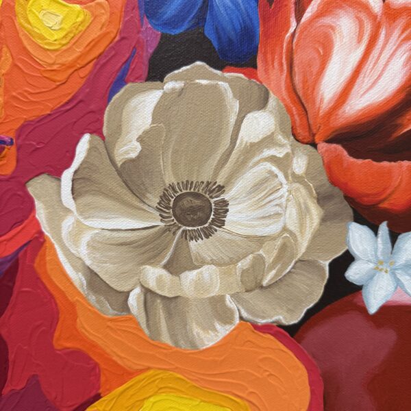 Keerthana Kumar’s latest work is a riotous collision of art history, symbolism, and contemporary surrealism, presenting a modern reinterpretation of the traditional vanitas—a genre historically associated with themes of mortality, fleeting beauty, and material excess. Here, however, Kumar subverts tradition, injecting an electrifying palette and layered iconography that pull the viewer into a sensory overload of life, decay, and transformation.