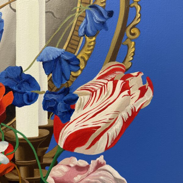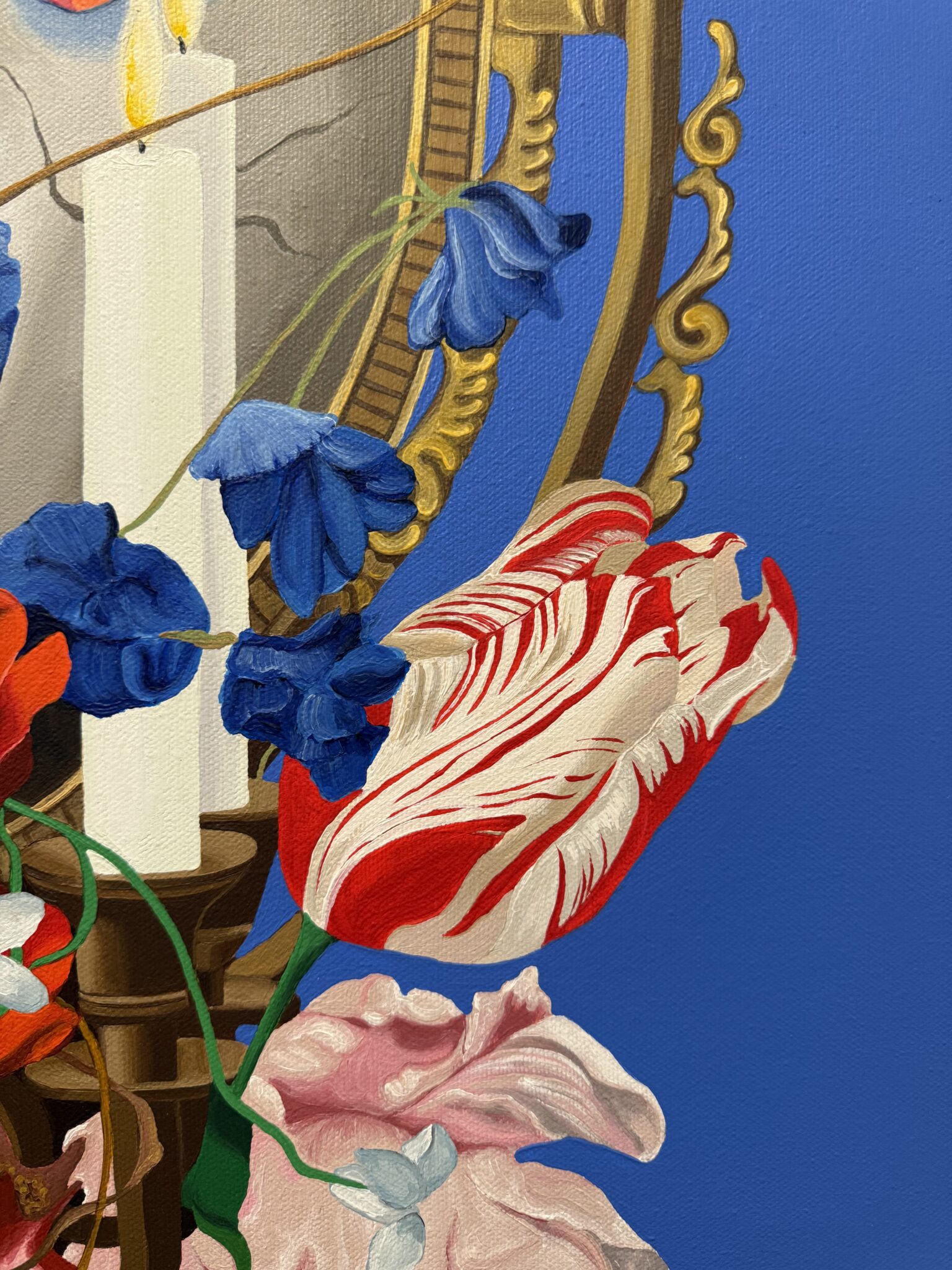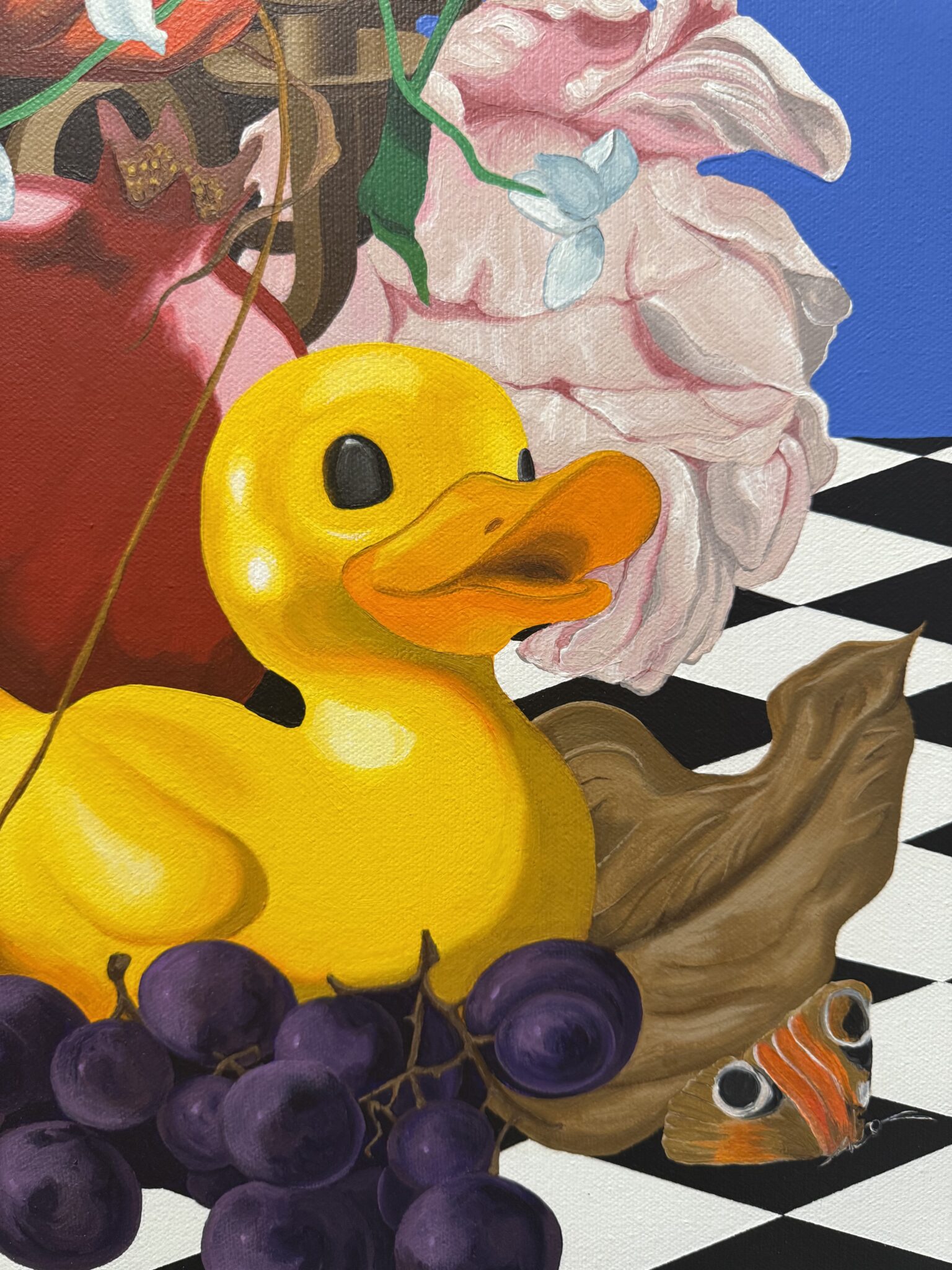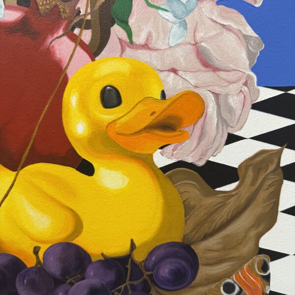 Each object within the composition carries its own narrative weight—a melting candle, a distorted mirror reflecting a deconstructed face, and a bright yellow rubber duck, a jarring yet playful presence among the abundance of luxurious blooms and ripe fruit. Butterflies hover, reinforcing the idea of metamorphosis, while the hand, stretched toward the mirror, suggests a desperate grasp at identity, time, or memory. The contrast between historical references and pop culture relics underscores the tension between artifice and authenticity, permanence and impermanence.