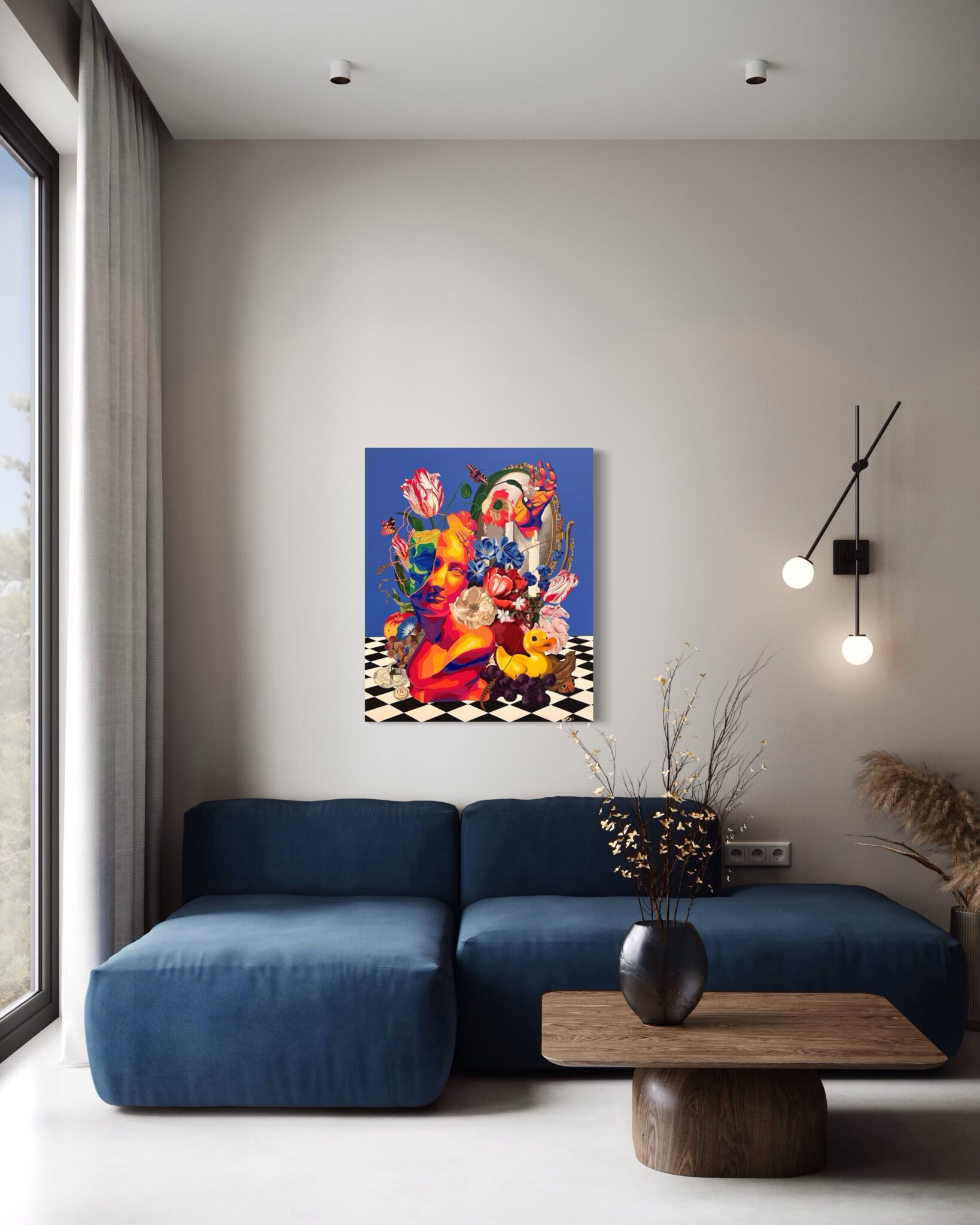 At the composition’s center, a fragmented classical bust, painted in Kumar’s signature prismatic color blocking, dissolves into a tangle of flora and dreamlike elements. The smooth, eternal quality of sculpture is disrupted, giving way to a more organic, living mass of flowers, vines, and symbolic objects that seem to sprout from its very being. The surrounding checkerboard floor, a motif often used to represent duality and perspective, anchors the scene in a dreamscape that feels both calculated and chaotic.