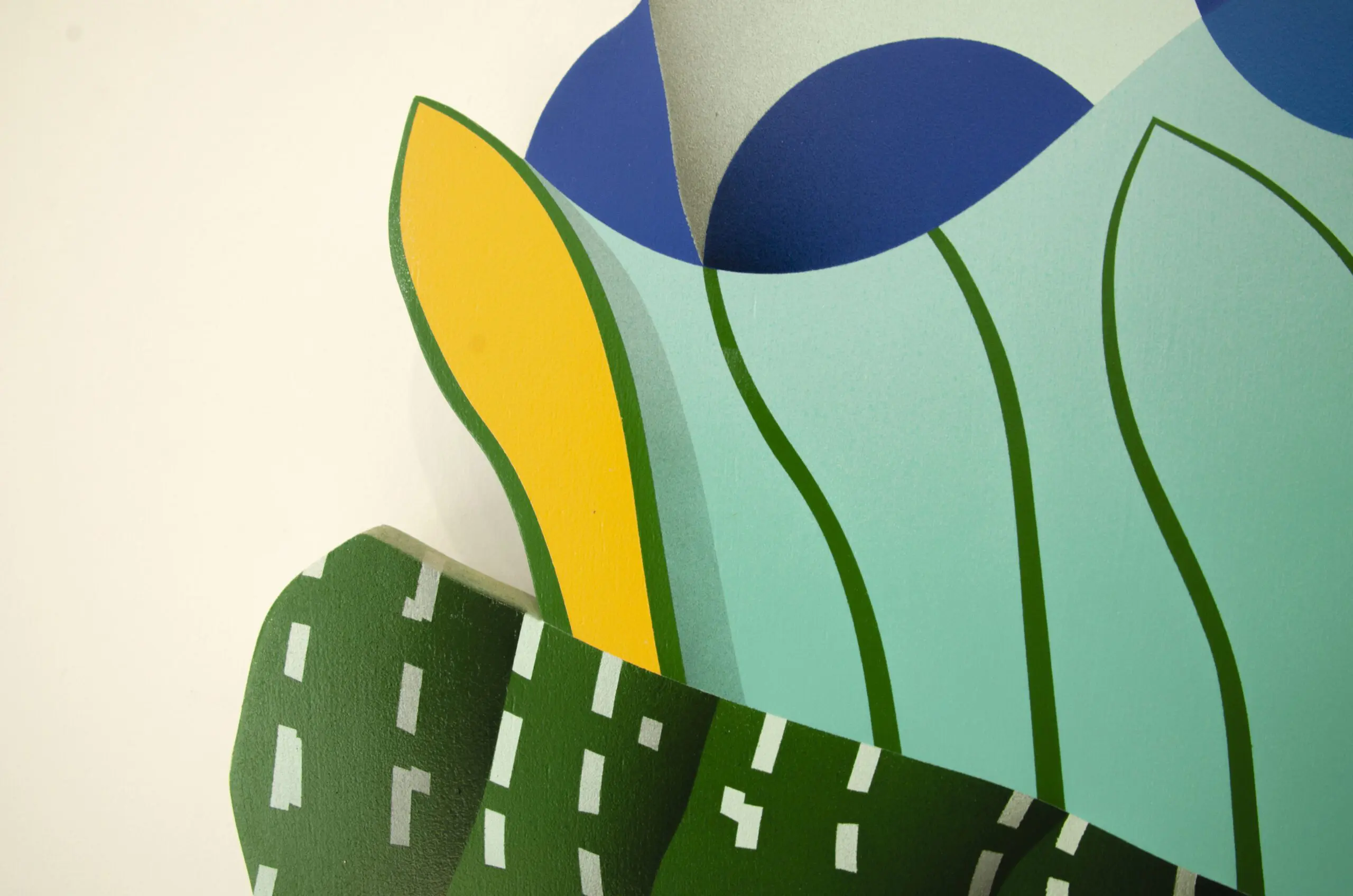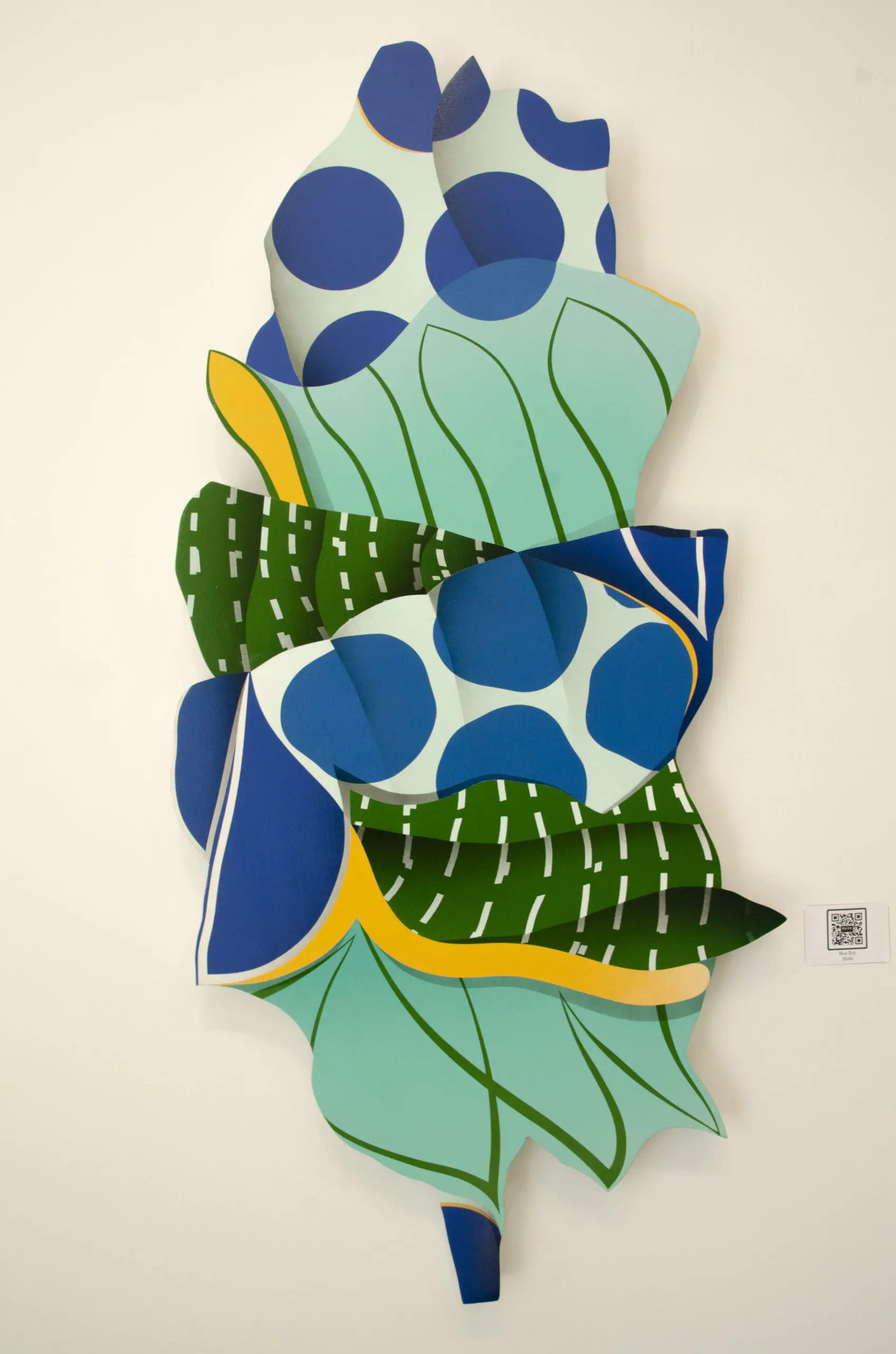 Blending artistic mediums, DUAL utilizes aerosol to create ‘Blue Dot’ on wood panel. Lively blue circular motifs dance across the composition, united with vibrant orange and deep shades of green lurking beneath the surface, engendering a sense of concealed complexity. White strokes artfully mimic the dynamism of street lines, creating subtle urban undertones in this union of varied mediums.