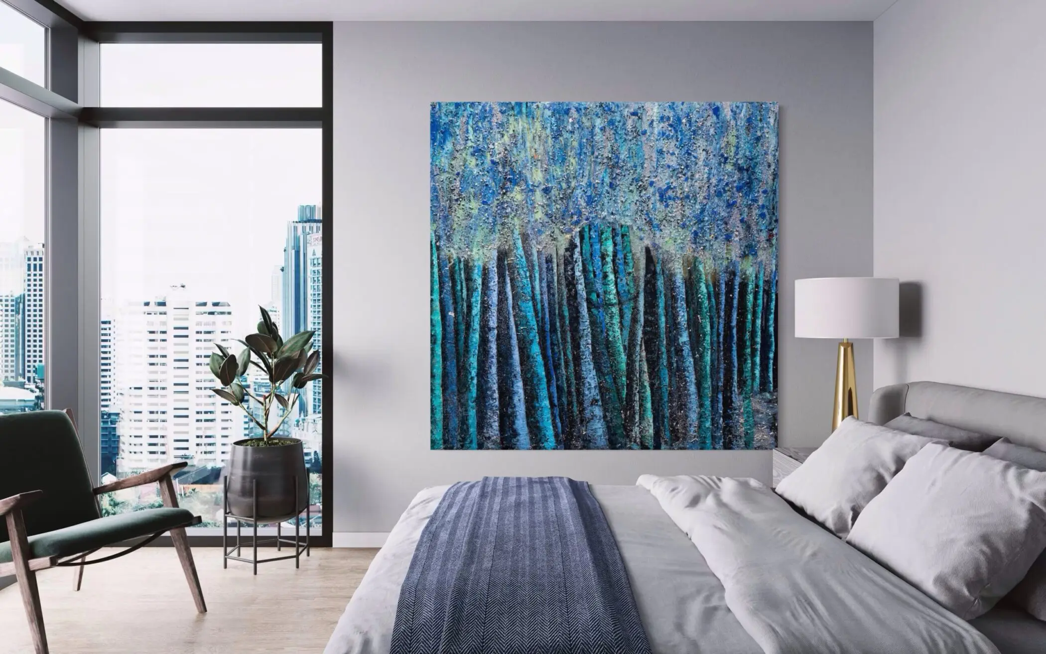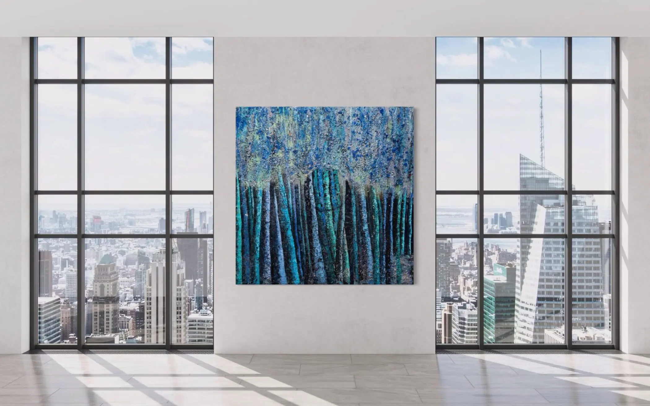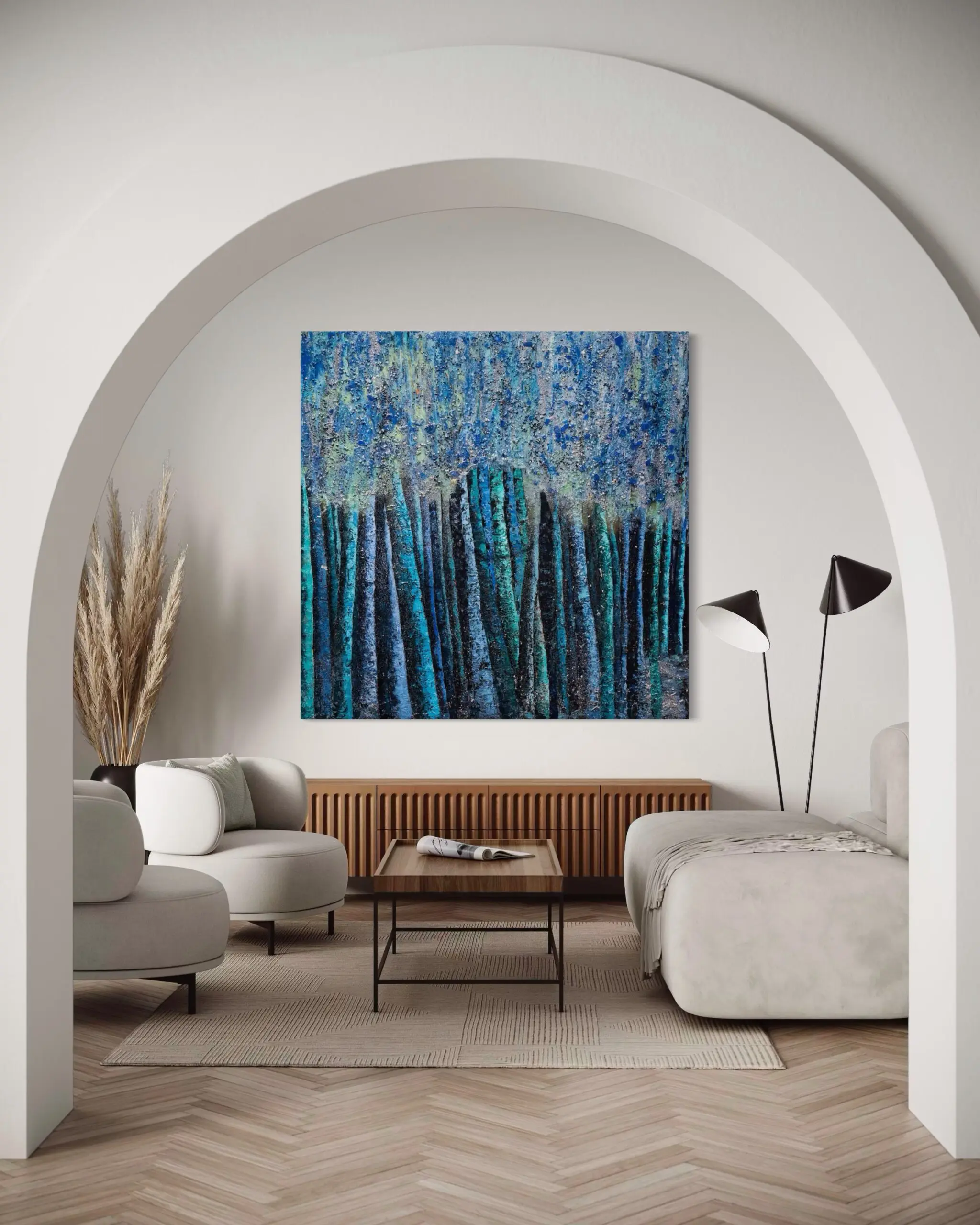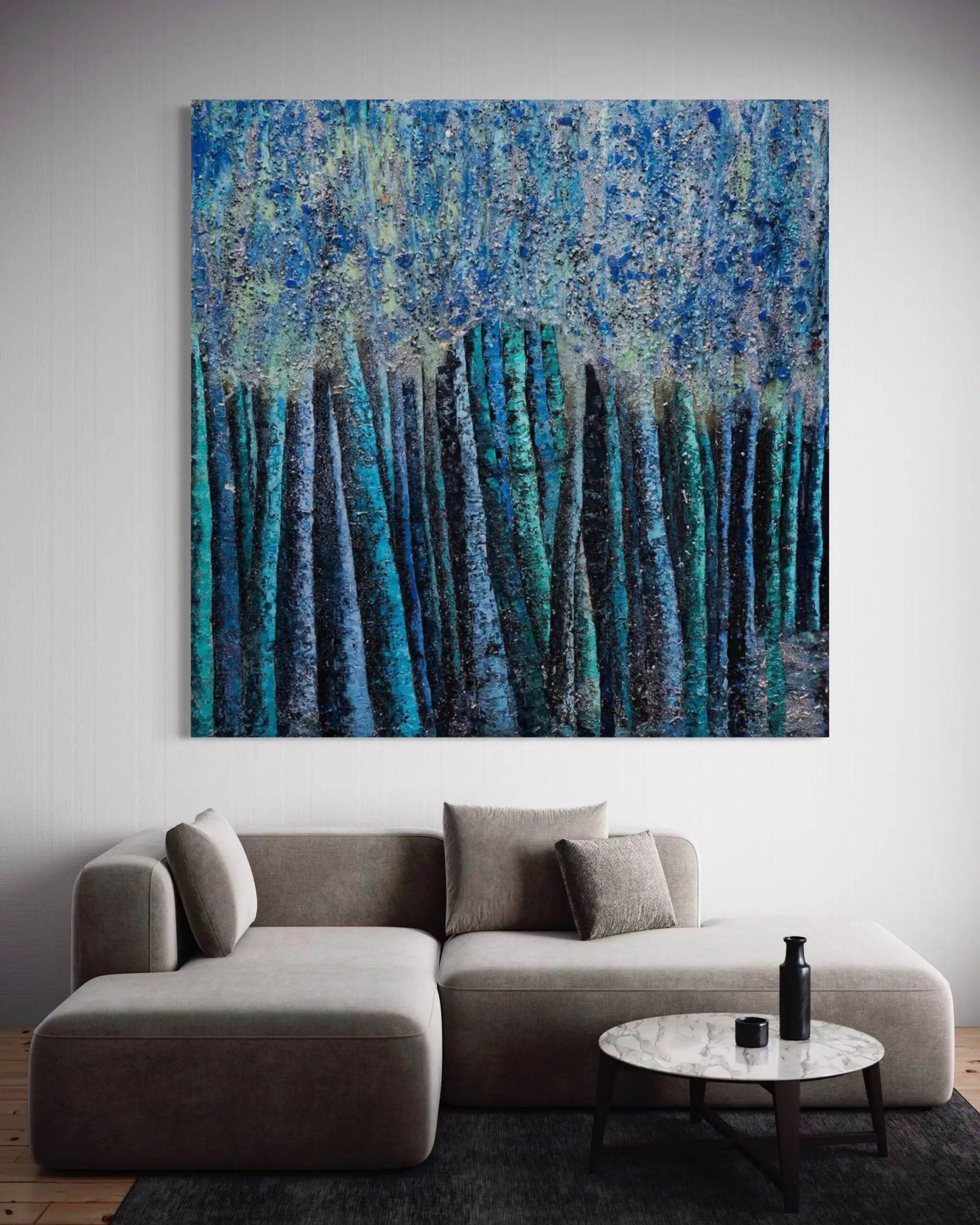 At the heart of “Blue Moon” lies a delicate tension between abstraction and representation. While the vertical forms clearly suggest a wooded landscape, the expressive interplay of light and shadow transforms the scene into an emotional landscape—one of solitude, introspection, and nocturnal mystery. The upper portion of the composition shimmers with a cosmic luminescence, where moonlight filters through the dense canopy, casting a spectral glow that enhances the work’s dreamlike presence.