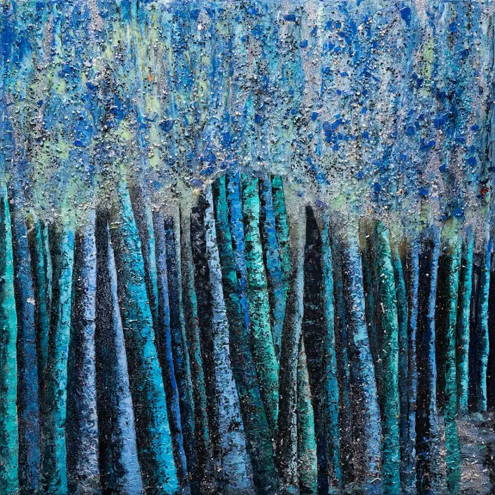 Mashian’s “Blue Moon” is an immersive, texturally rich mixed-media work that blurs the boundaries between painting and sculpture, enveloping the viewer in the ethereal quietude of a moonlit forest. Through a cool, atmospheric palette of deep blues, aquamarines, and silvery hues, Mashian evokes the meditative stillness of nature bathed in celestial glow, transforming the canvas into a portal of dreamlike serenity.
