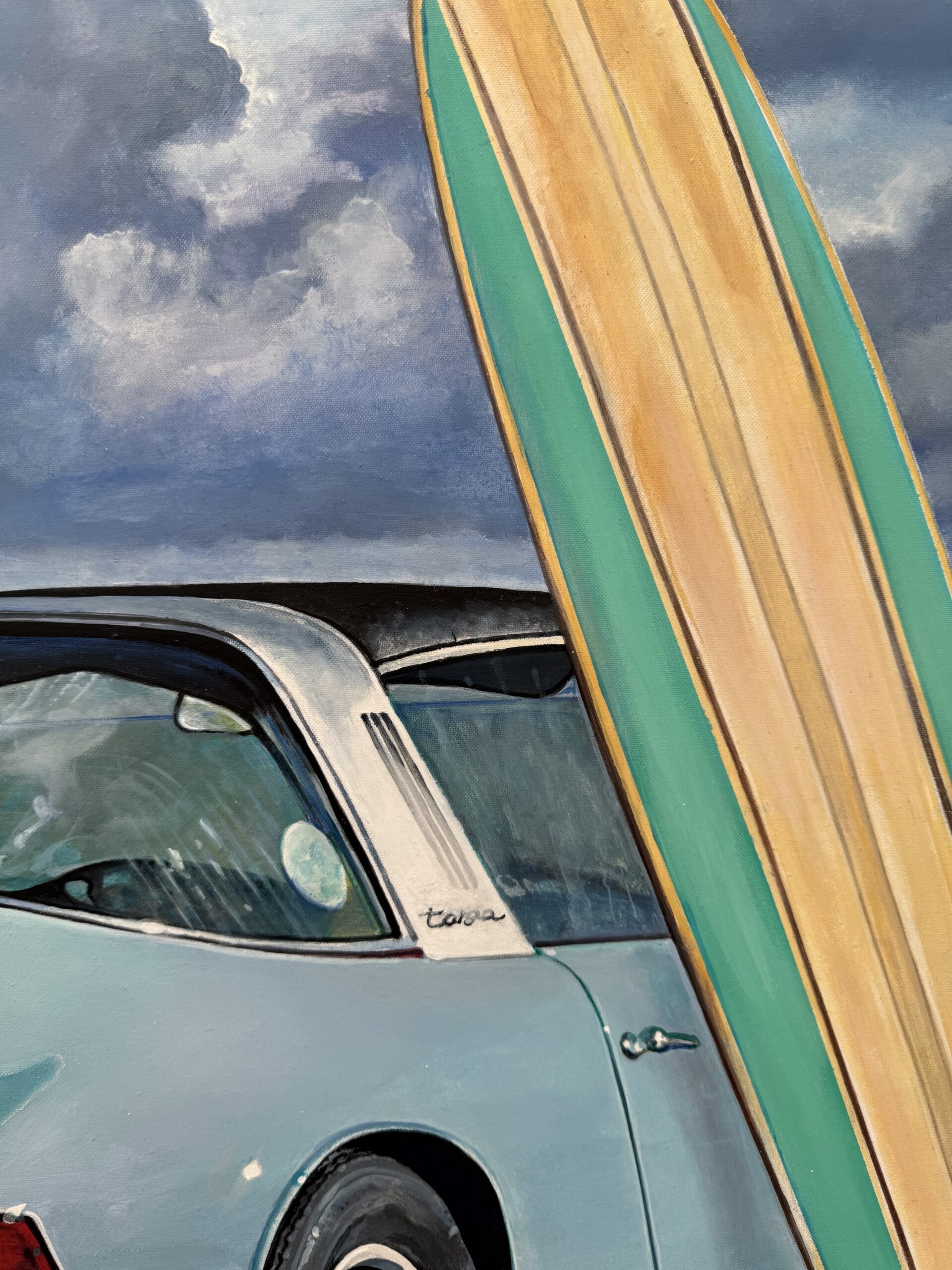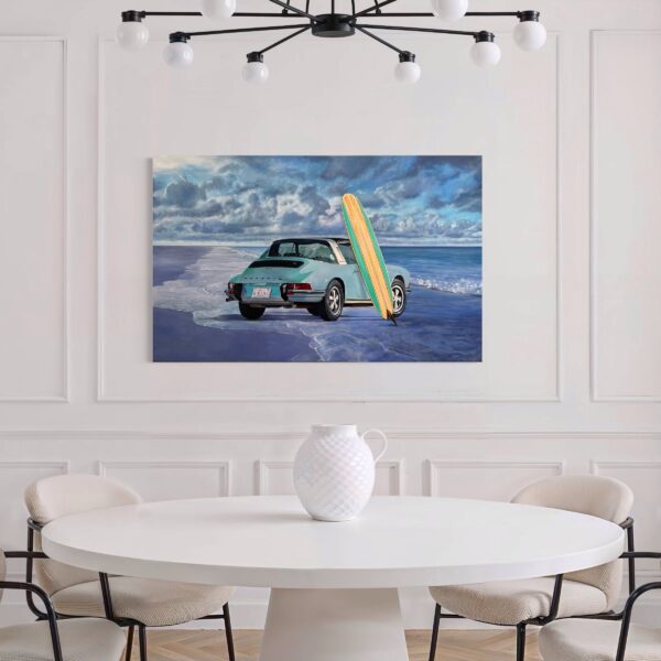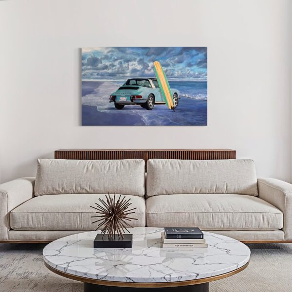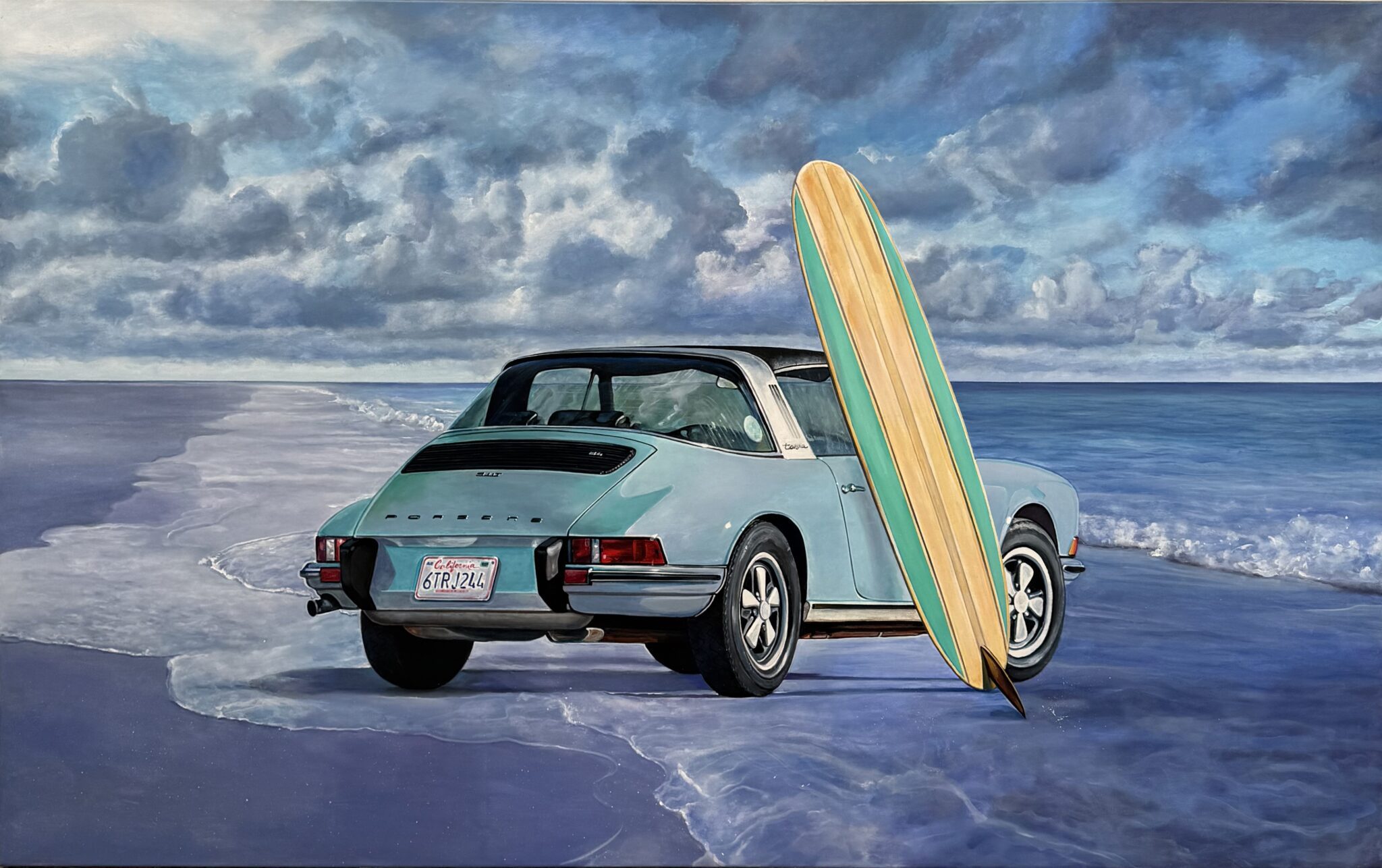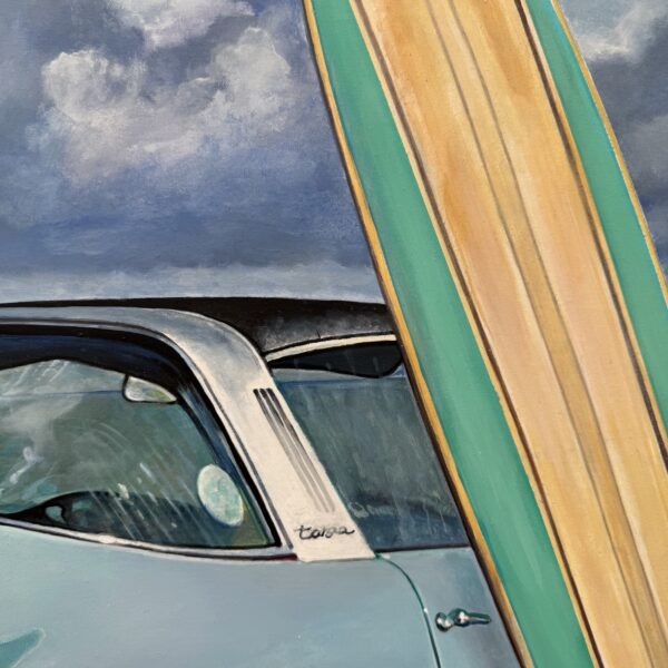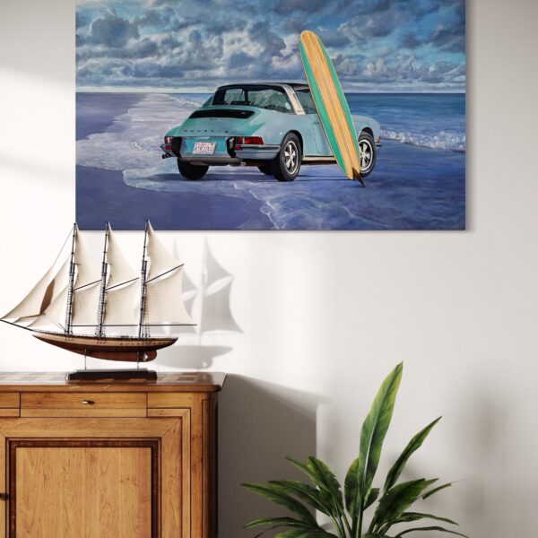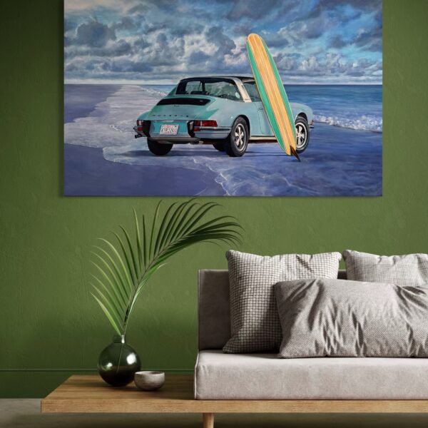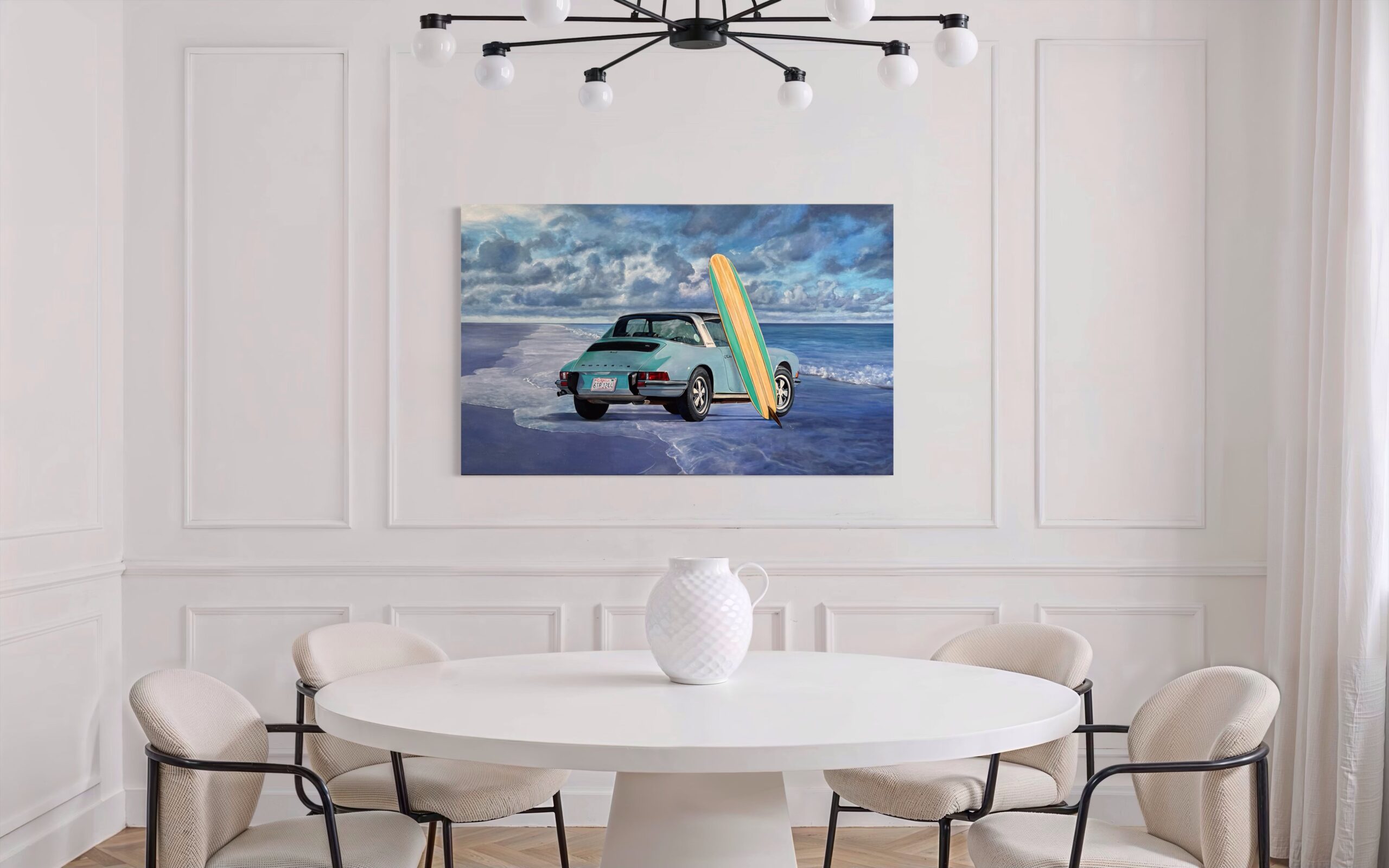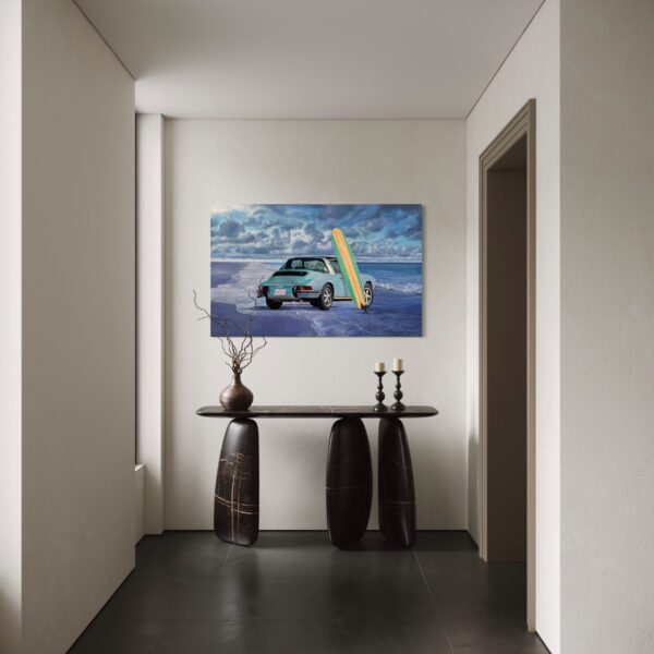 Marcello’s use of acrylic paint allows for both precision and vibrancy—each element is rendered with care, from the subtle reflections on the Porsche’s bodywork to the grain of the wooden surfboard and the gentle gradations of the sea and sky. The sandy shore and rolling tide form a calm, inviting backdrop, creating a composition that feels both nostalgic and timeless.