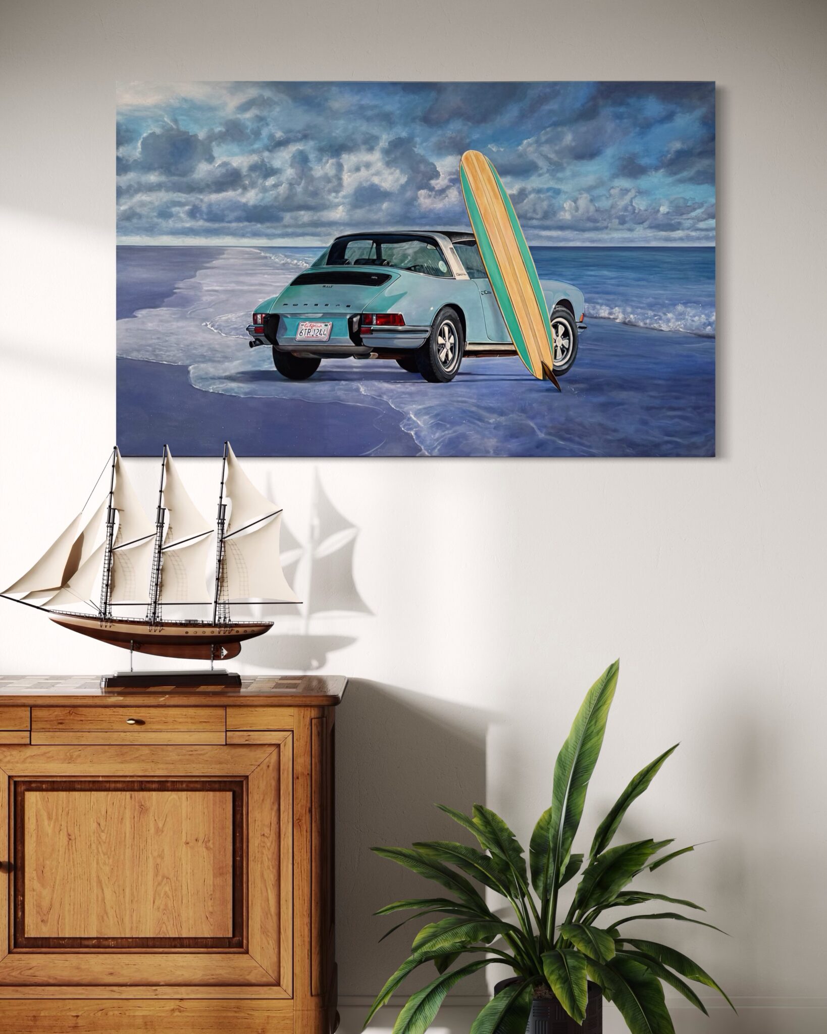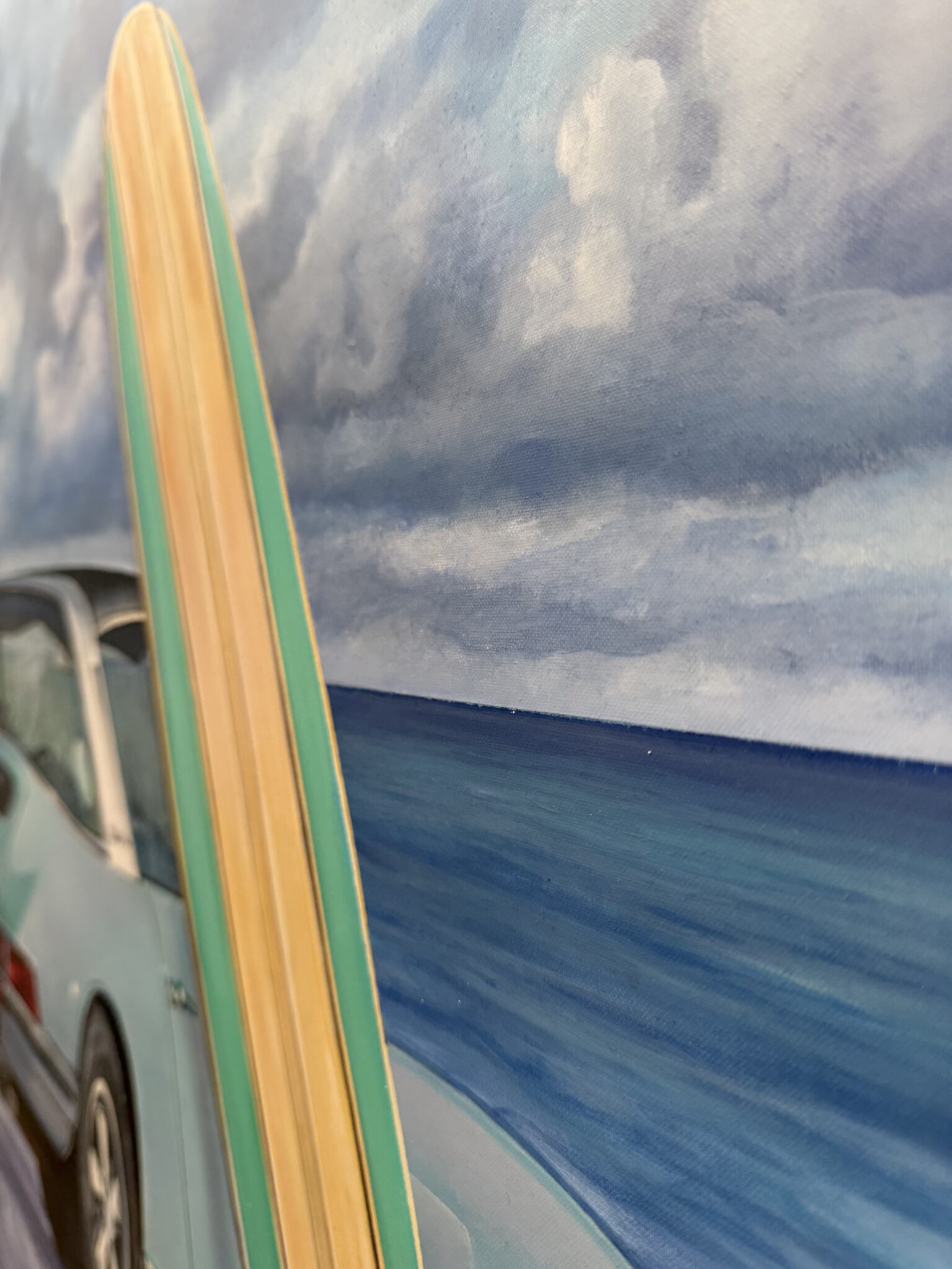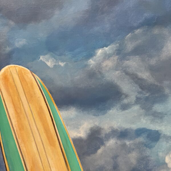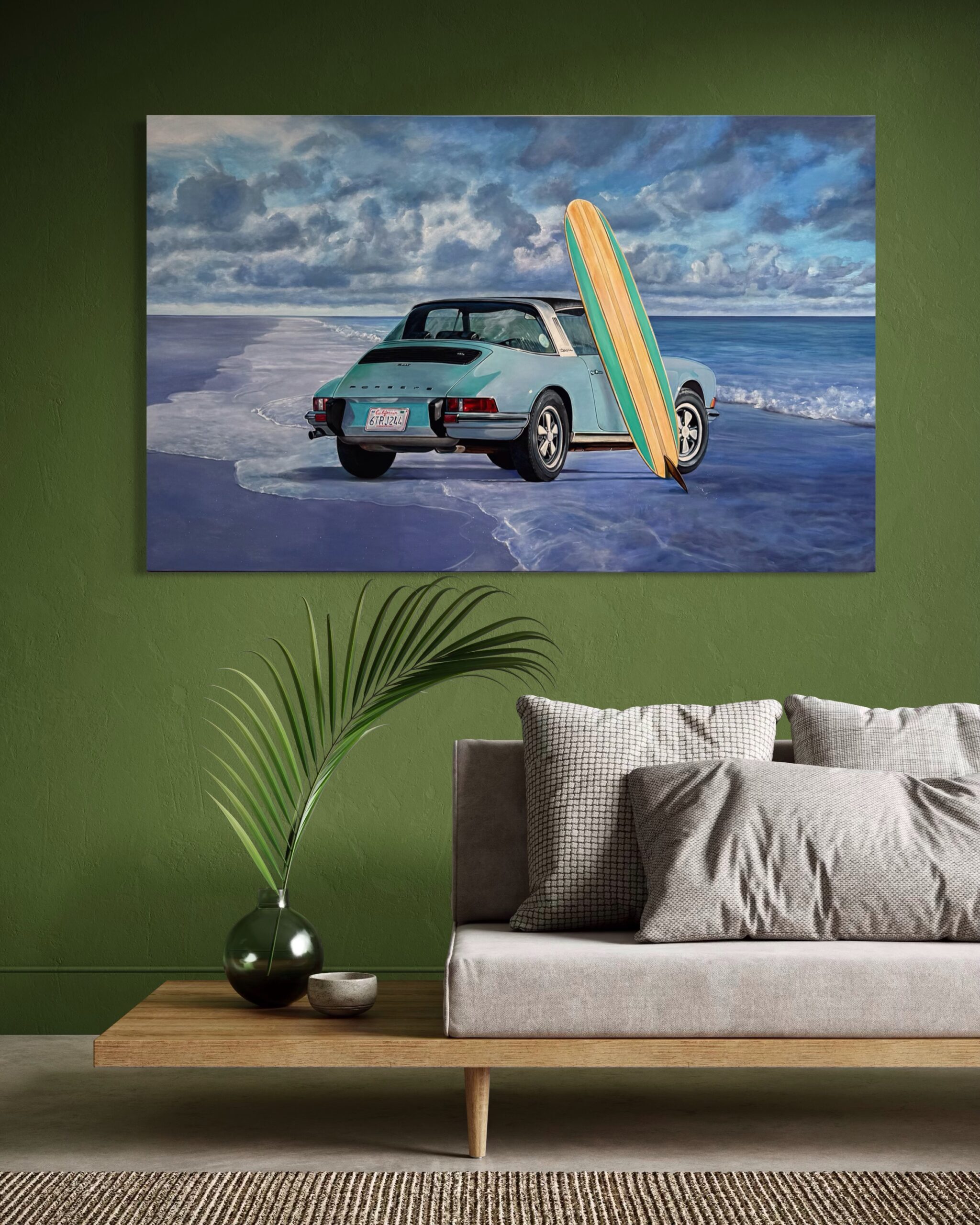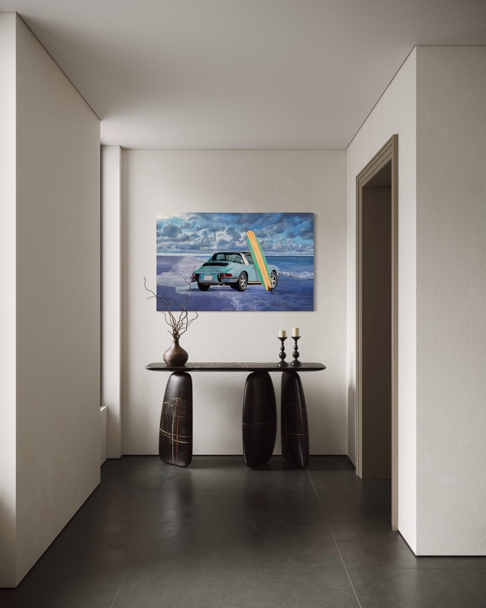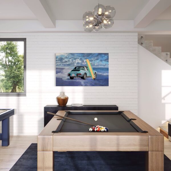 Marcello’s use of acrylic paint allows for both precision and vibrancy—each element is rendered with care, from the subtle reflections on the Porsche’s bodywork to the grain of the wooden surfboard and the gentle gradations of the sea and sky. The sandy shore and rolling tide form a calm, inviting backdrop, creating a composition that feels both nostalgic and timeless.