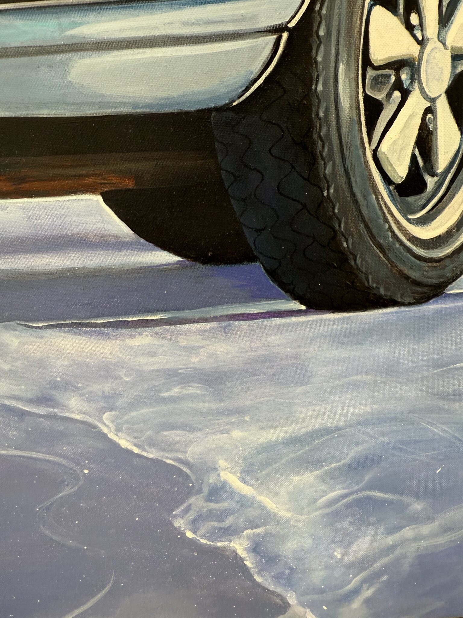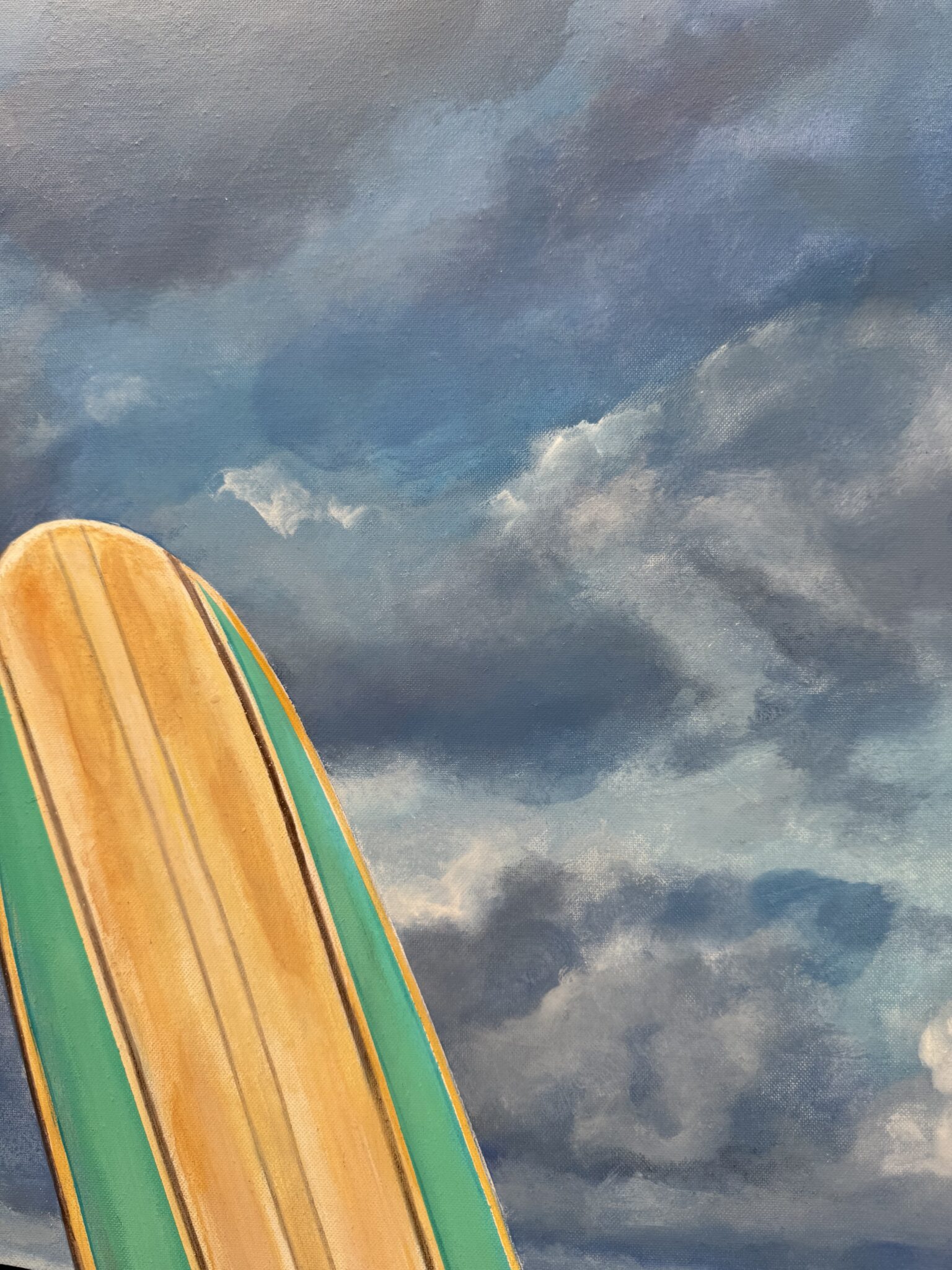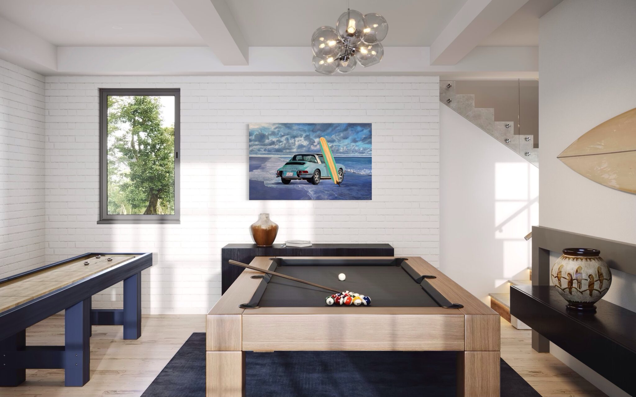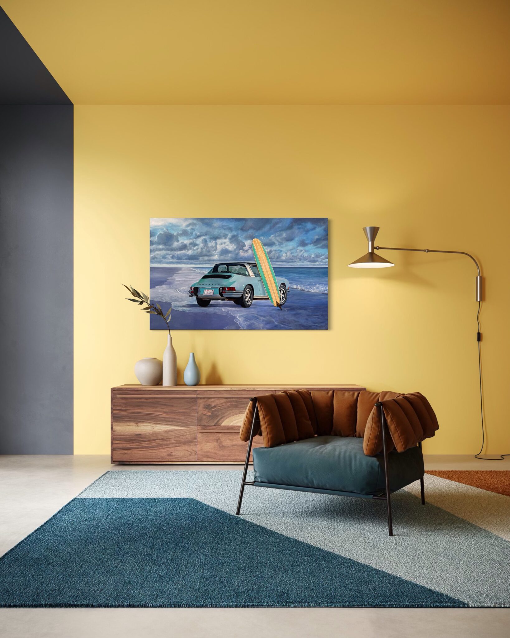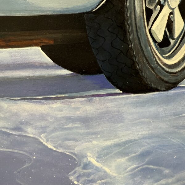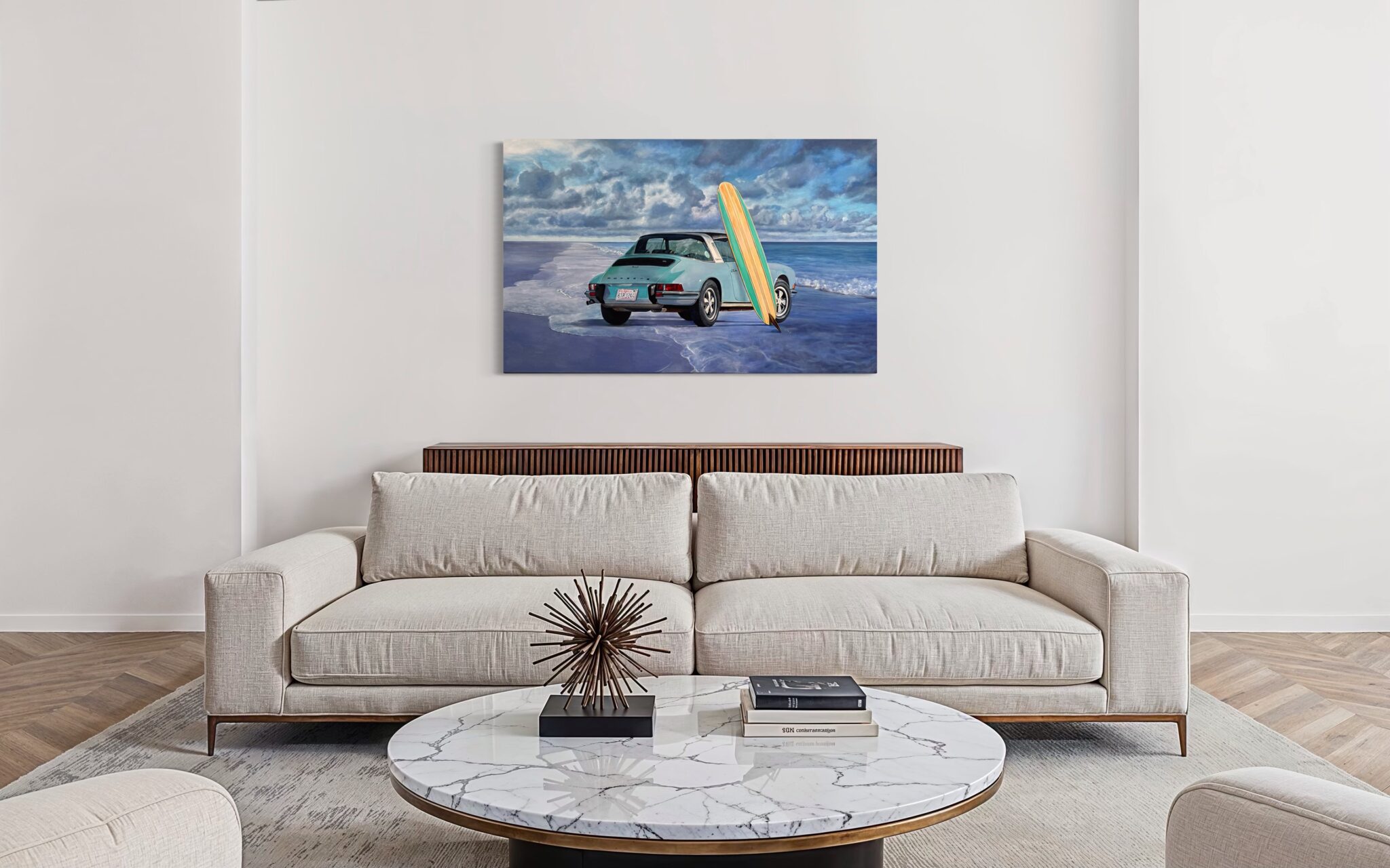 Marcello’s use of acrylic paint allows for both precision and vibrancy—each element is rendered with care, from the subtle reflections on the Porsche’s bodywork to the grain of the wooden surfboard and the gentle gradations of the sea and sky. The sandy shore and rolling tide form a calm, inviting backdrop, creating a composition that feels both nostalgic and timeless.
