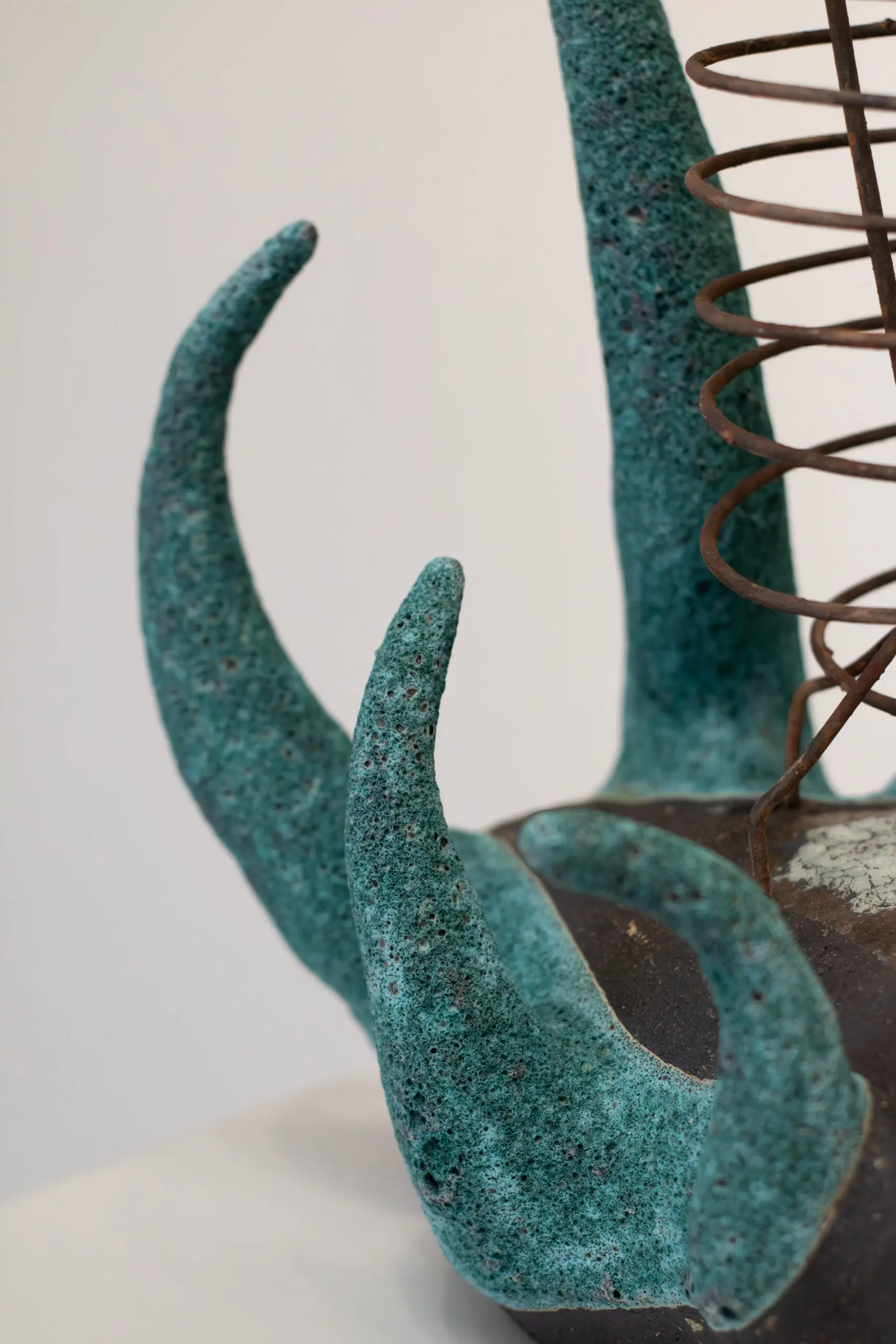 The sculpture contributes a three-dimensional interpretation of rhythm through repetition, vertical movement, and spatial balance. The coil establishes a steady visual cadence. The ceramic forms interrupt and redirect the rhythm, creating a dynamic exchange between control and emergence.