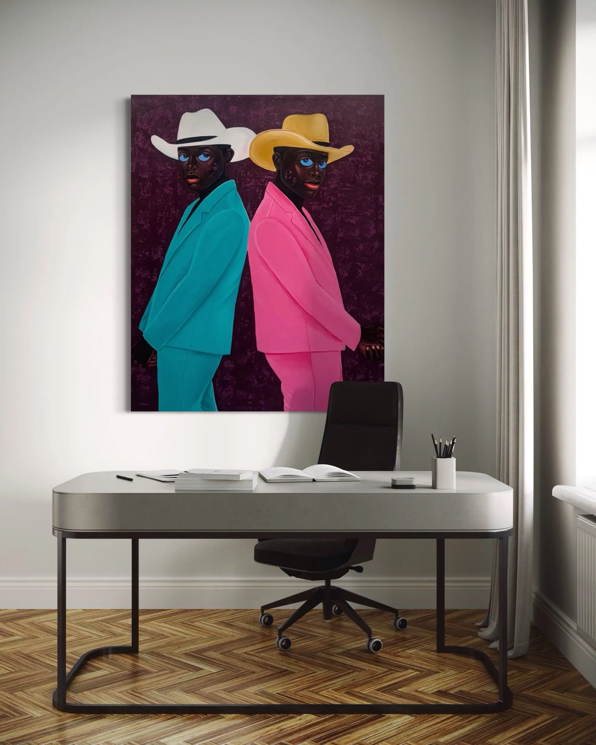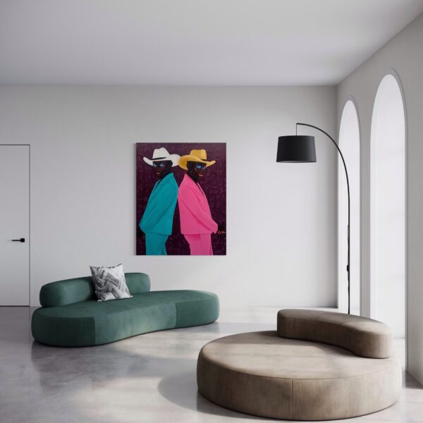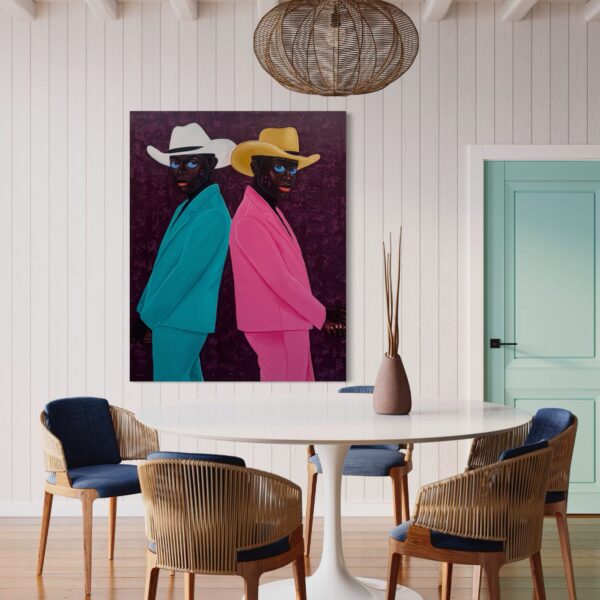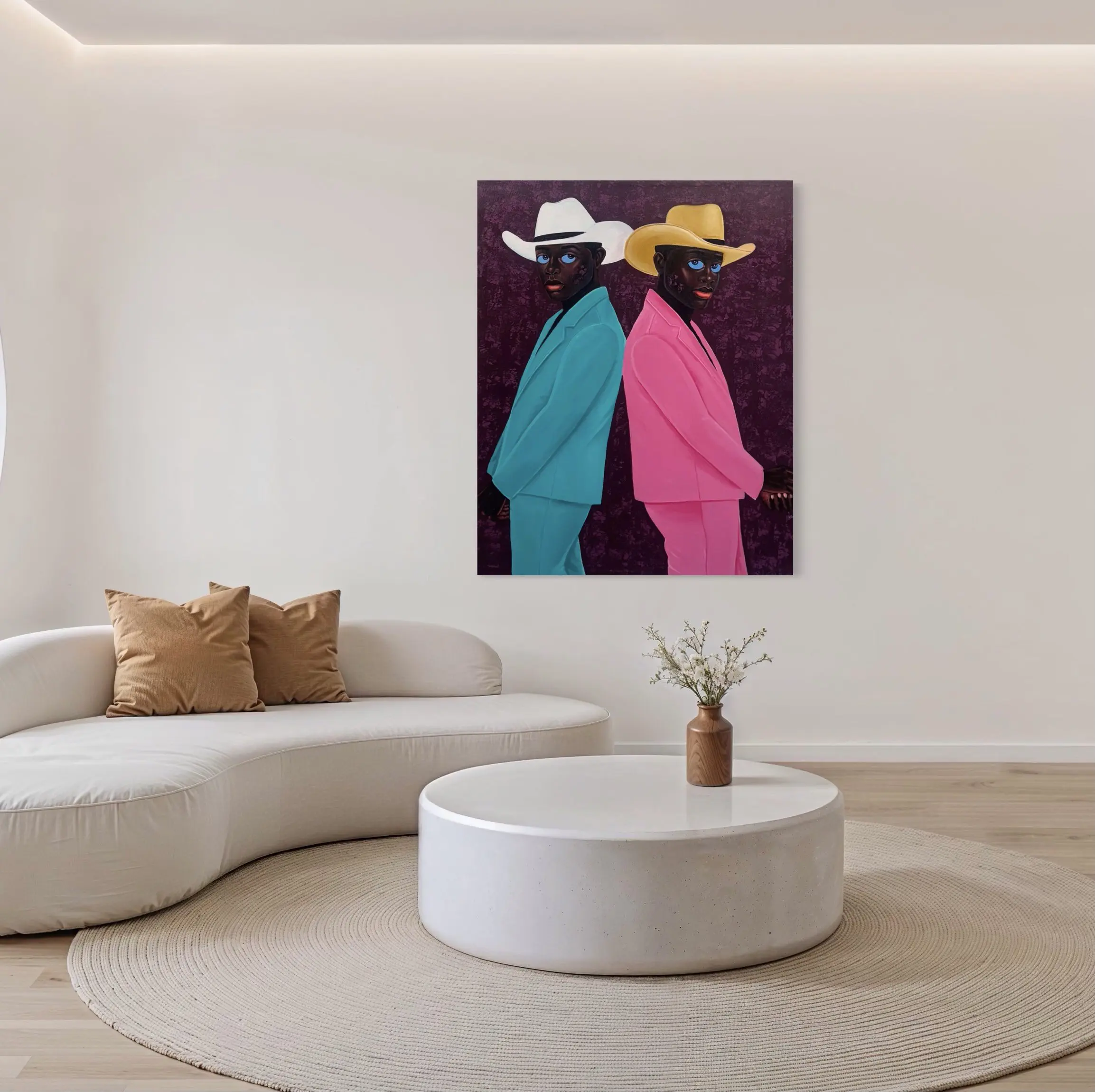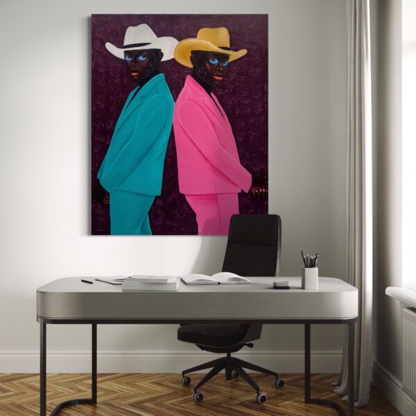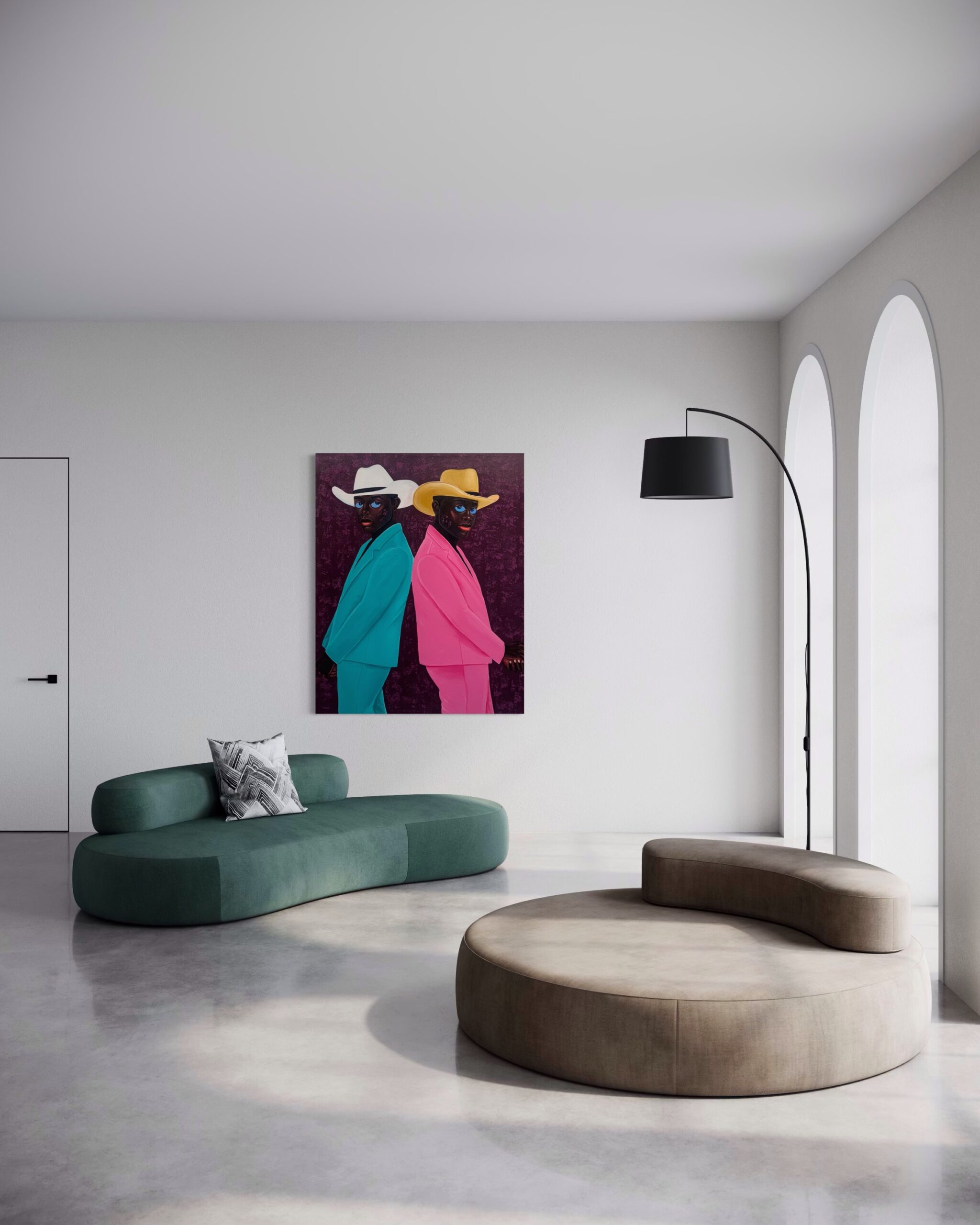 Two men stand back-to-back, their mirrored poses creating both tension and harmony. One is dressed in a vibrant turquoise suit paired with a crisp white cowboy hat, while the other wears a bold pink suit topped with a golden hat. Their piercing blue eyes — a defining signature of Philip Letsu’s paintings — anchor the composition, engaging the viewer with a gaze that feels both direct and enigmatic. The deep plum background, richly textured, heightens the contrast of their colorful attire and frames the figures in a dramatic, timeless stage.